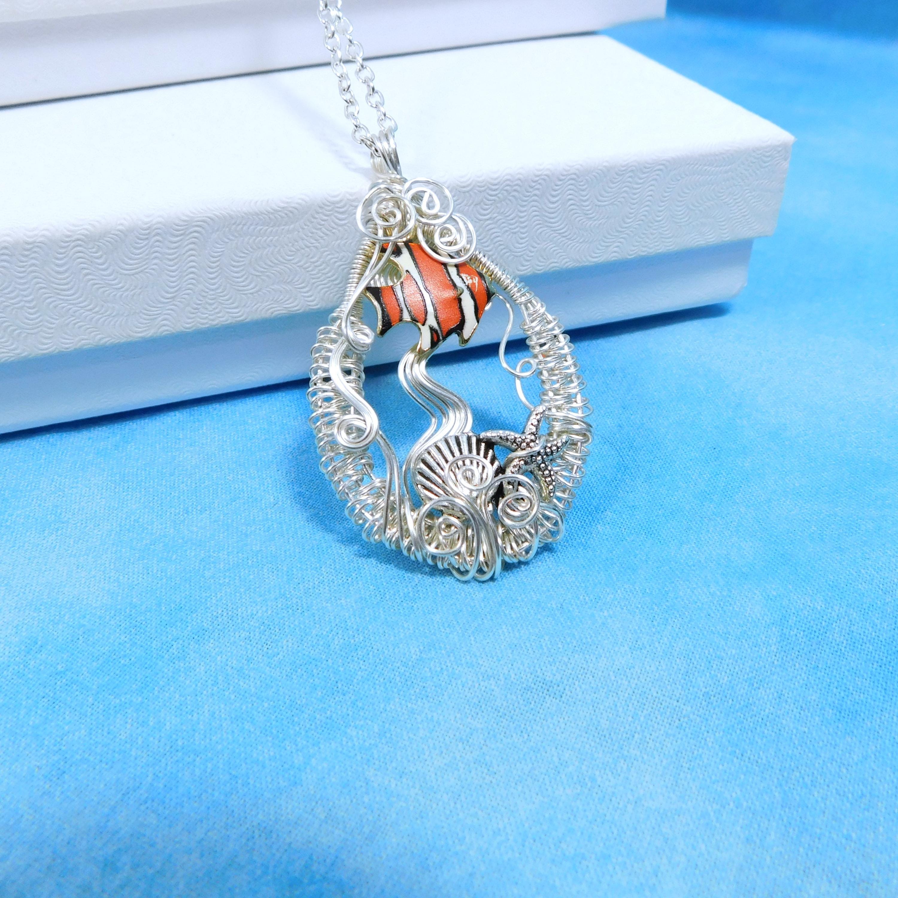 SHIPS FROM THE US! A colorful tropical clownfish swims among sweeping waves of hand woven fine silver over copper wire and shells, framed with another 4 strands of meticulously woven wire. This whimsical, artisan crafted pendant style necklace would brighten up any outfit, causing a splash wherever you go.