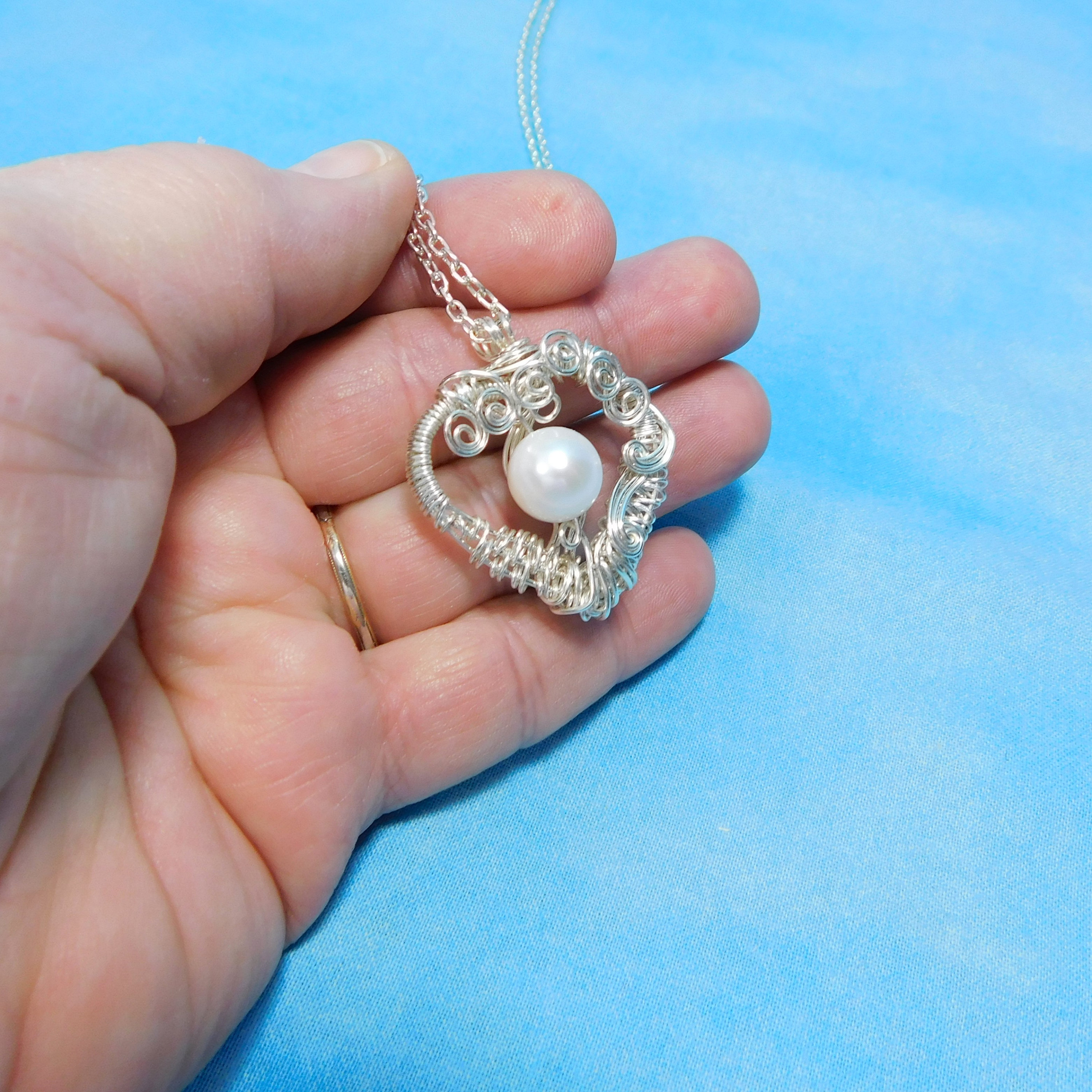 SHIPS FROM THE US! A genuine Freshwater Pearl is framed by a meticulously hand woven non tarnish fine silver over copper wire heart. The delicate curls of wire add dimension and depth and completes the delicate heirloom quality that makes this pendant special. This artistic, vintage style necklace is a unique representation of love and esteem that will be a treasured addition to the collection of that special lady.