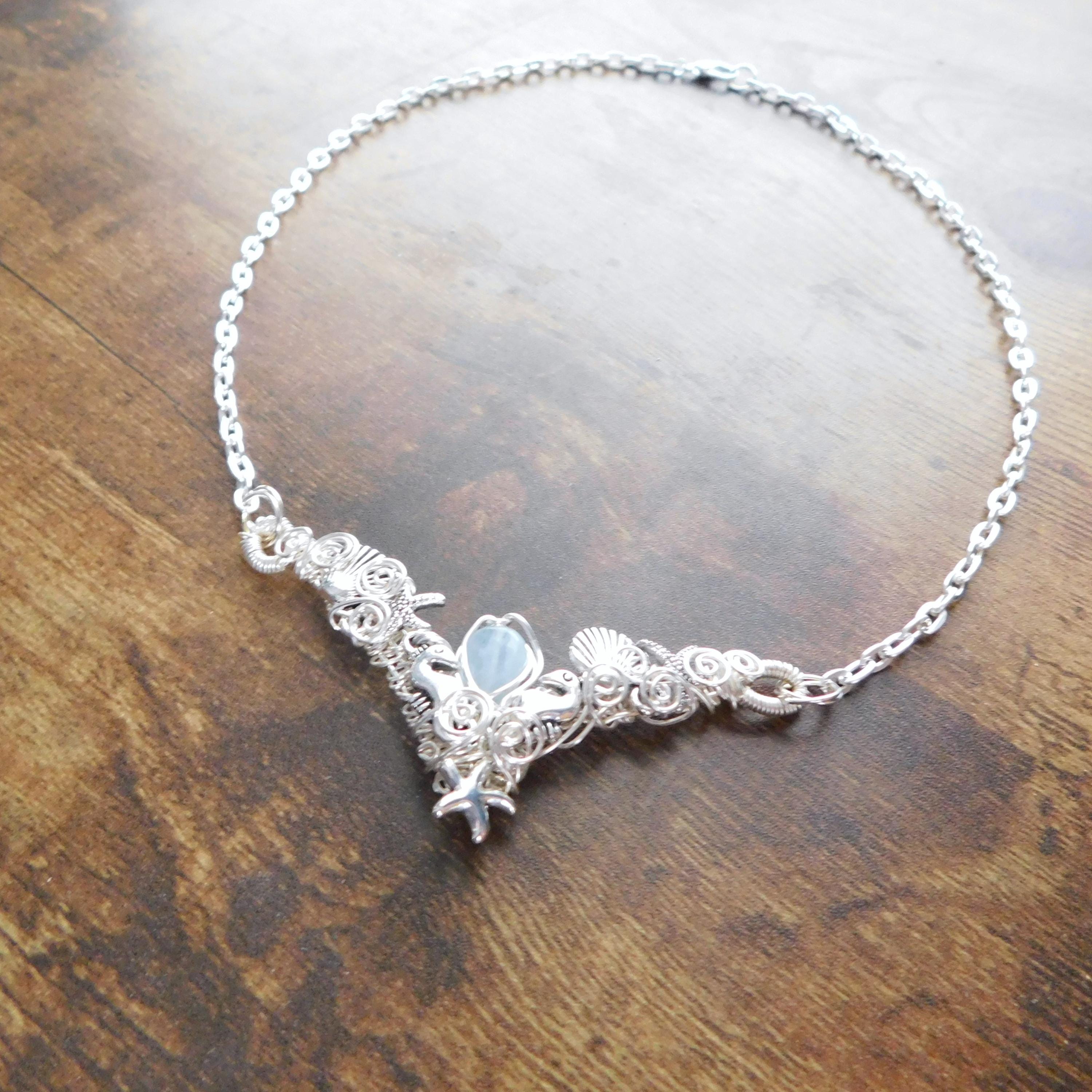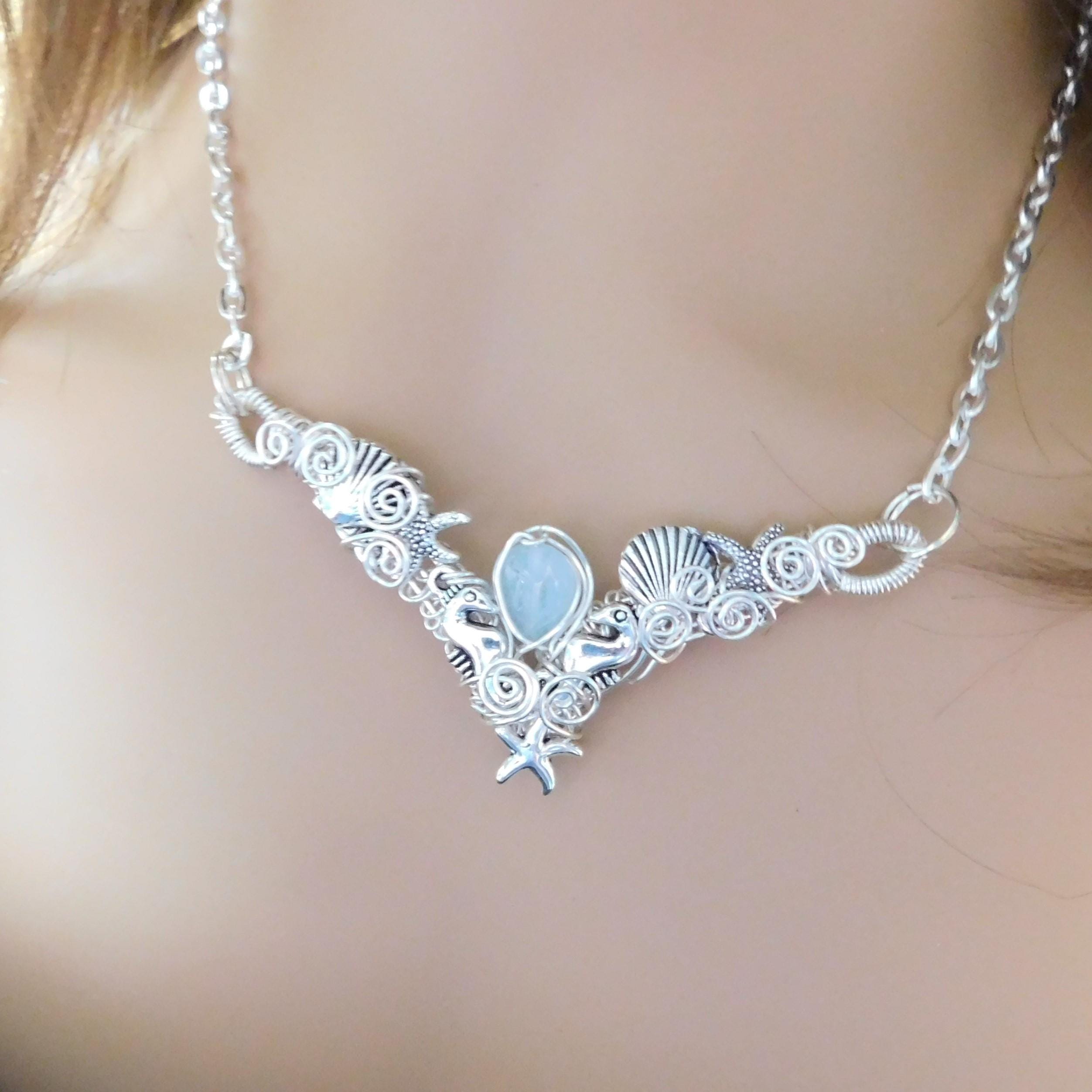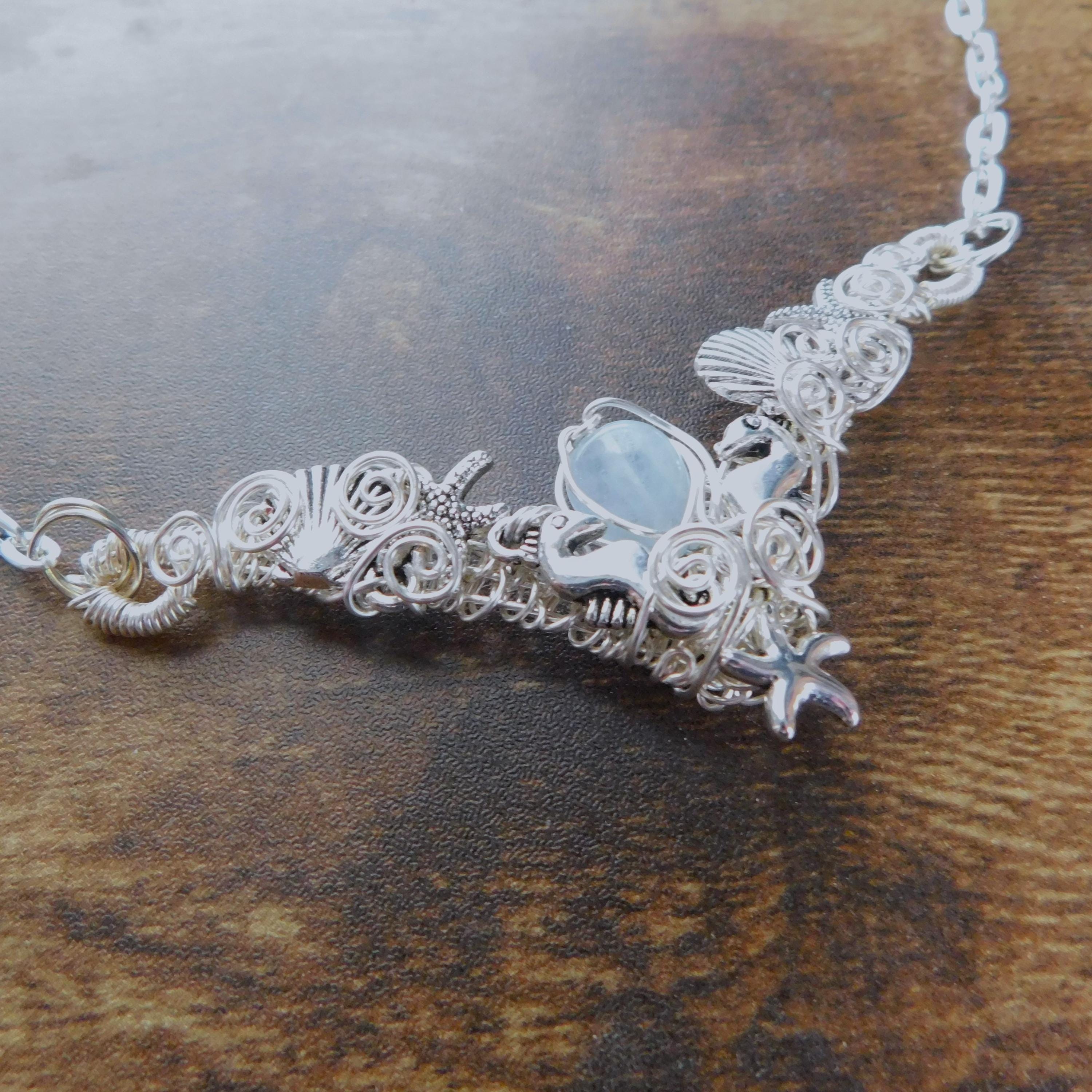 SHIPS FROM THE US! A small teardrop piece of natural misty blue aquamarine is framed in artisan crafted woven wire, artistically embellished with seahorses, sea shells and starfish, creating a unique bib style necklace.