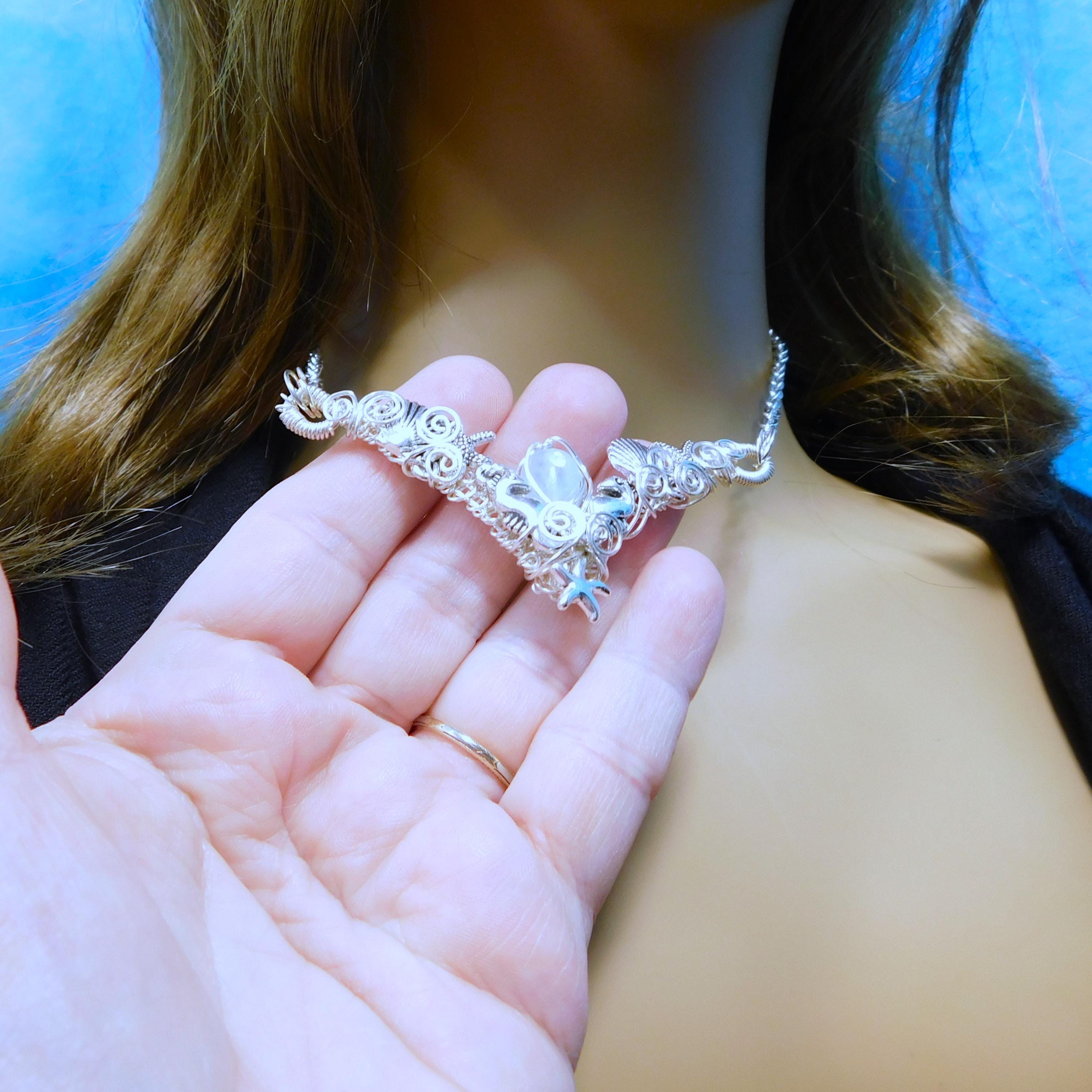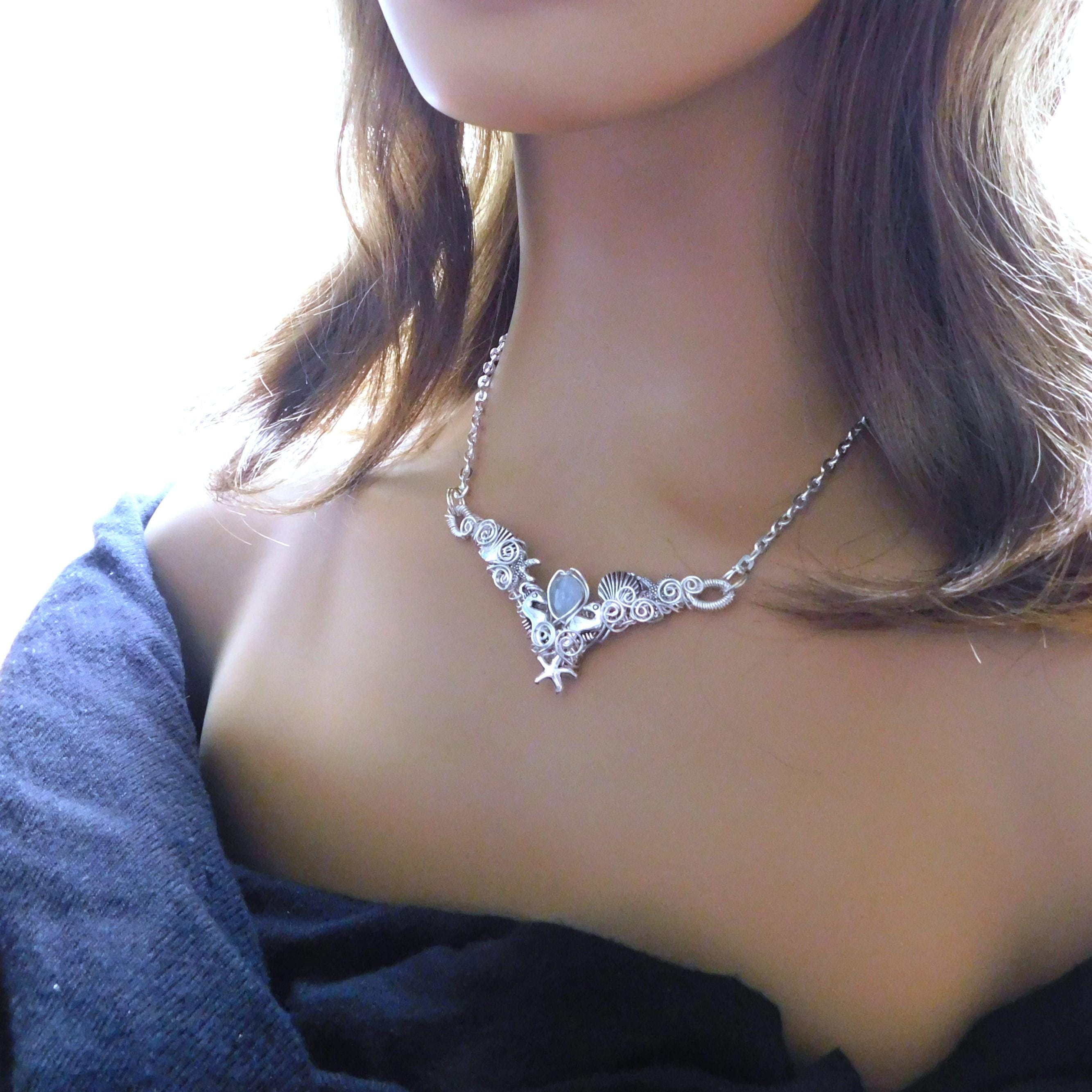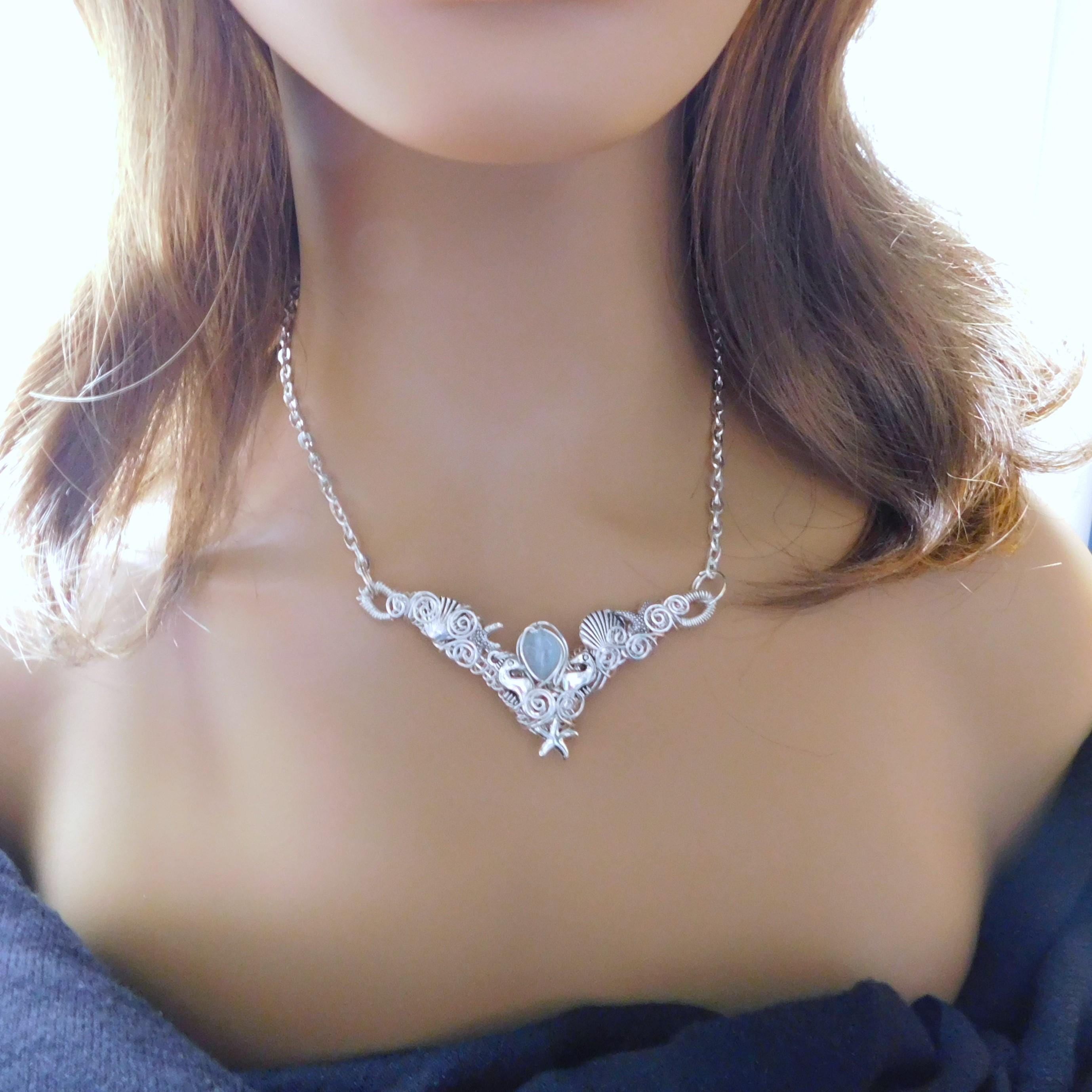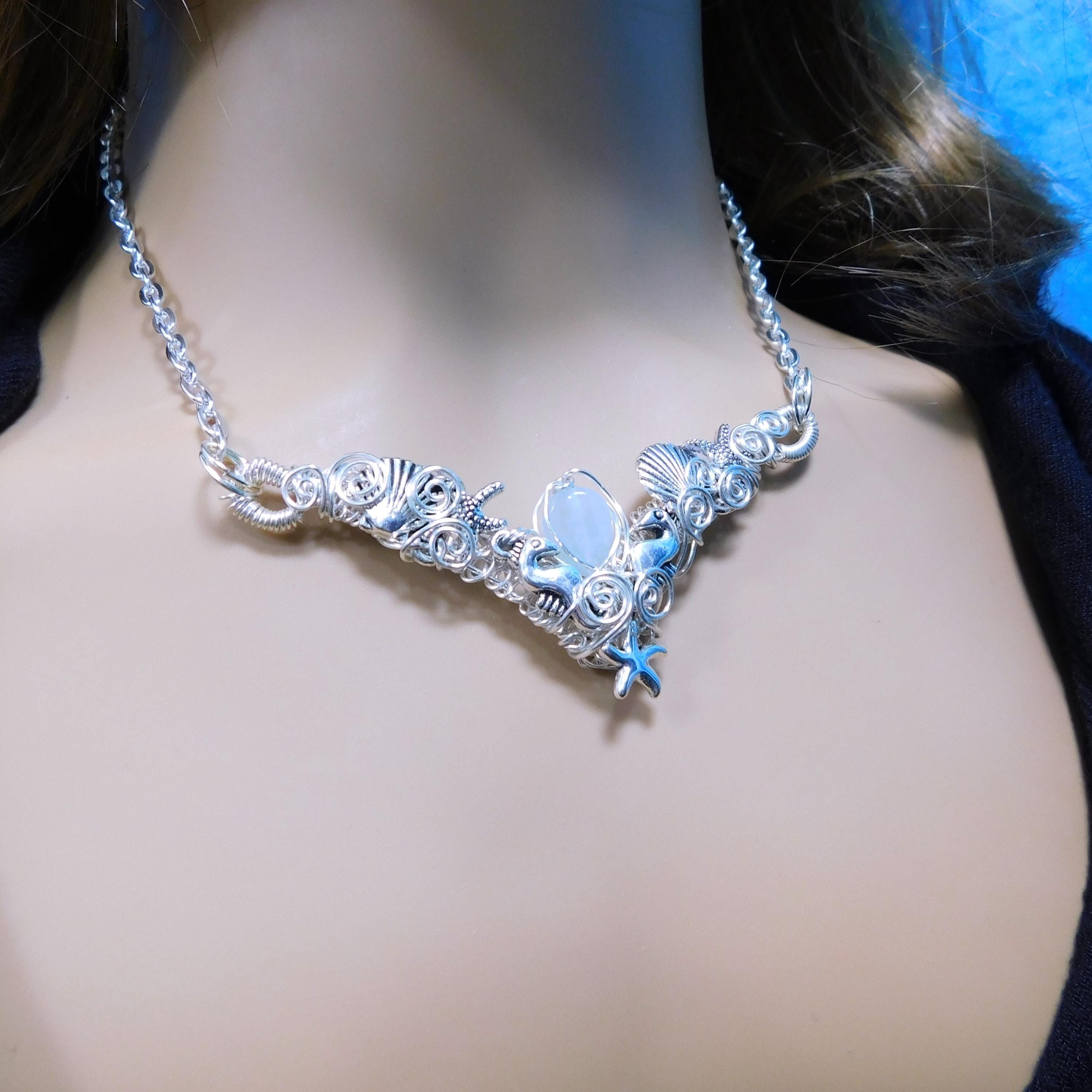 SHIPS FROM THE US! A small teardrop piece of natural misty blue aquamarine is framed in artisan crafted woven wire, artistically embellished with seahorses, sea shells and starfish, creating a unique bib style necklace.