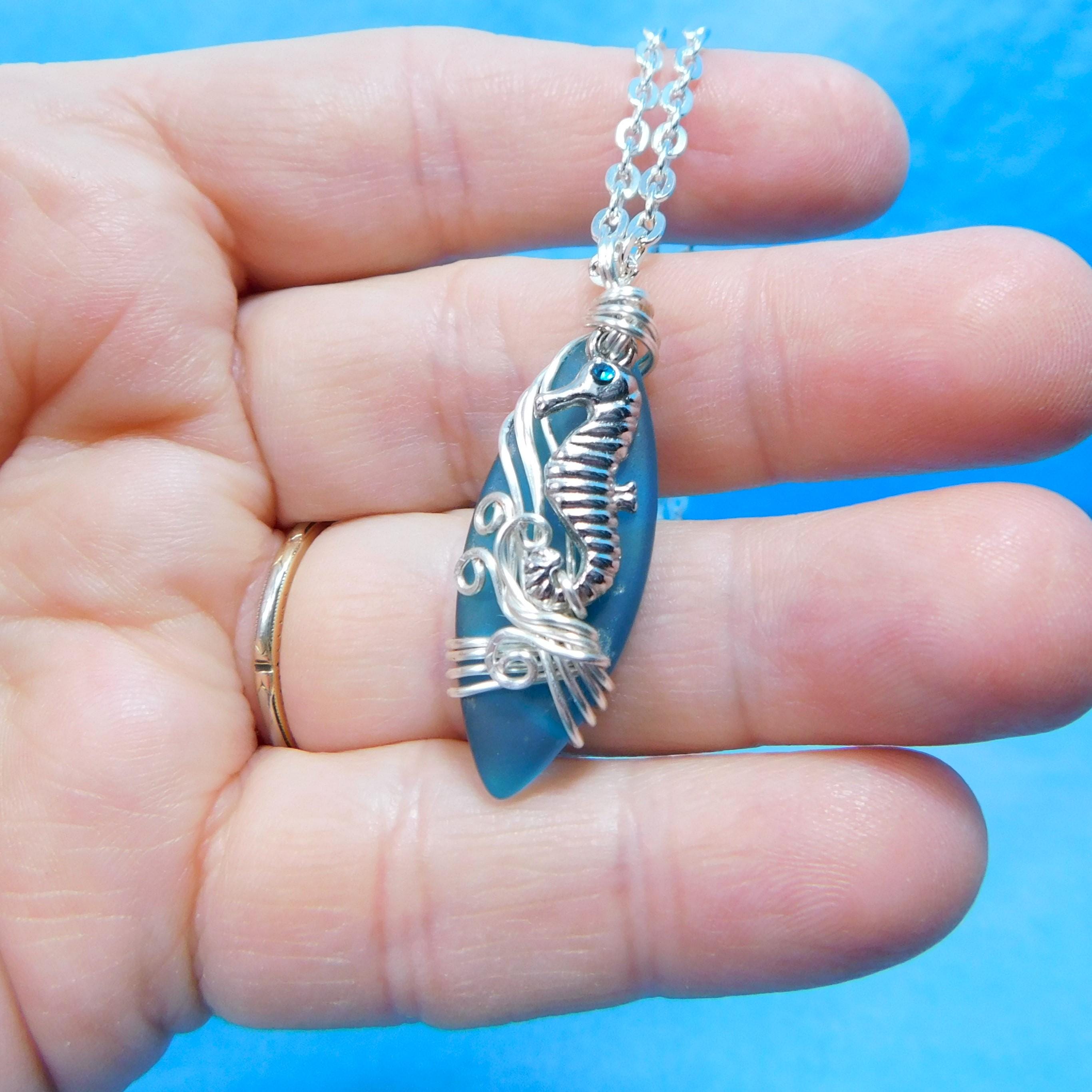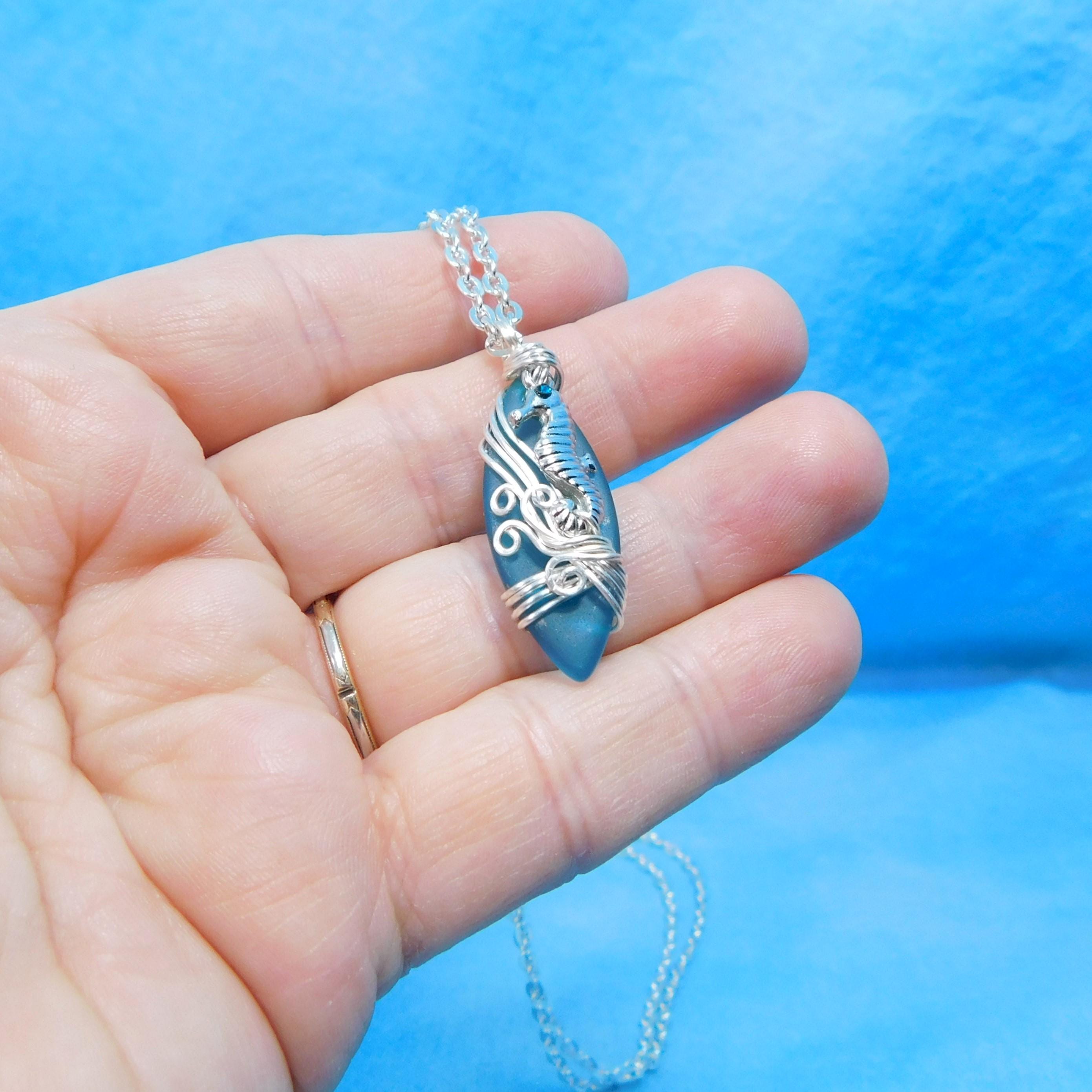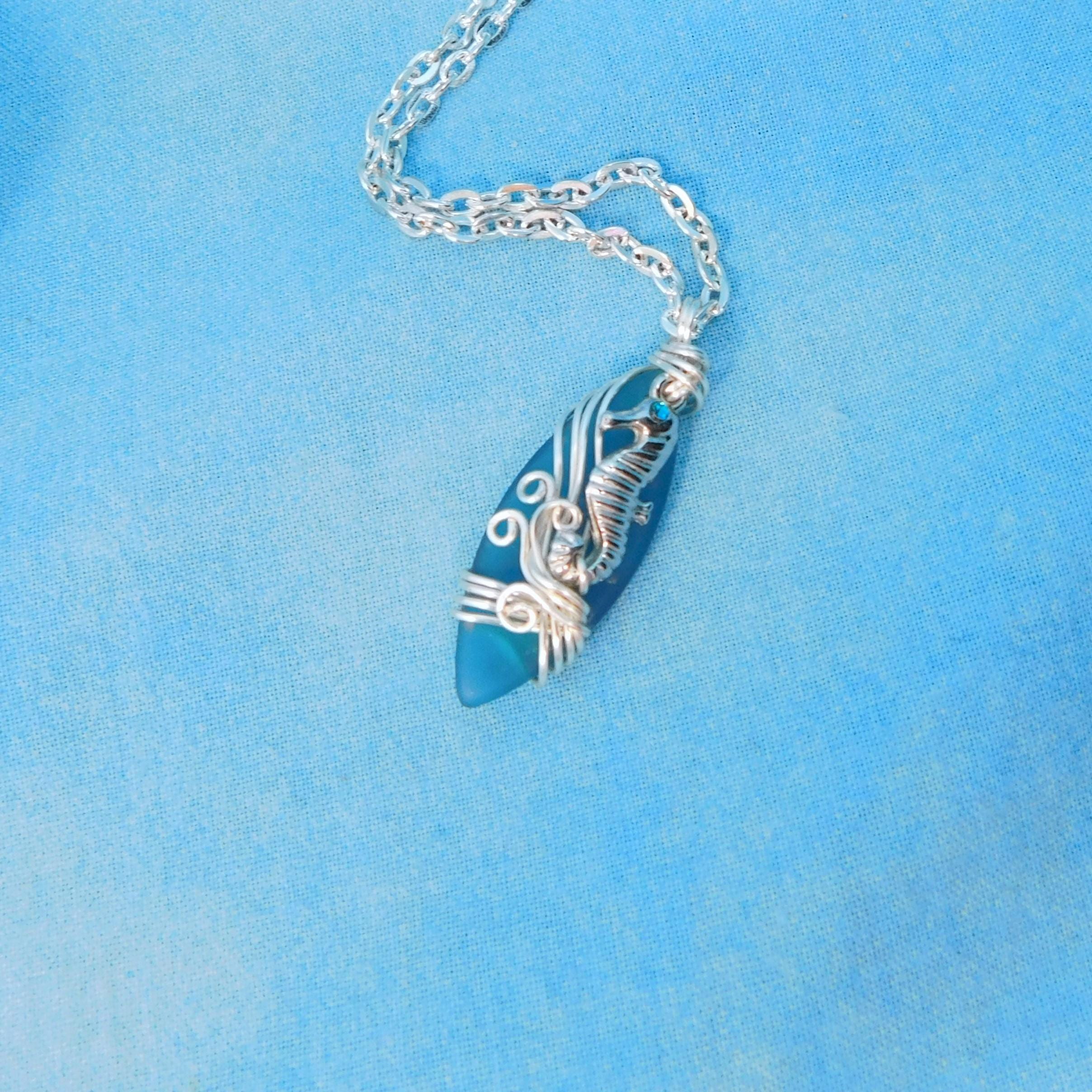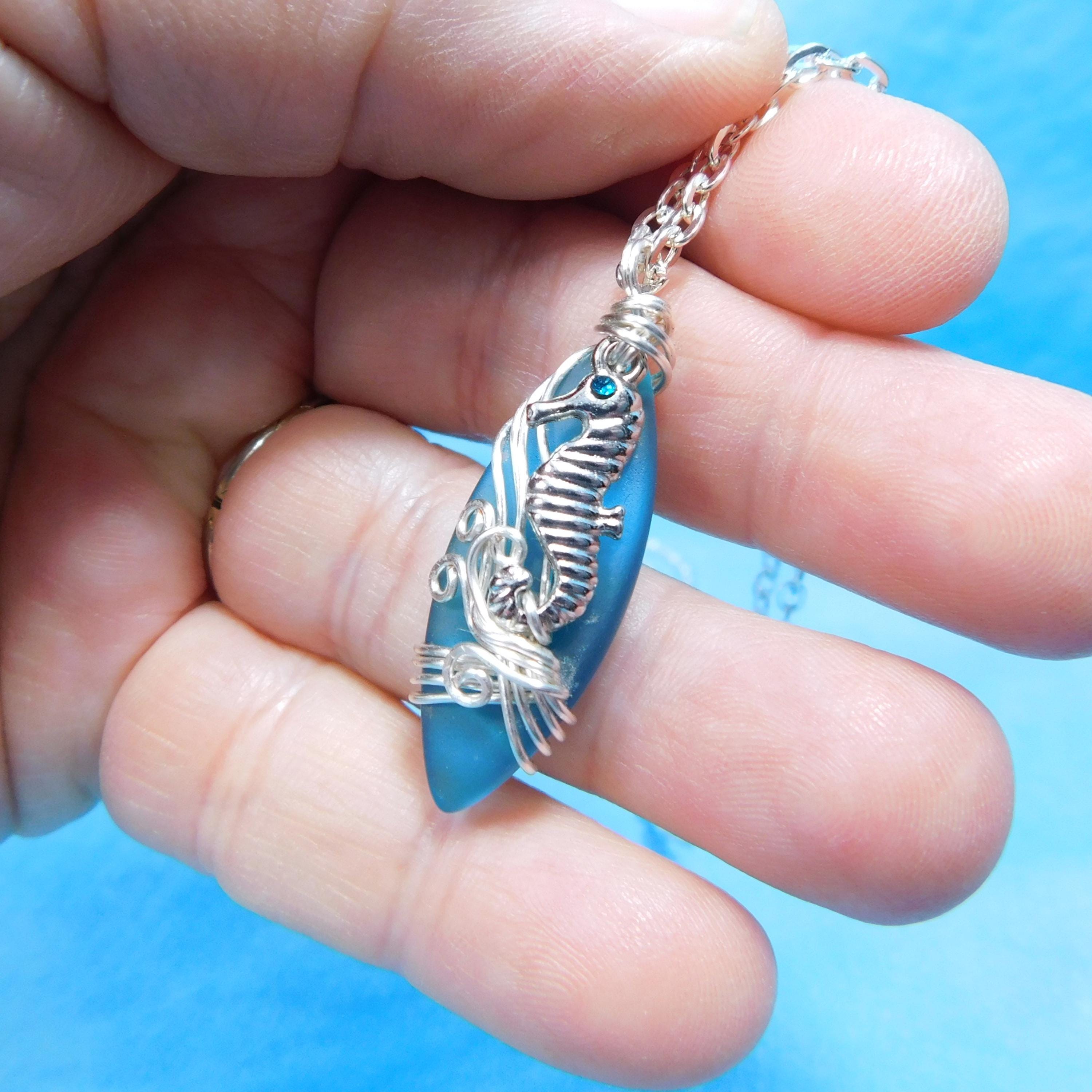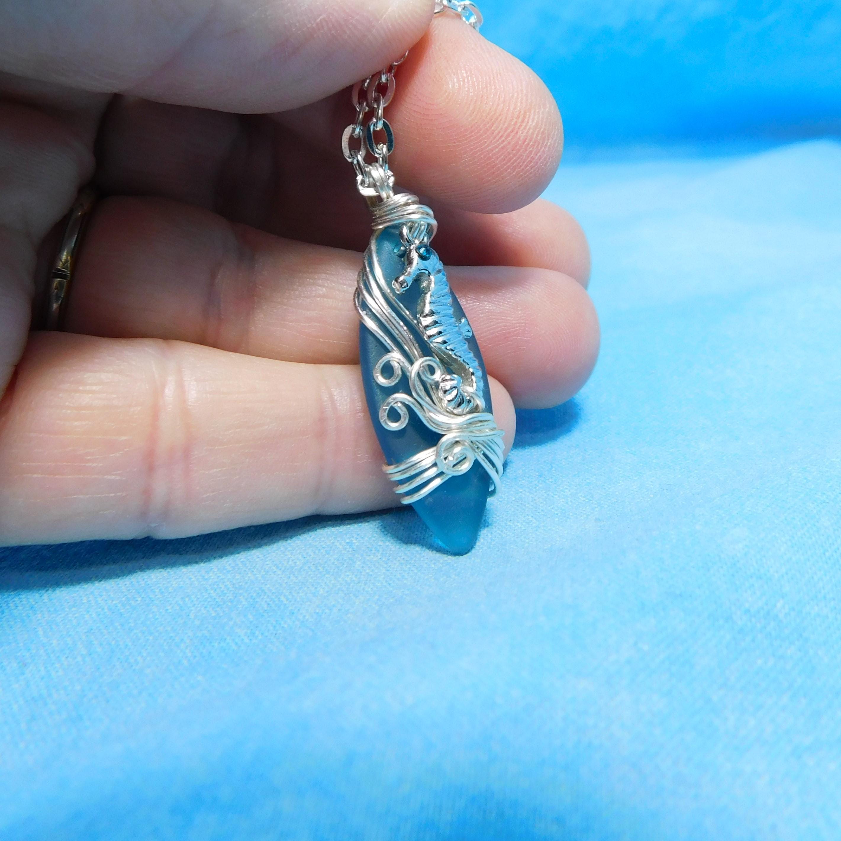 SHIPS FROM THE US! Beautiful aquamarine colored sea glass is wrapped with non tarnish fine silver over copper wire, and embellished with a tiny rhinestone accented seahorse. The artistic sculpture of wire waves was created using only two strands of wire, pliers and patience. It is artistry combined with a little bit of engineering.