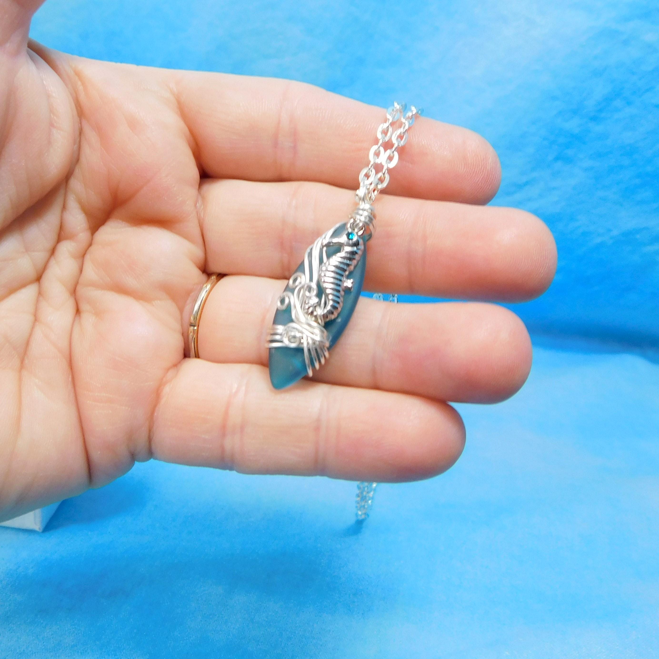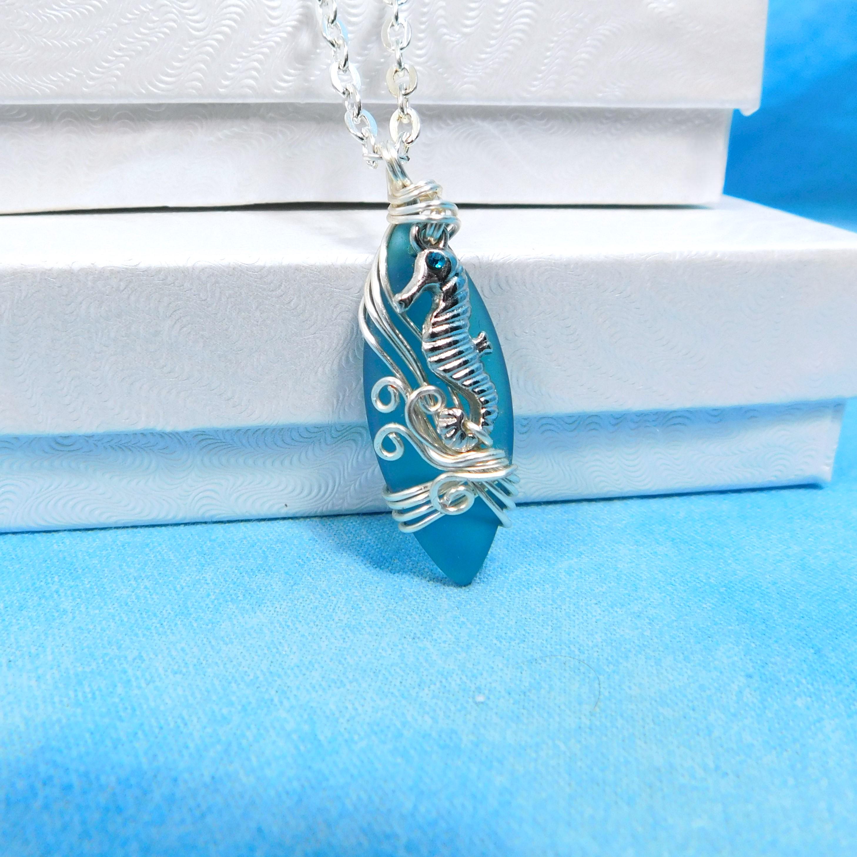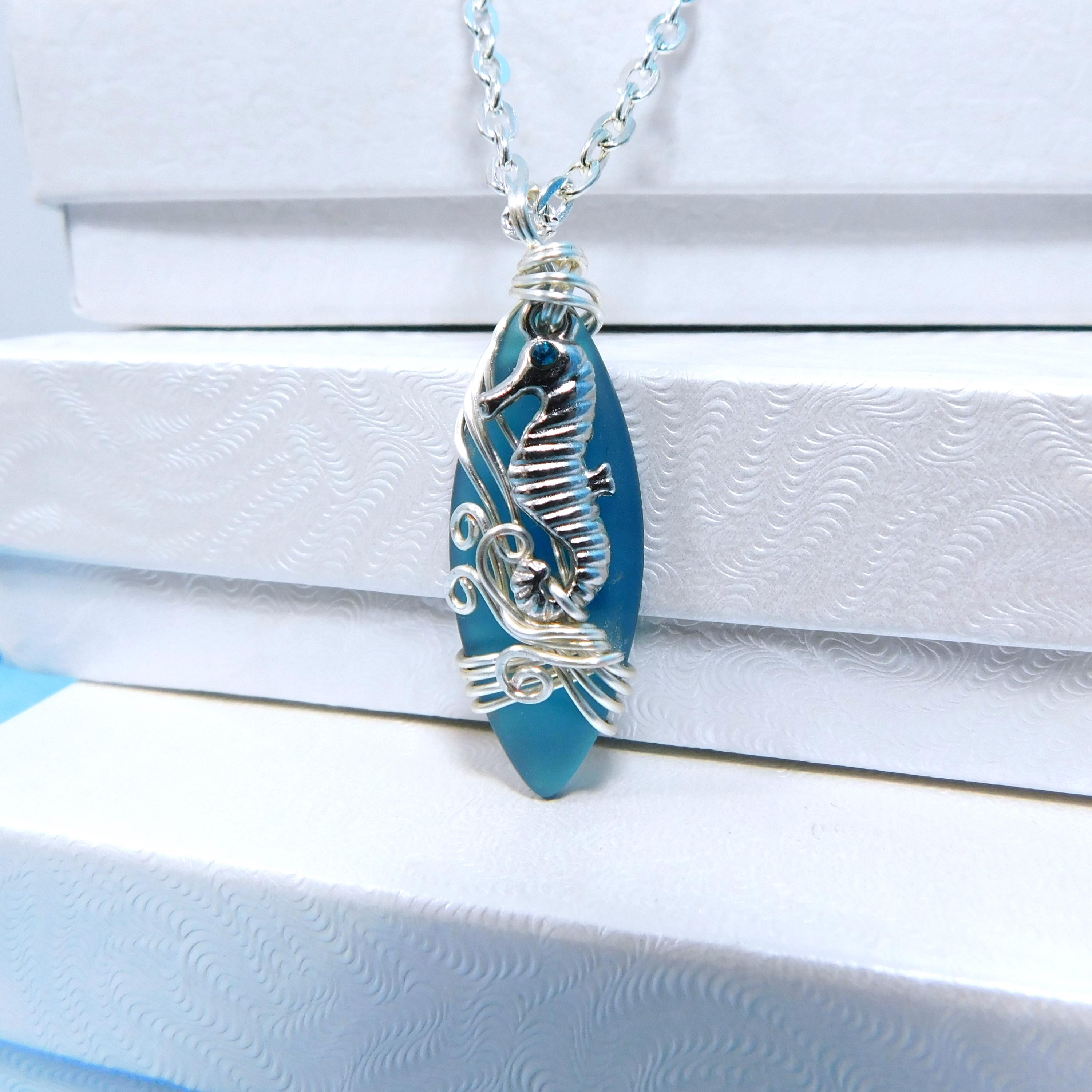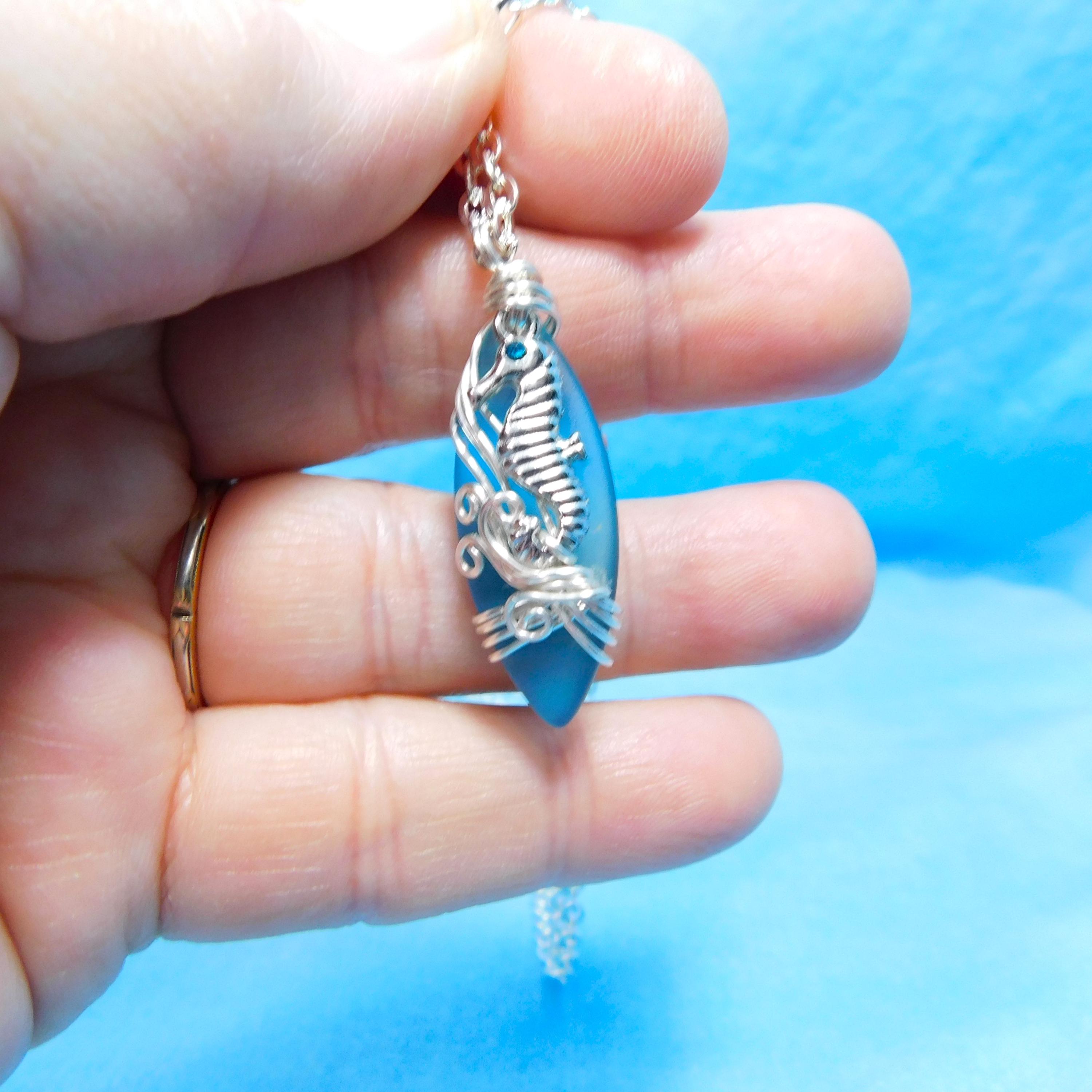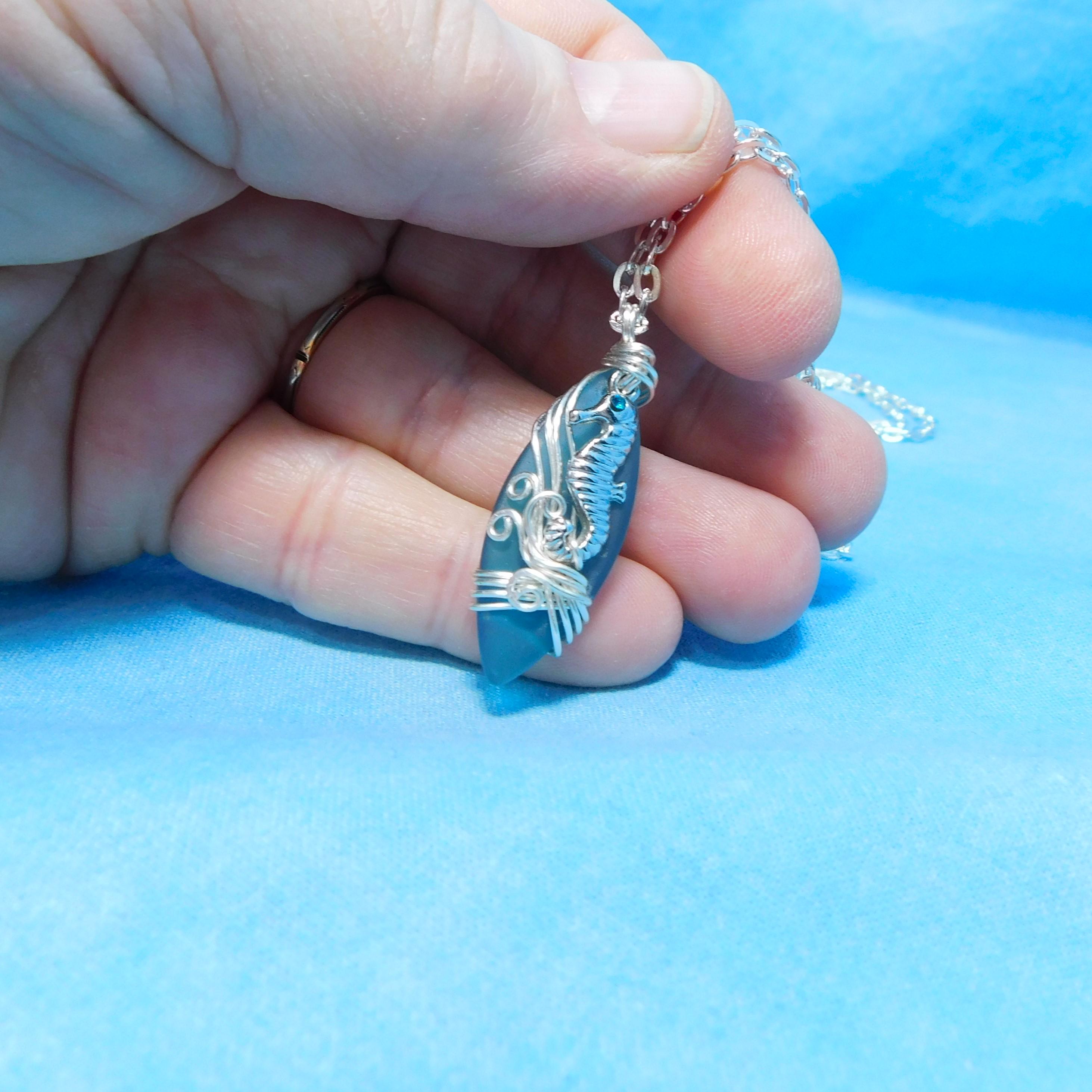 SHIPS FROM THE US! Beautiful aquamarine colored sea glass is wrapped with non tarnish fine silver over copper wire, and embellished with a tiny rhinestone accented seahorse. The artistic sculpture of wire waves was created using only two strands of wire, pliers and patience. It is artistry combined with a little bit of engineering.