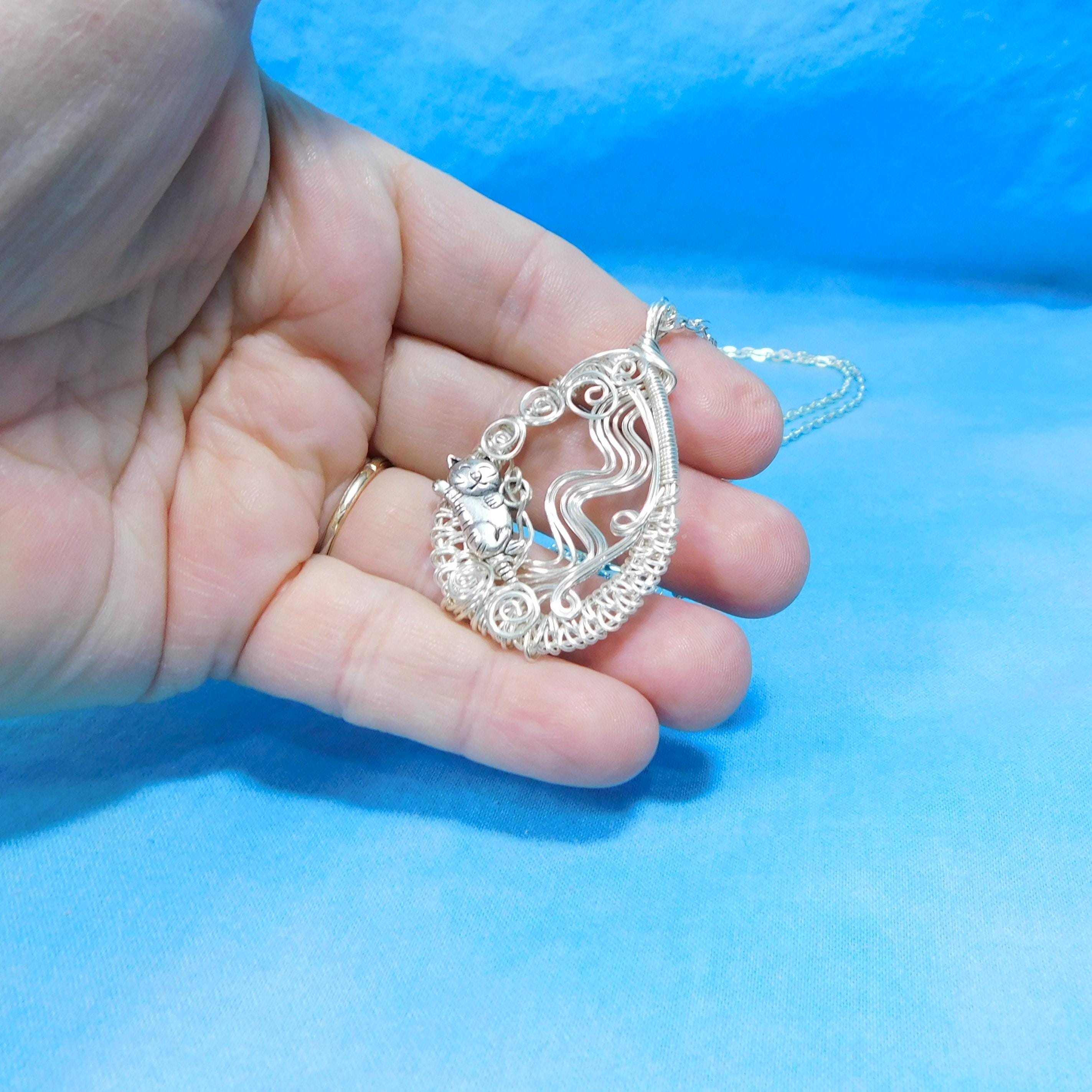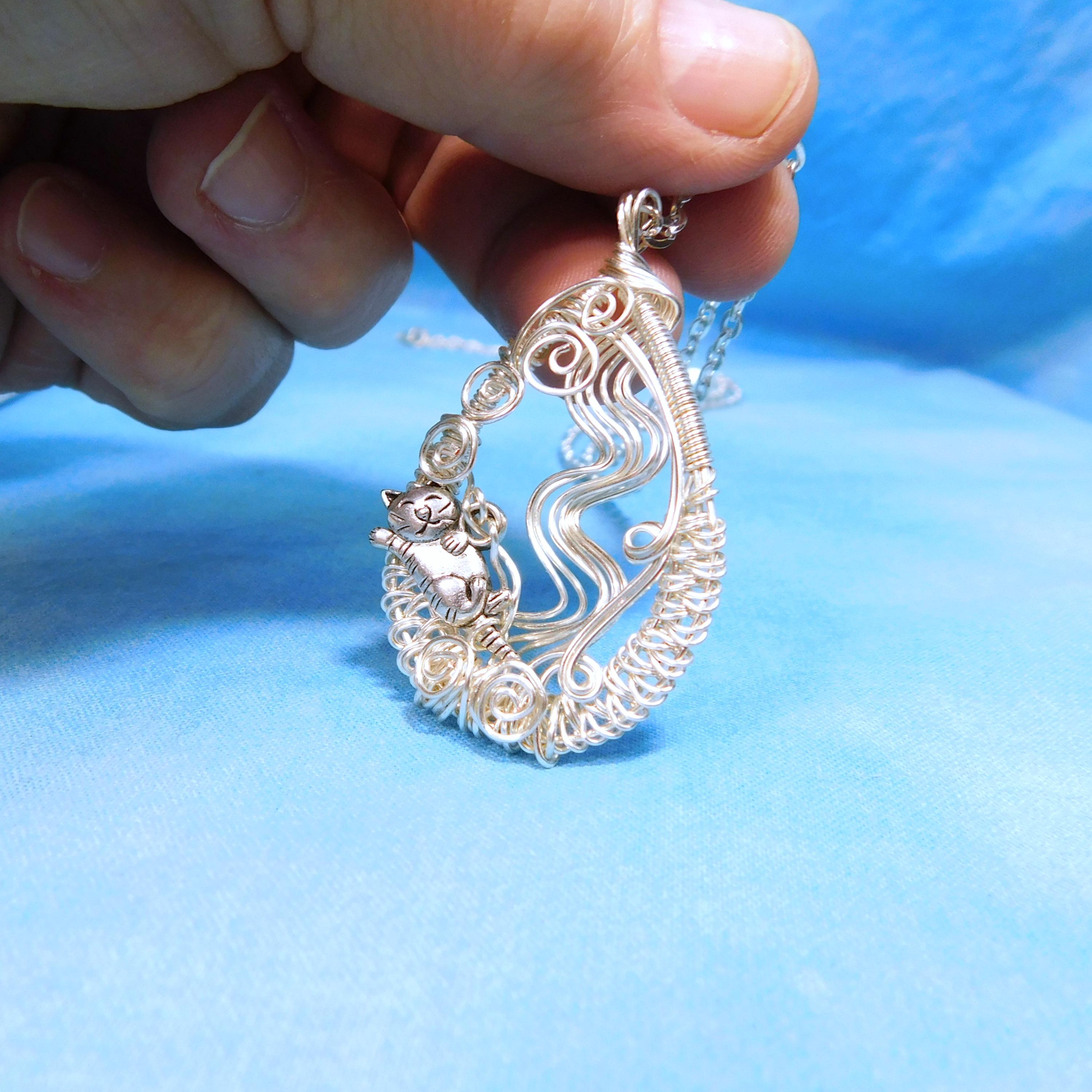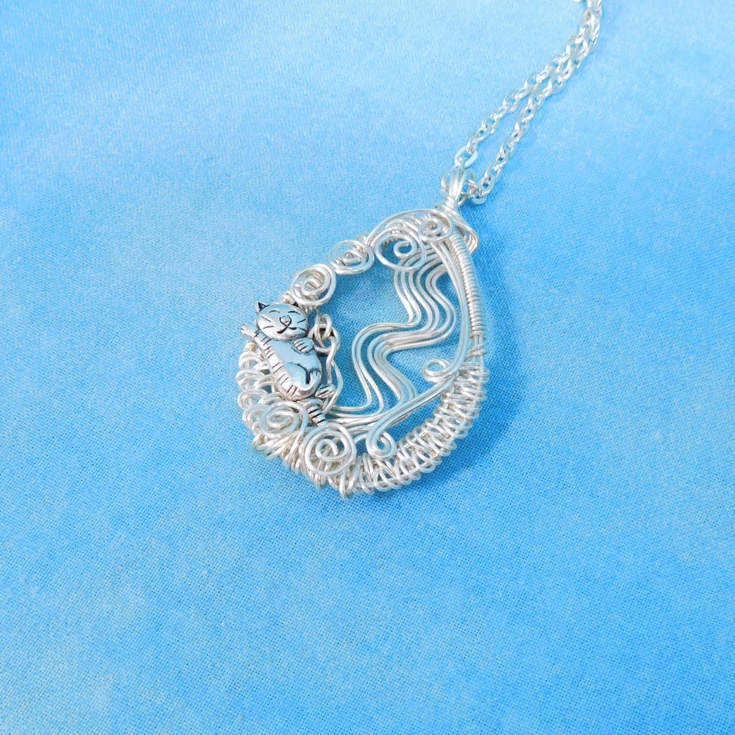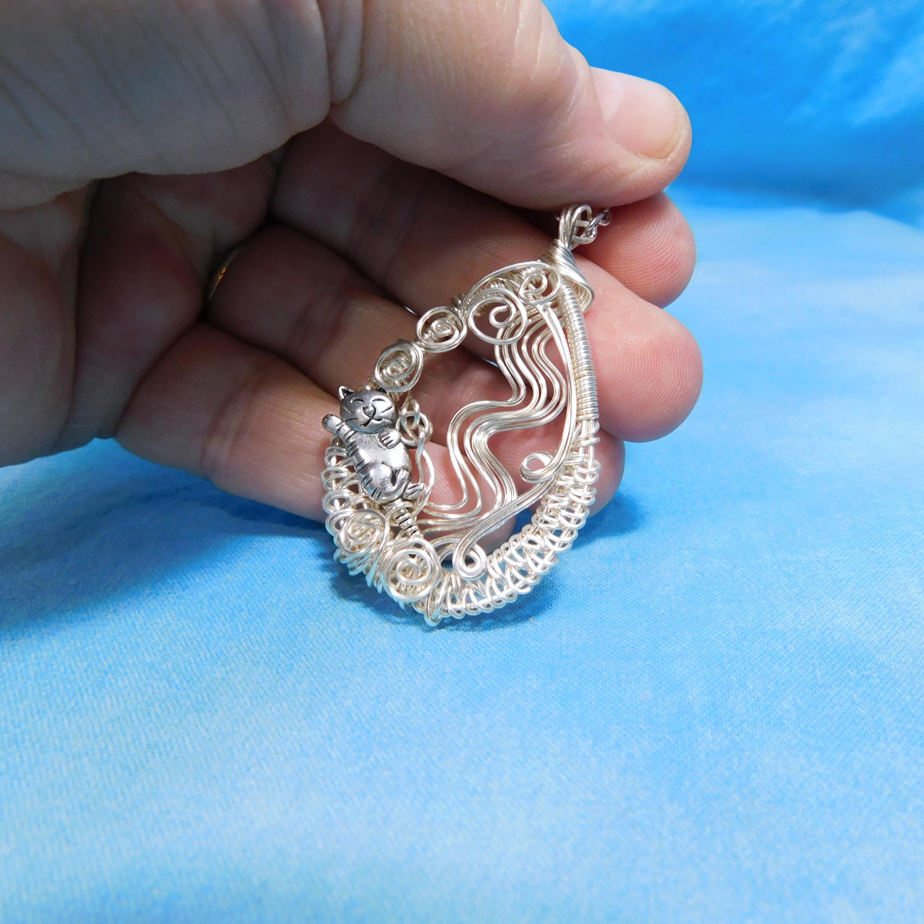 SHIPS FROM THE US! An adorable lazy kitty stretches out along the side of a hand woven wire frame. What a hard life! If someone you know is the servant to a cat, this pendant will thrill her.