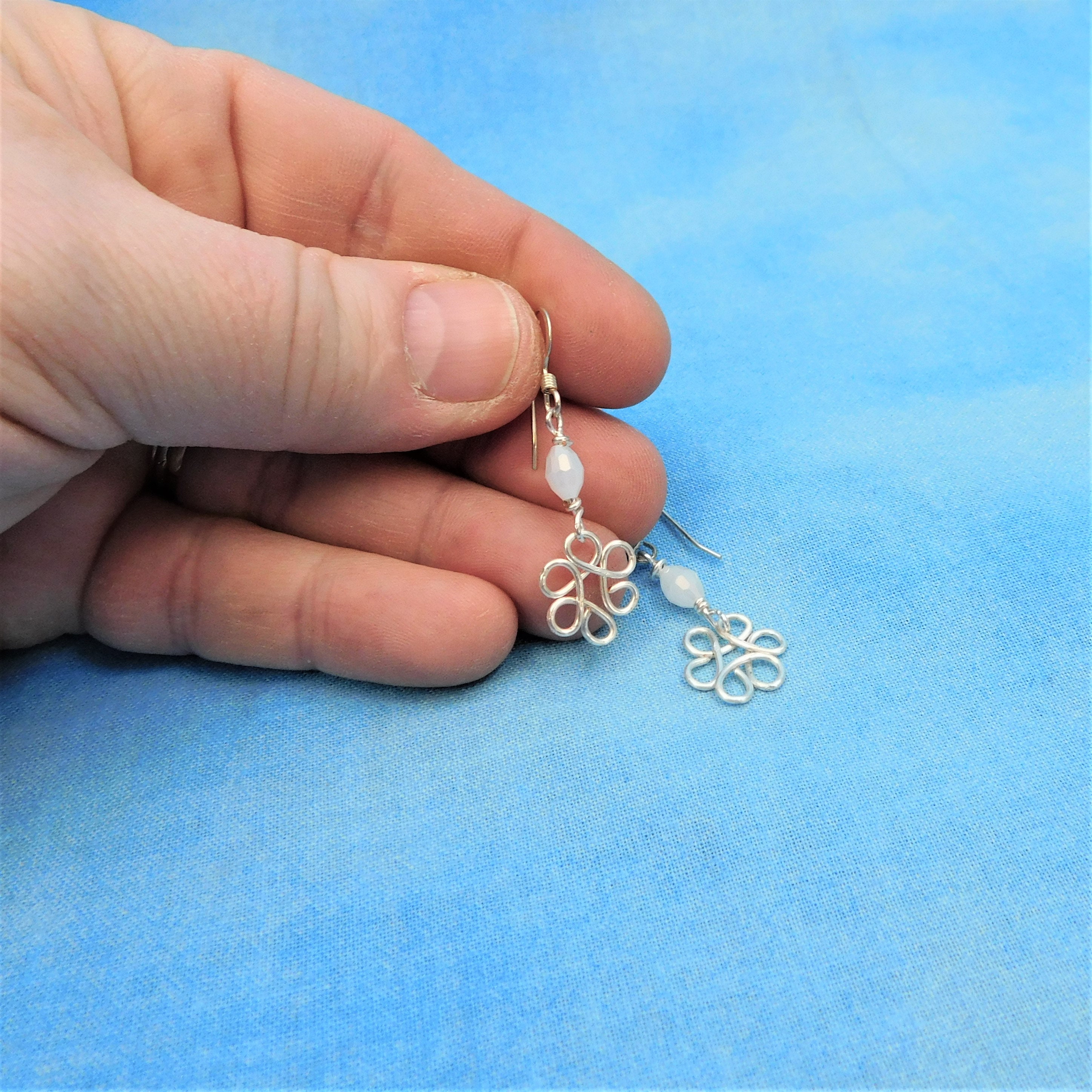 SHIPS FROM THE US! Two 1/2 inch flowers are hand sculpted of non tarnish fine silver over copper wire, and dangle from wire wrapped white Chinese crystals and sterling silver fish hook ear wires.