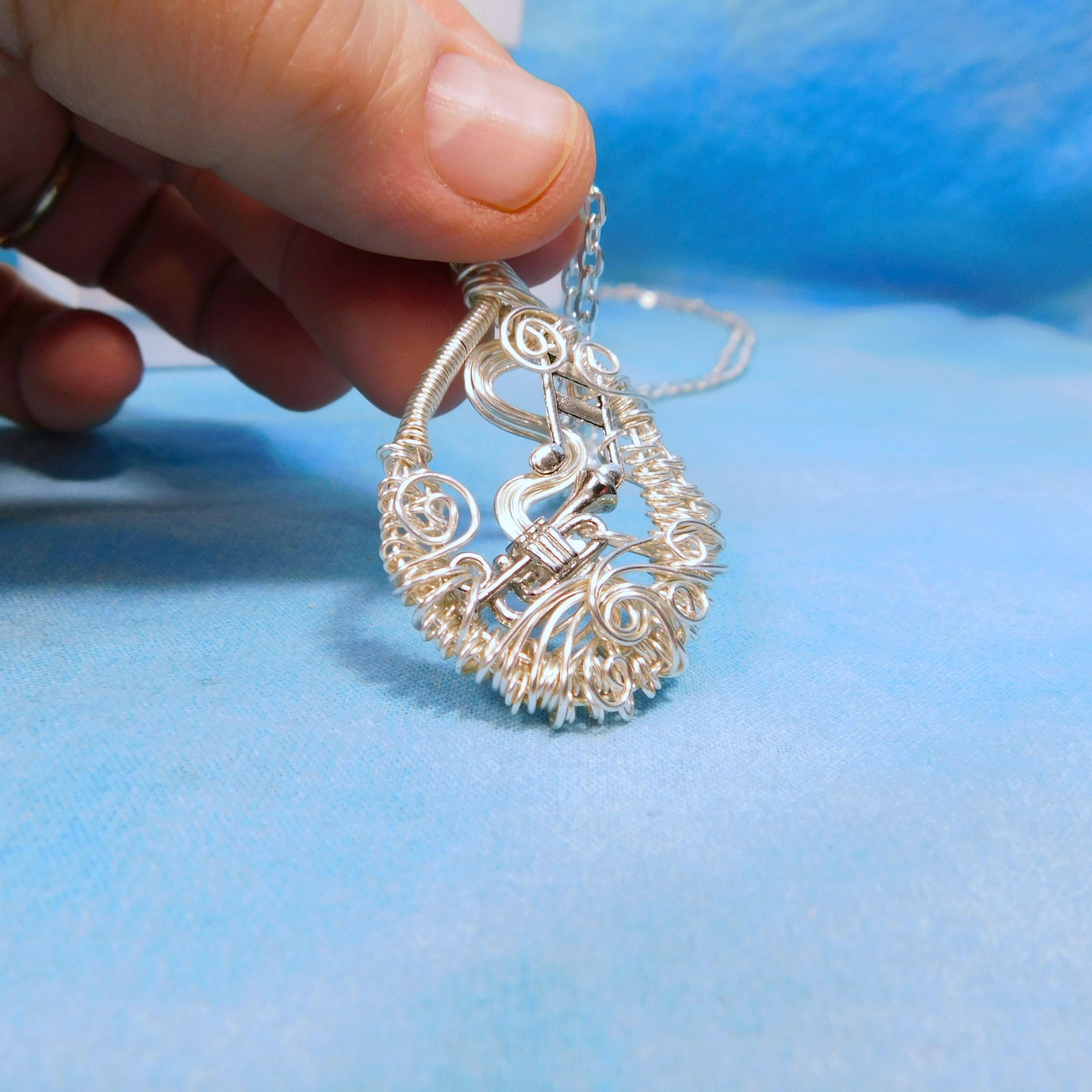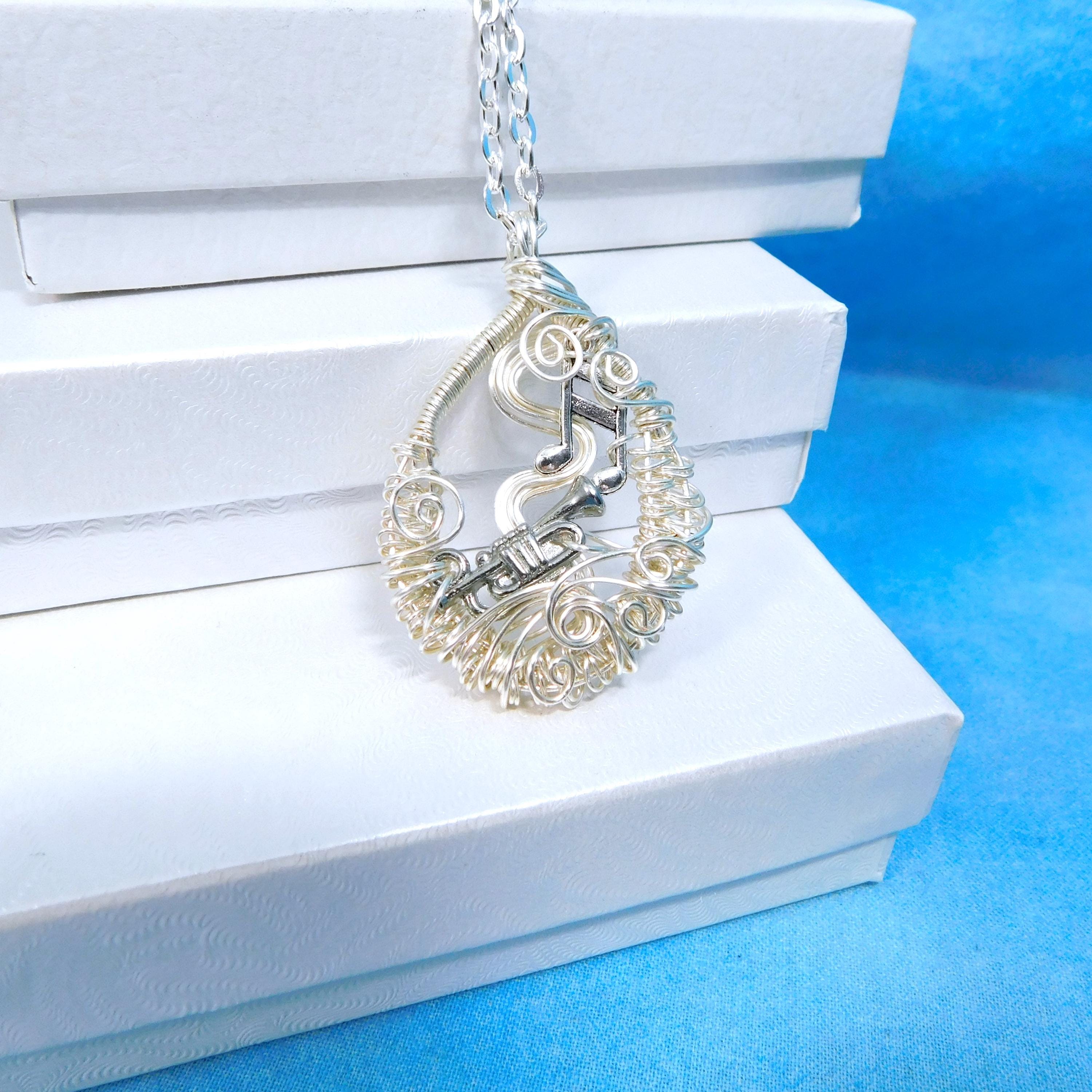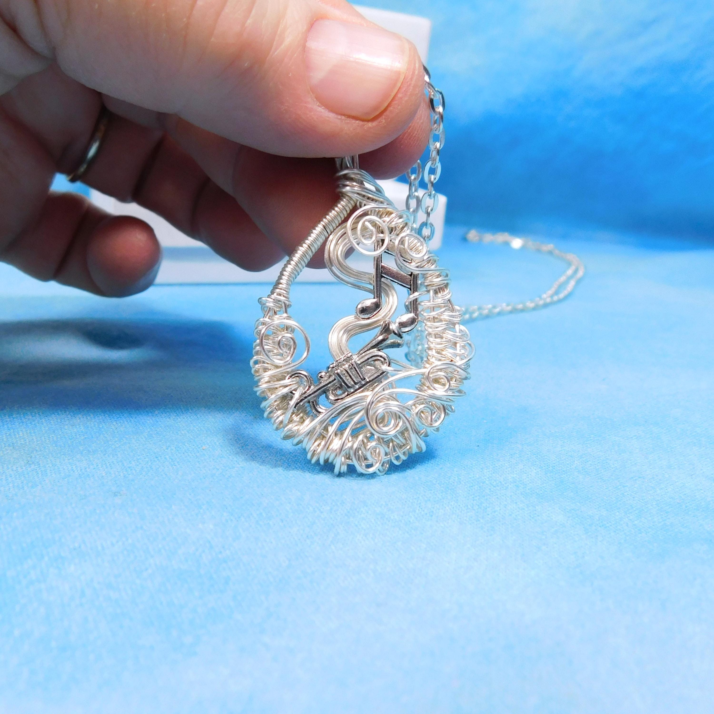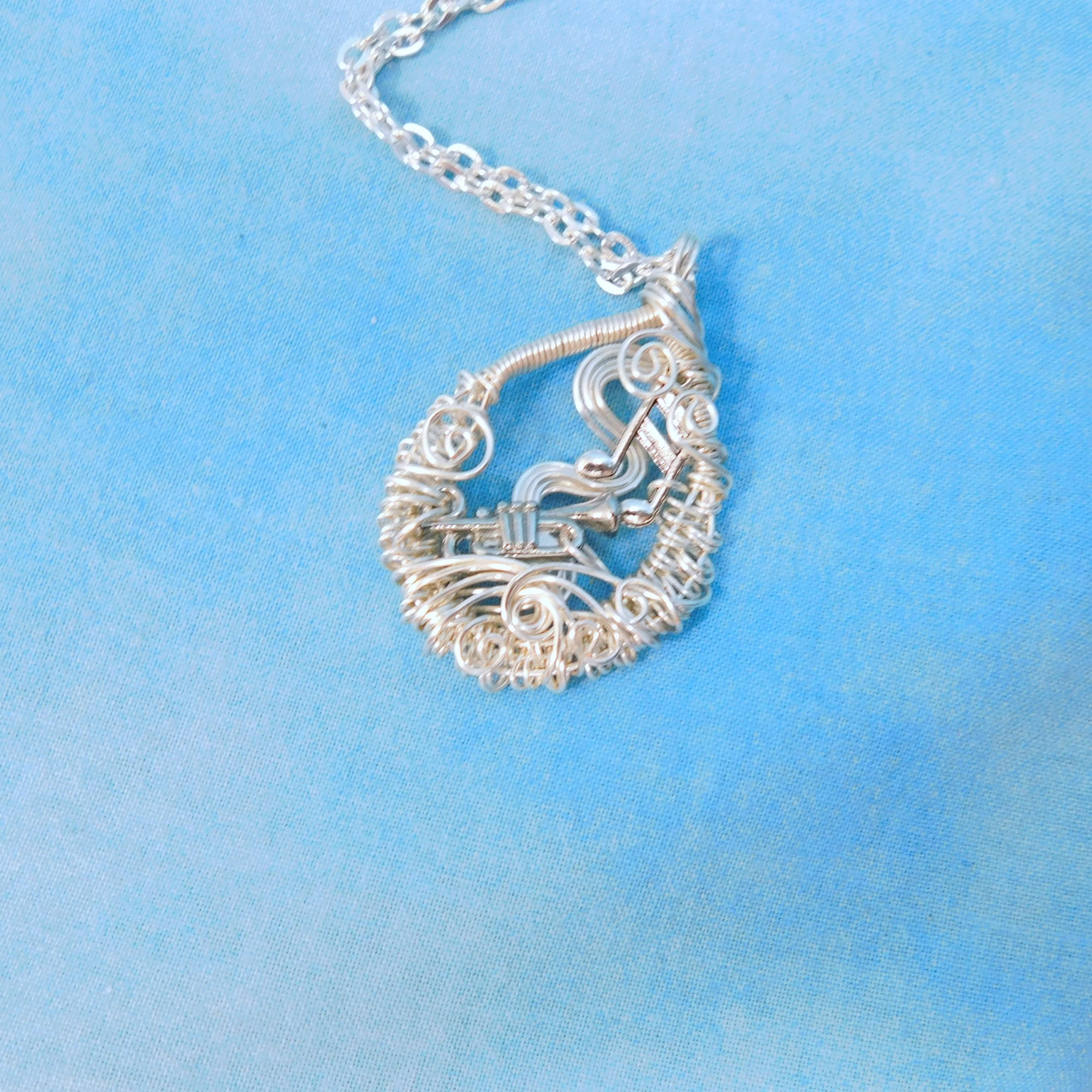 SHIPS FROM THE US! Non tarnish fine silver over copper wire is off-loom hand woven and sculpted to create a 1 1/2 inch by 1 inch frame for an antique silver patina trumpet. Eighth notes embellish the frame and creates a pendant that makes beautiful music.