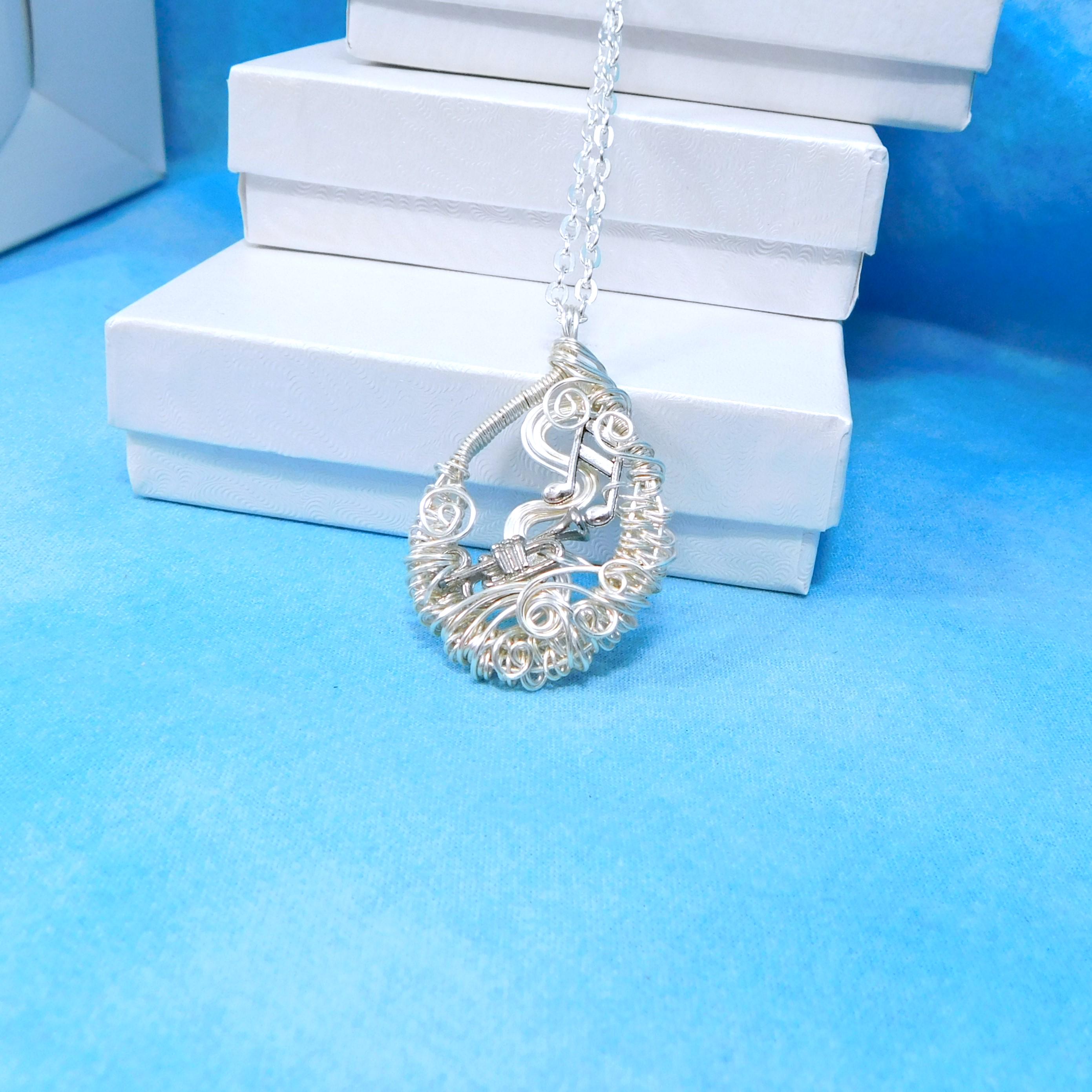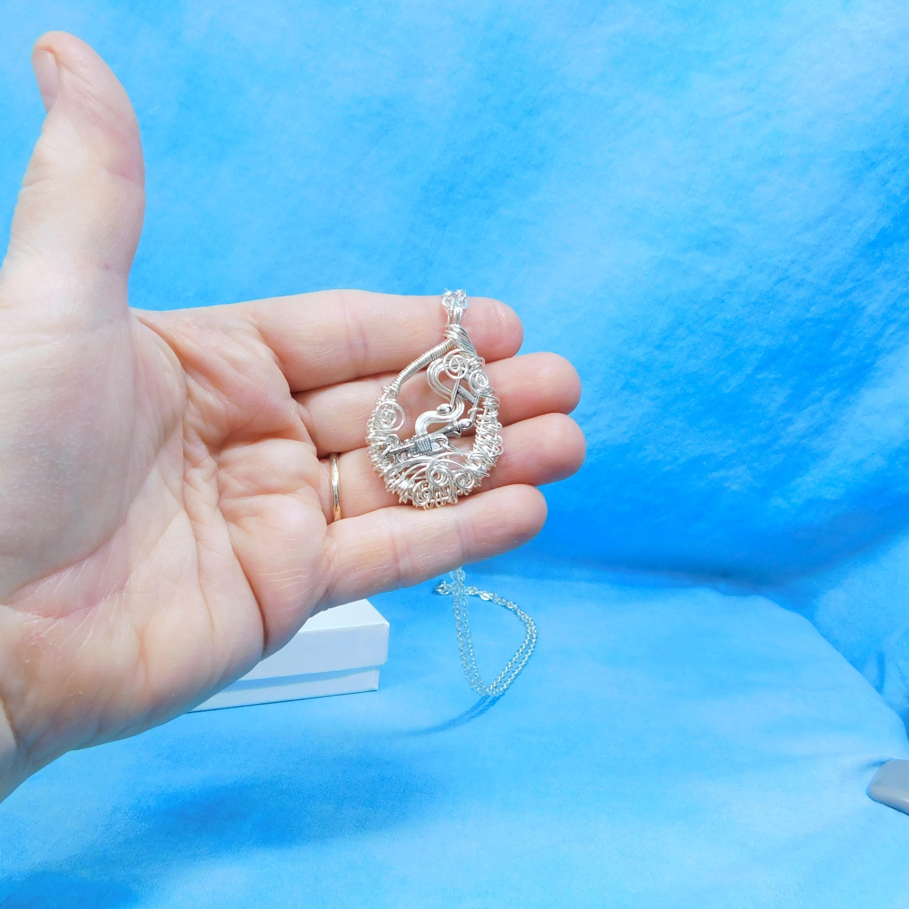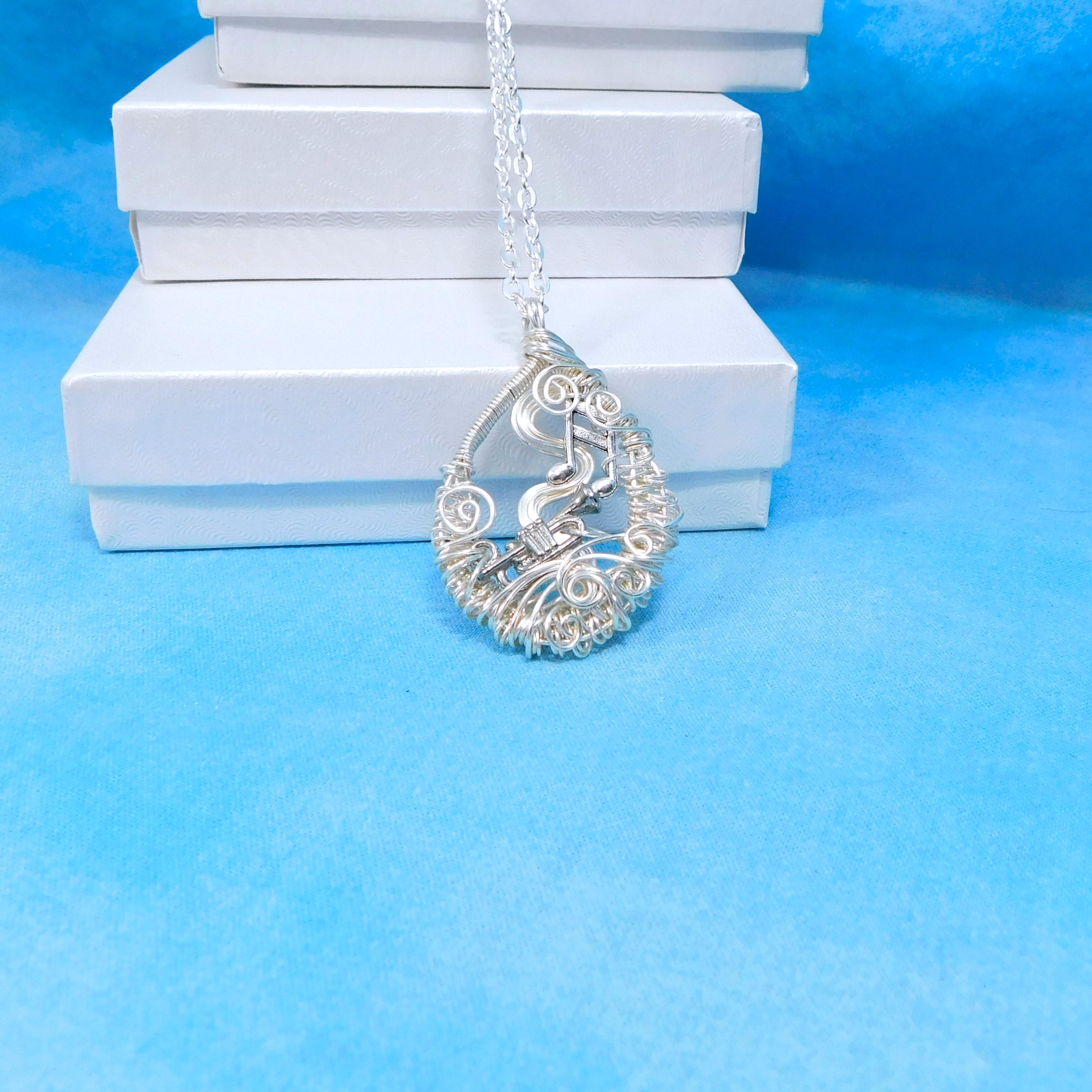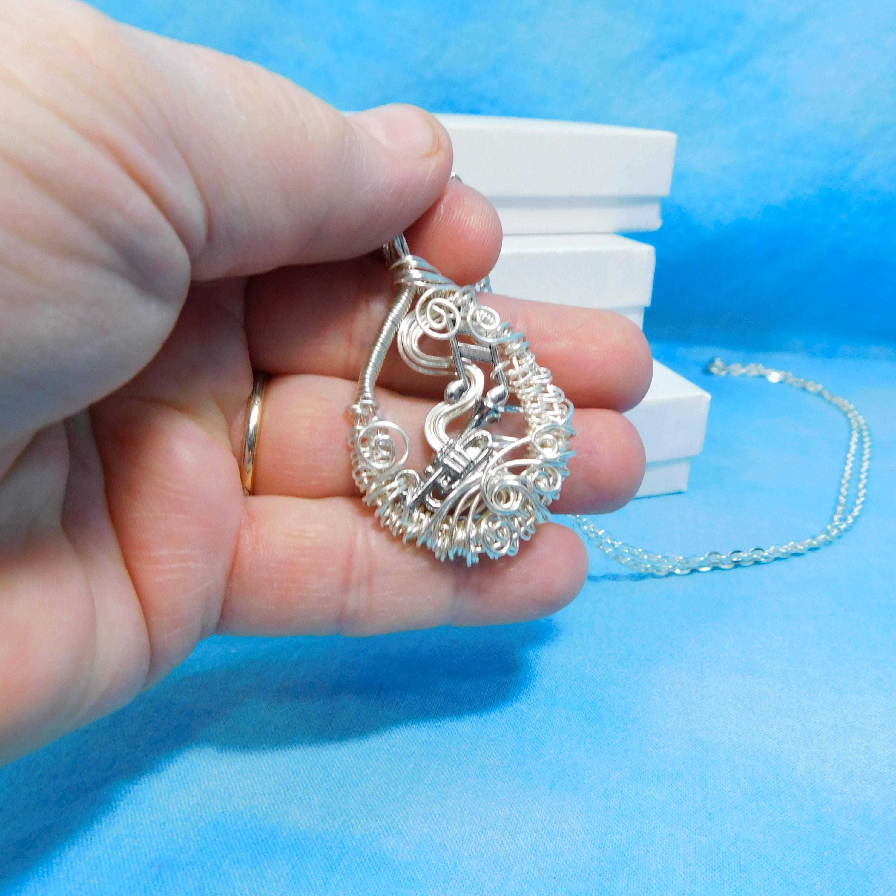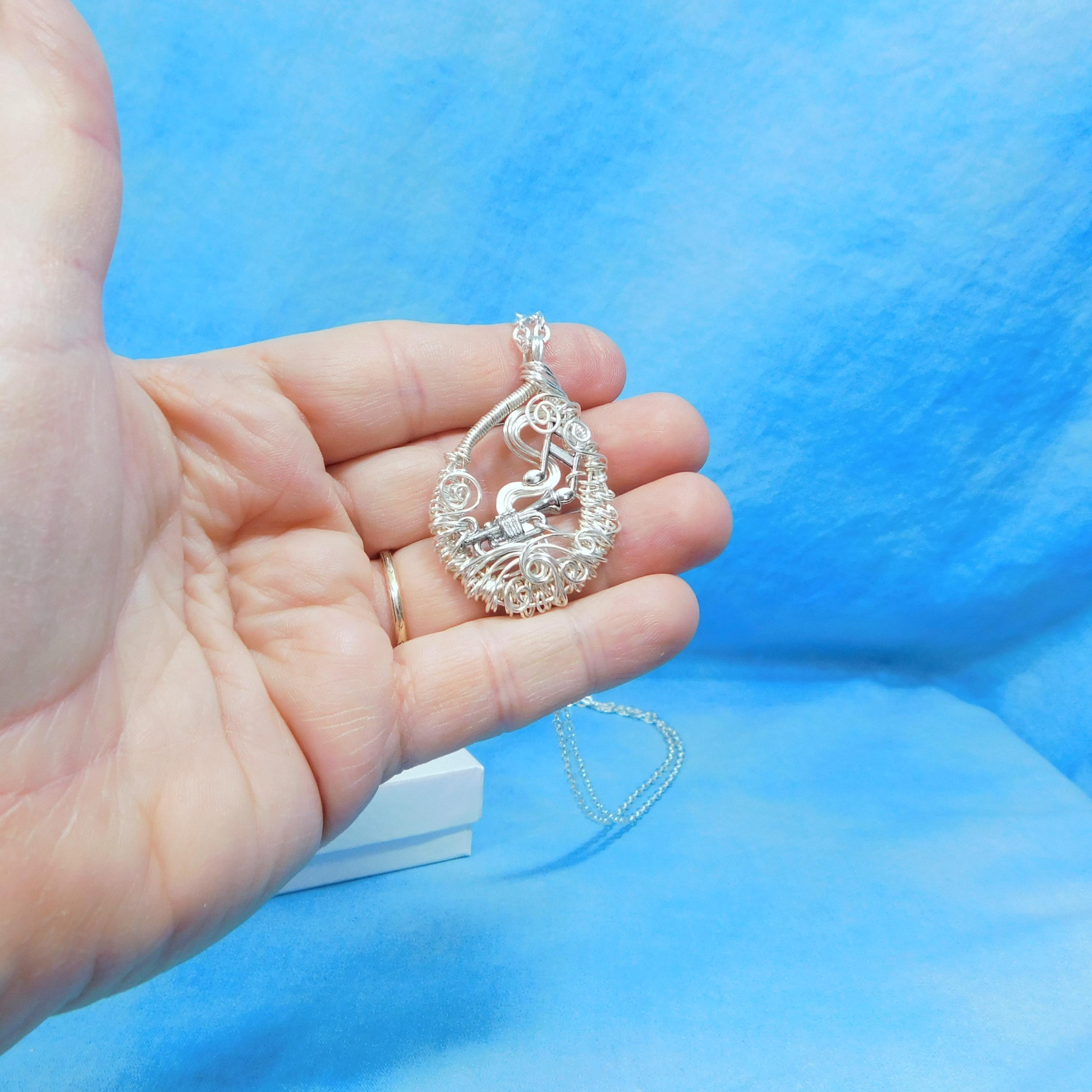 SHIPS FROM THE US! Non tarnish fine silver over copper wire is off-loom hand woven and sculpted to create a 1 1/2 inch by 1 inch frame for an antique silver patina trumpet. Eighth notes embellish the frame and creates a pendant that makes beautiful music.