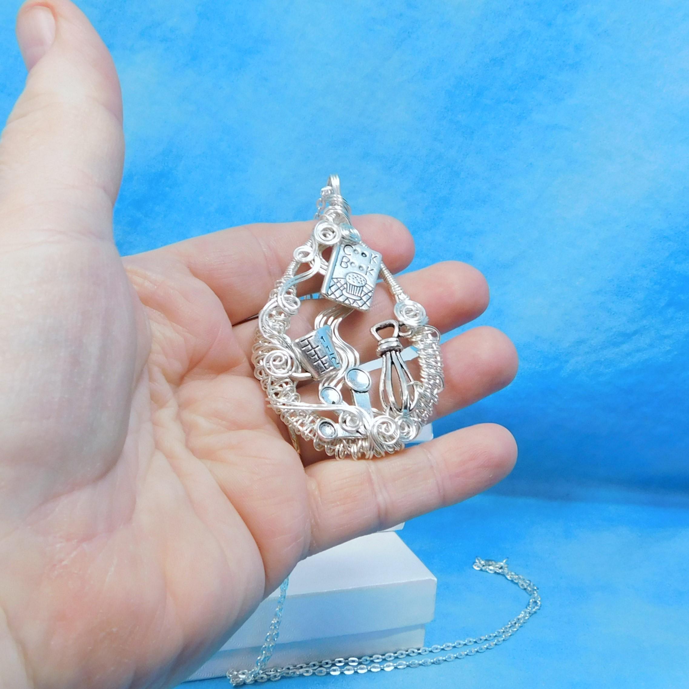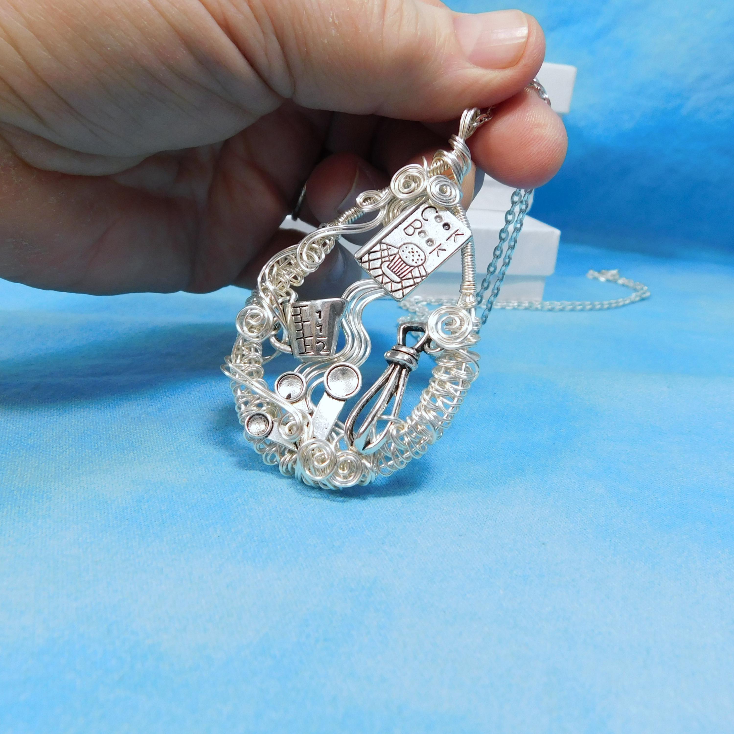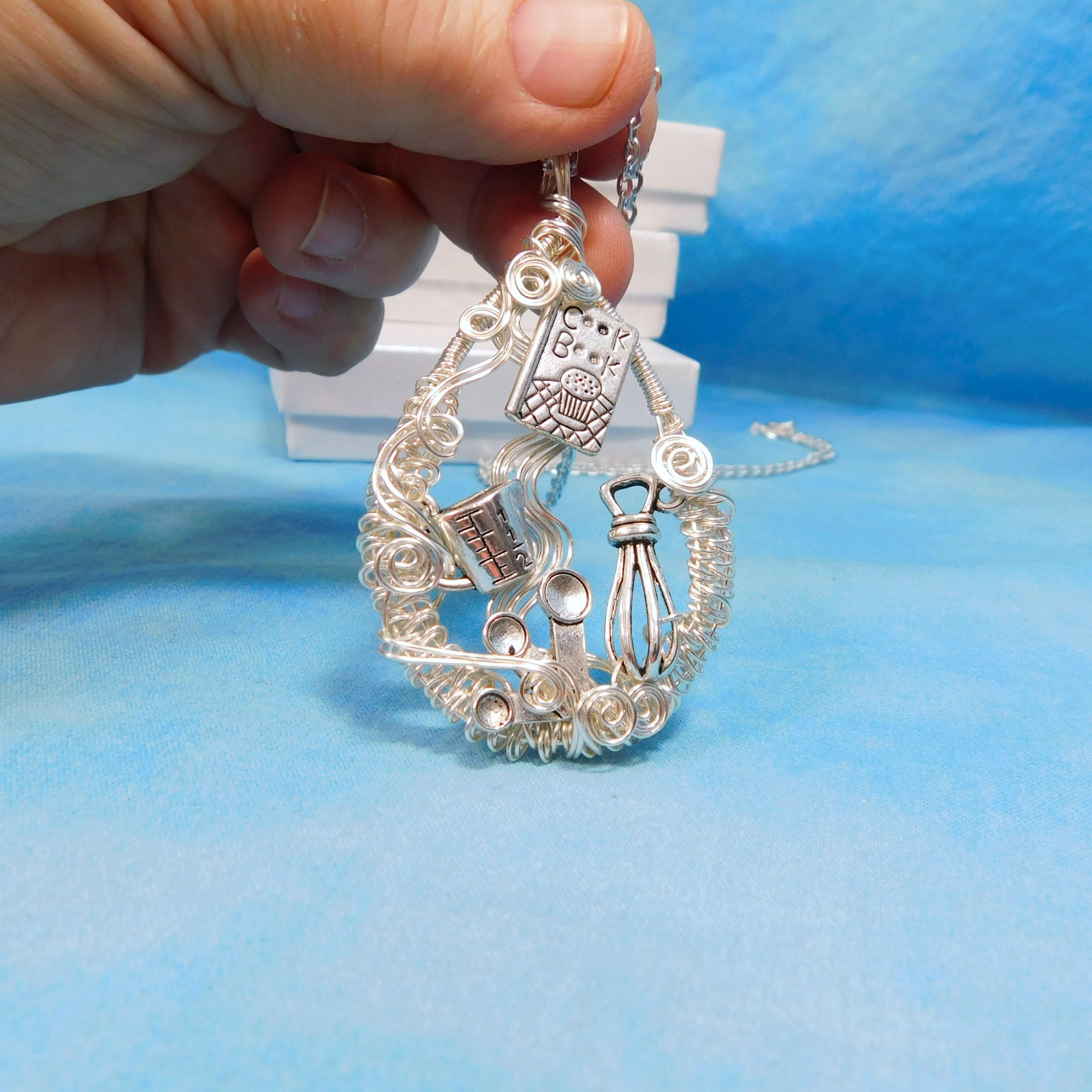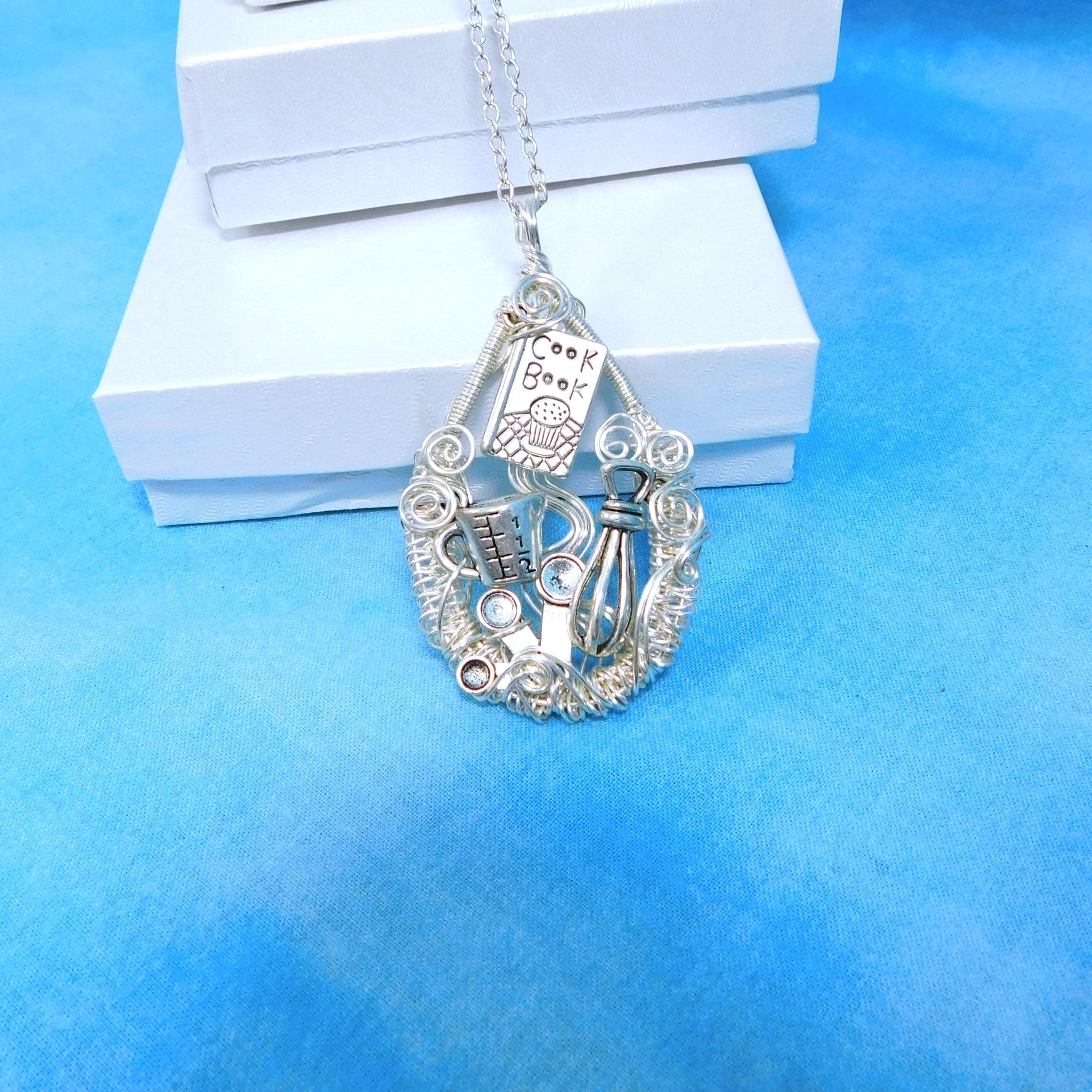 SHIPS FROM THE US! A cookbook, whisk and measuring cups and spoons are artistically framed in meticulously off-loom hand woven non tarnish fine silver over copper wire, creating a pendant fit for the queen of the kitchen.