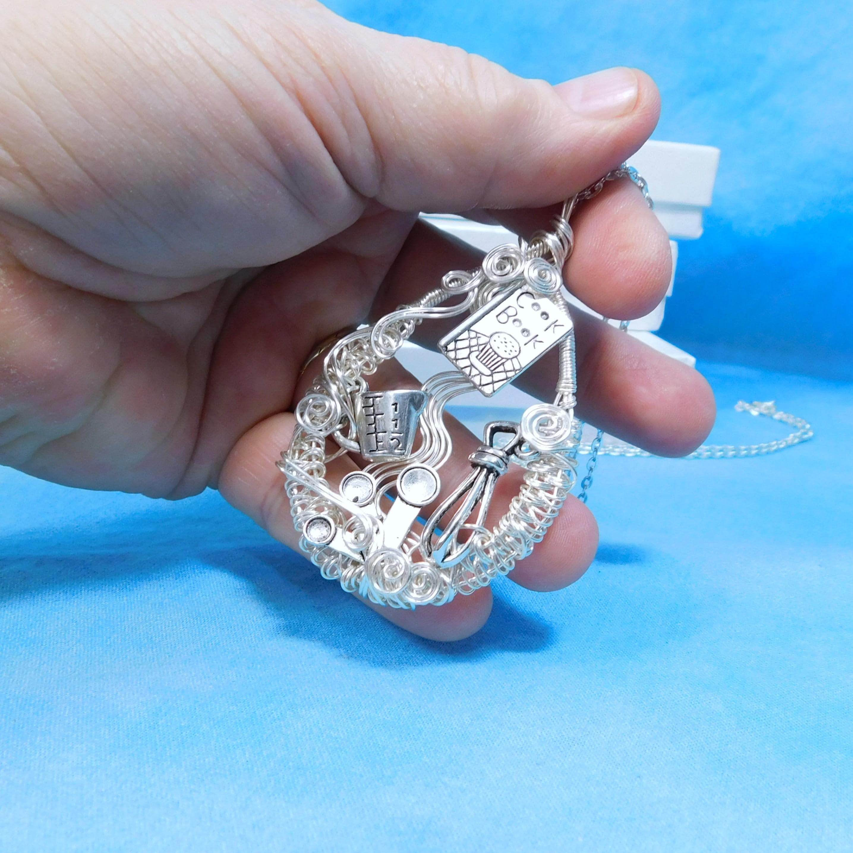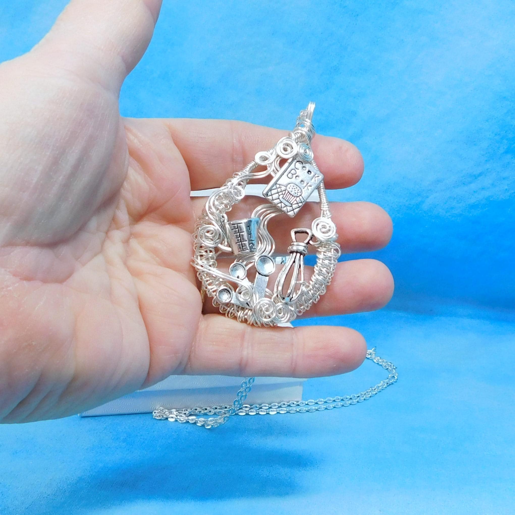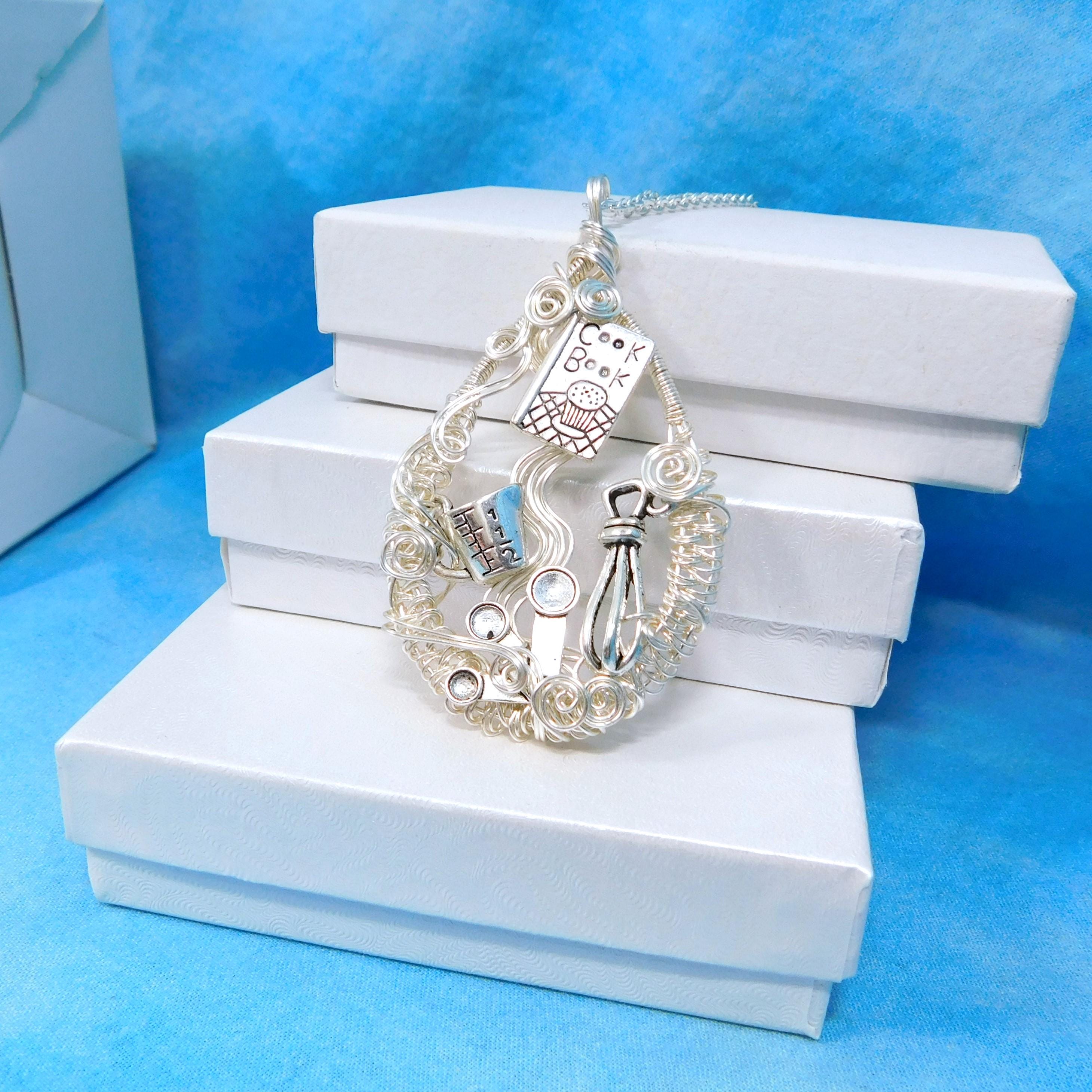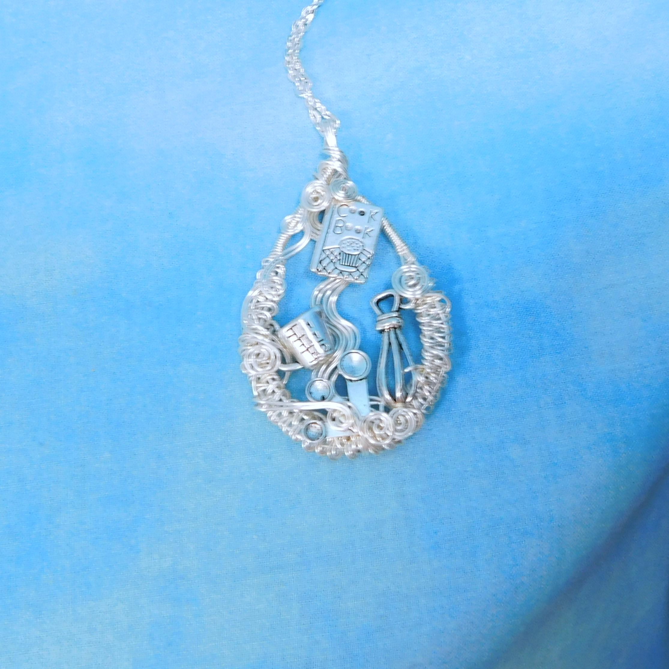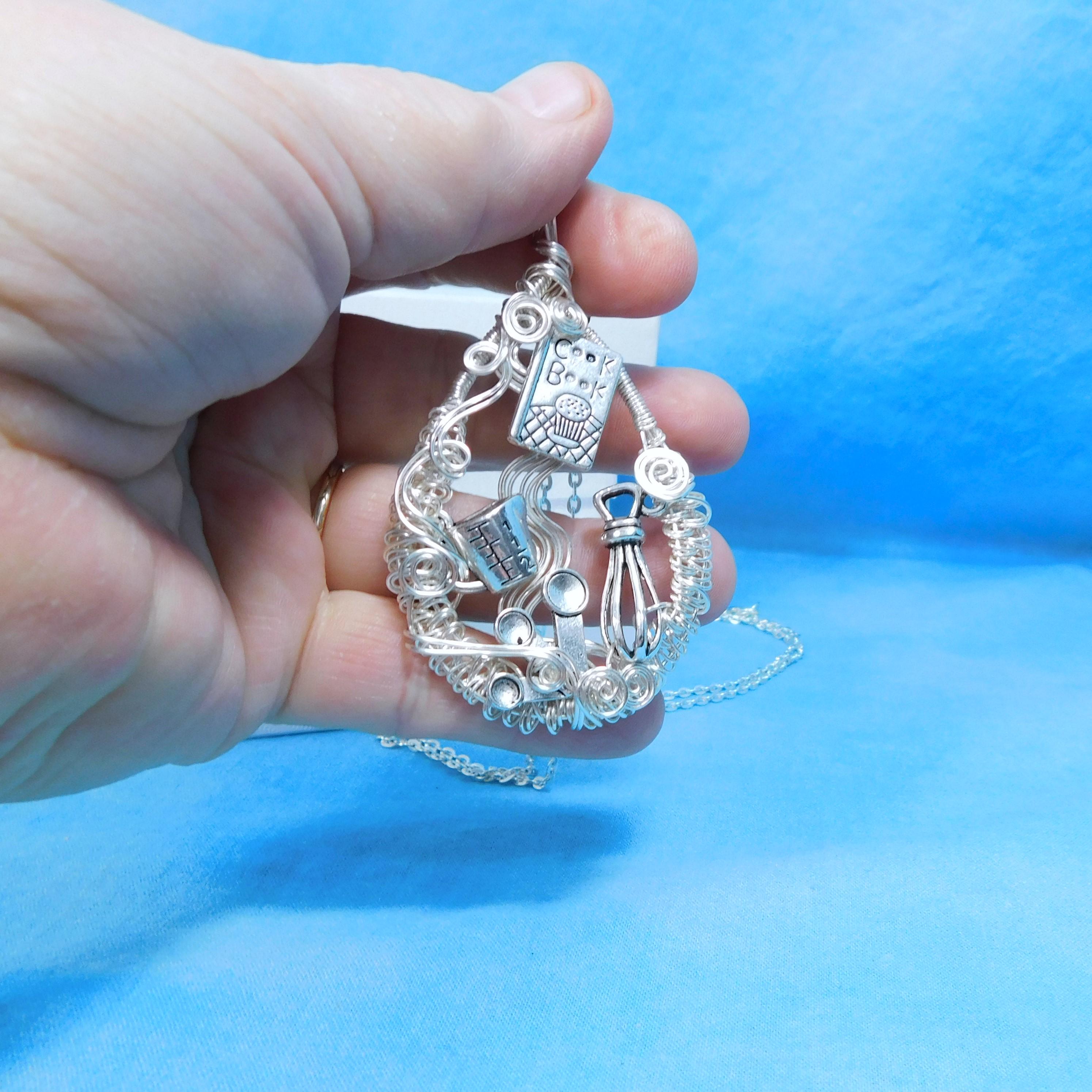 SHIPS FROM THE US! A cookbook, whisk and measuring cups and spoons are artistically framed in meticulously off-loom hand woven non tarnish fine silver over copper wire, creating a pendant fit for the queen of the kitchen.