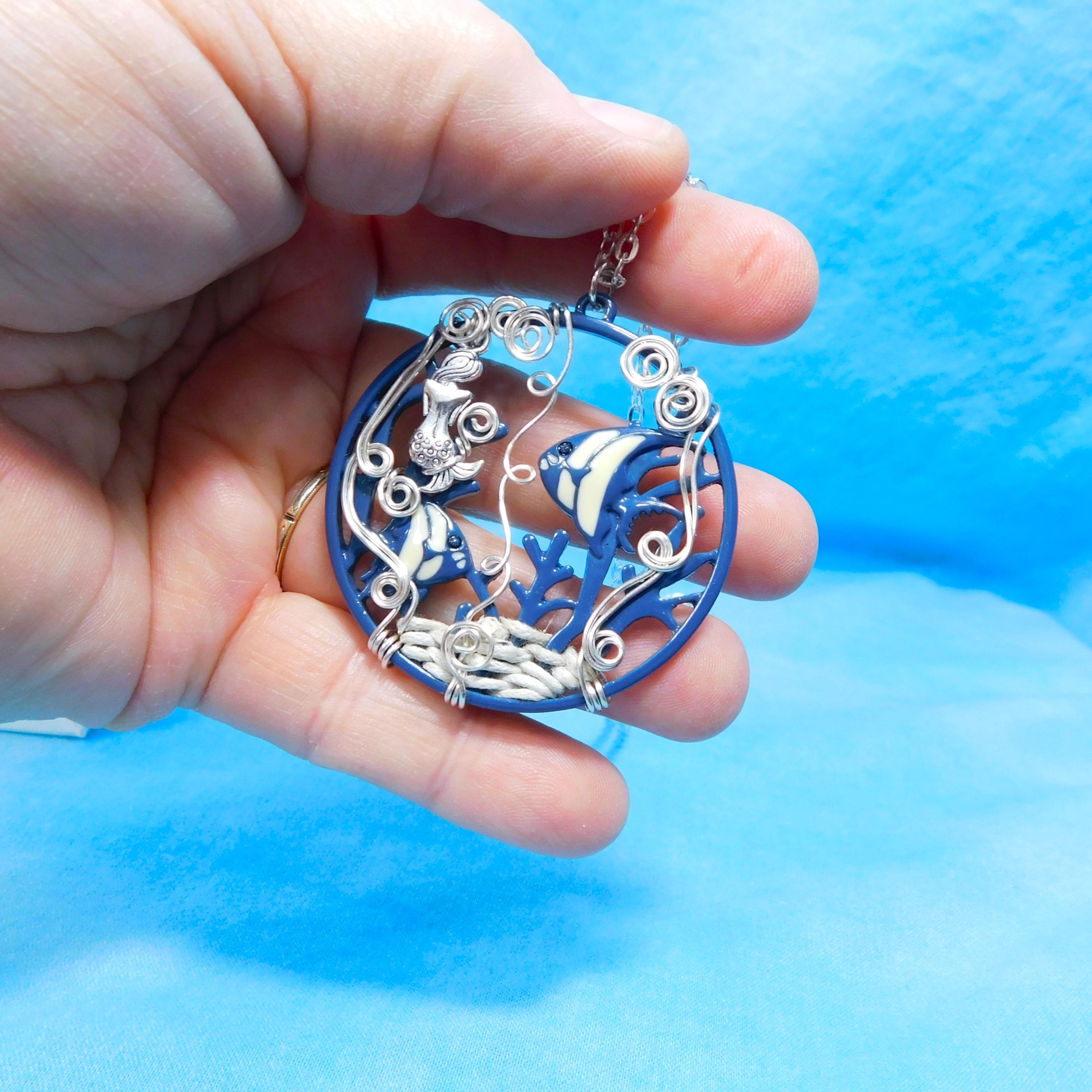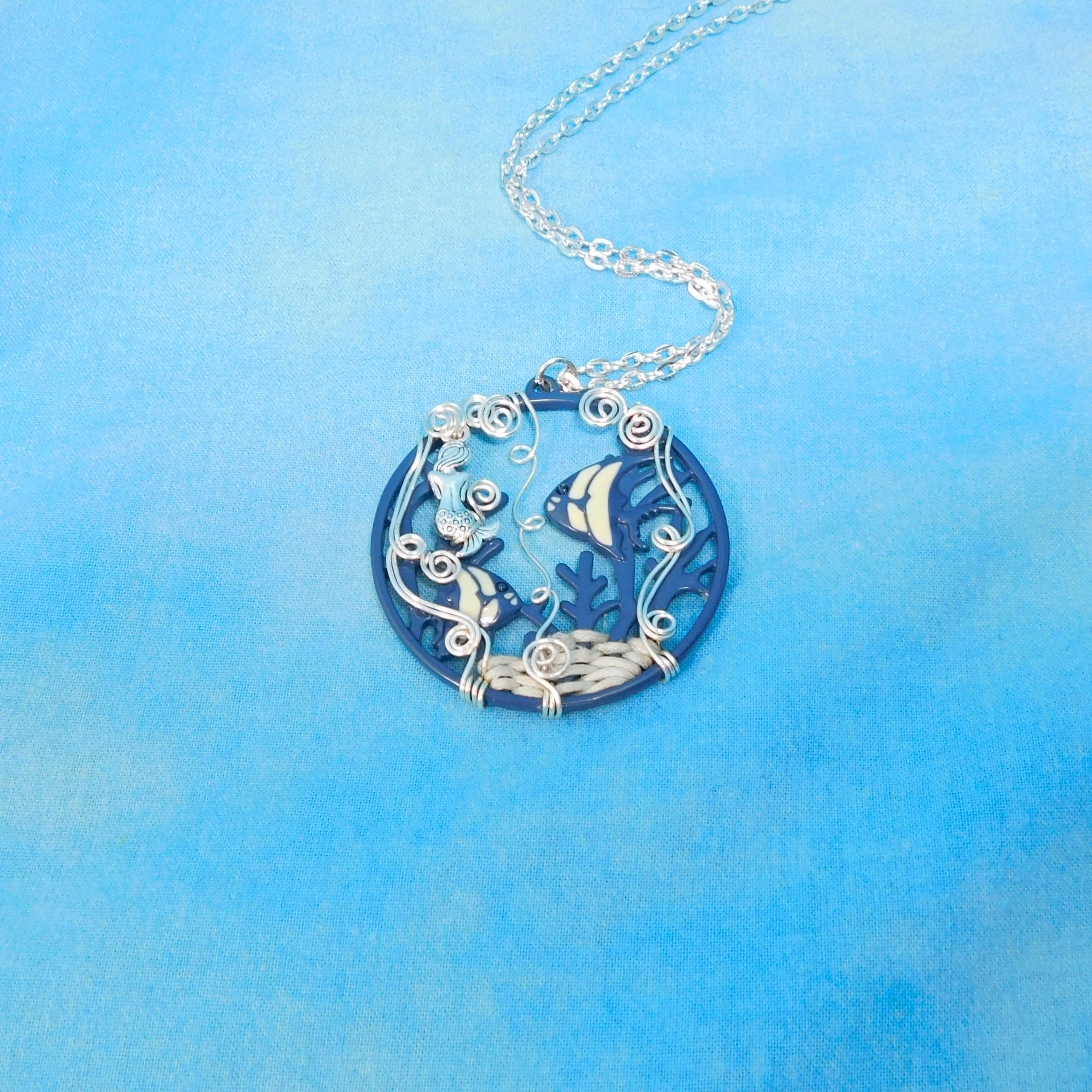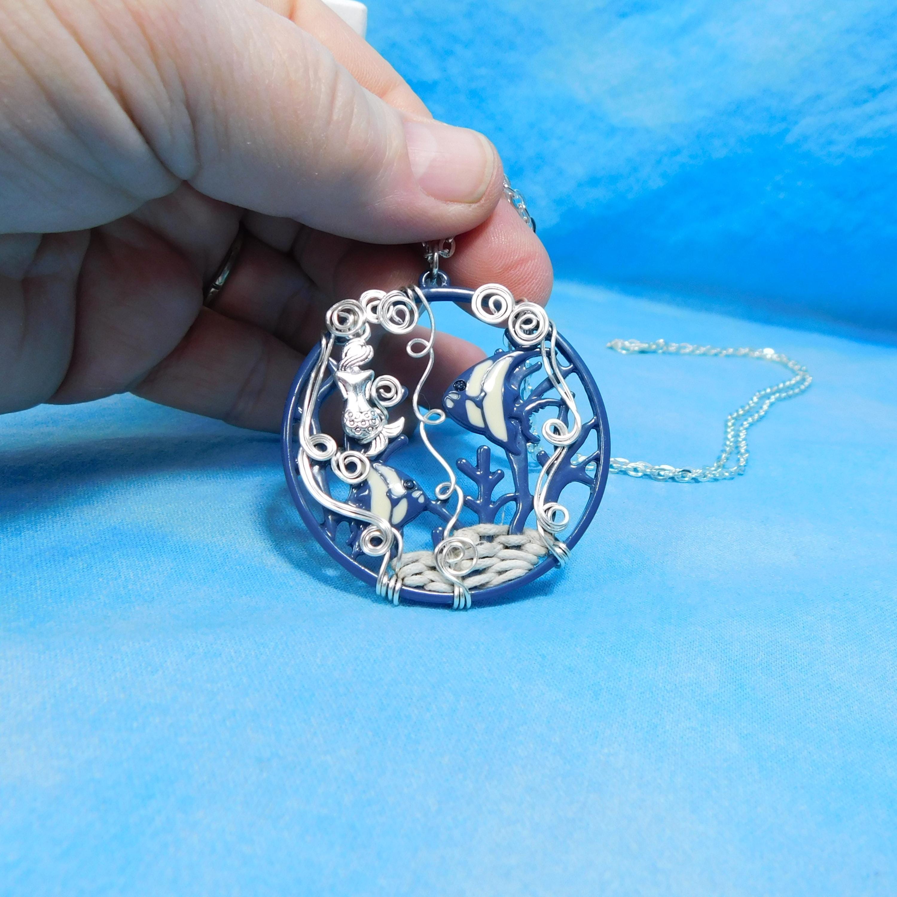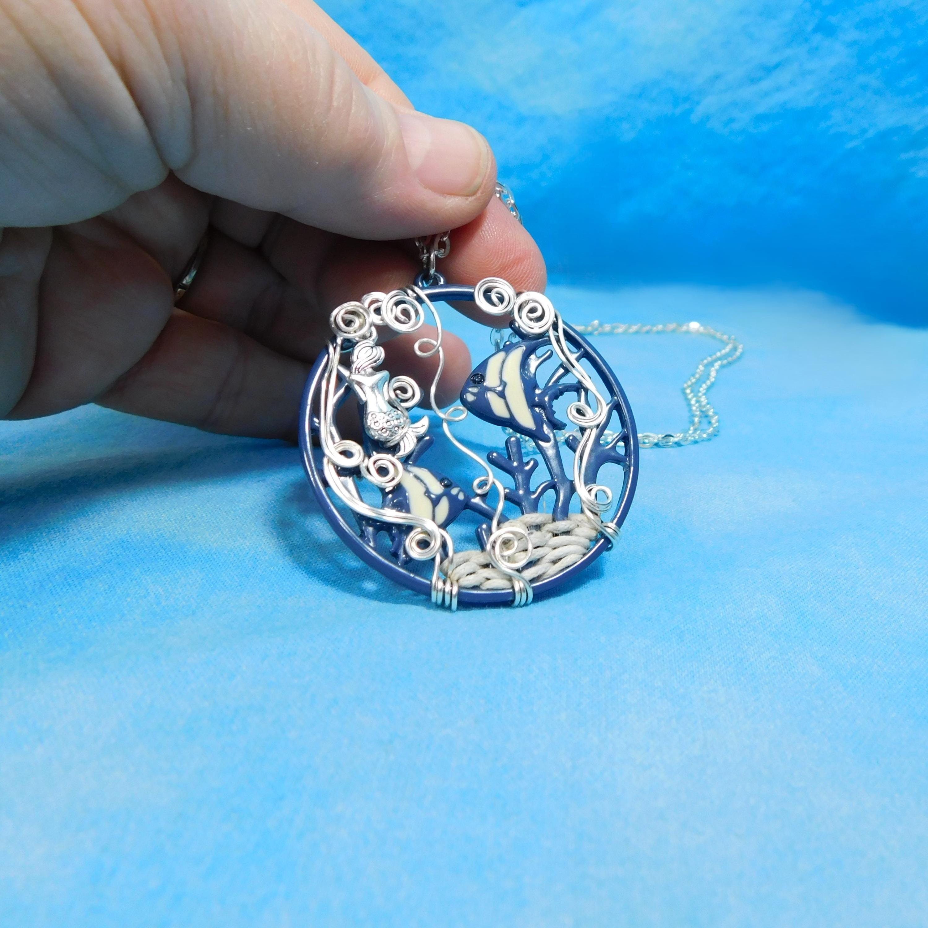 SHIPS FROM THE US! A tiny mermaid sits wistfully dreaming among swimming fish in this 1 3/4 inch round pendant. Sculpted seaweed made from non tarnish fine silver over copper wire, adds dimension to the underwater scene.