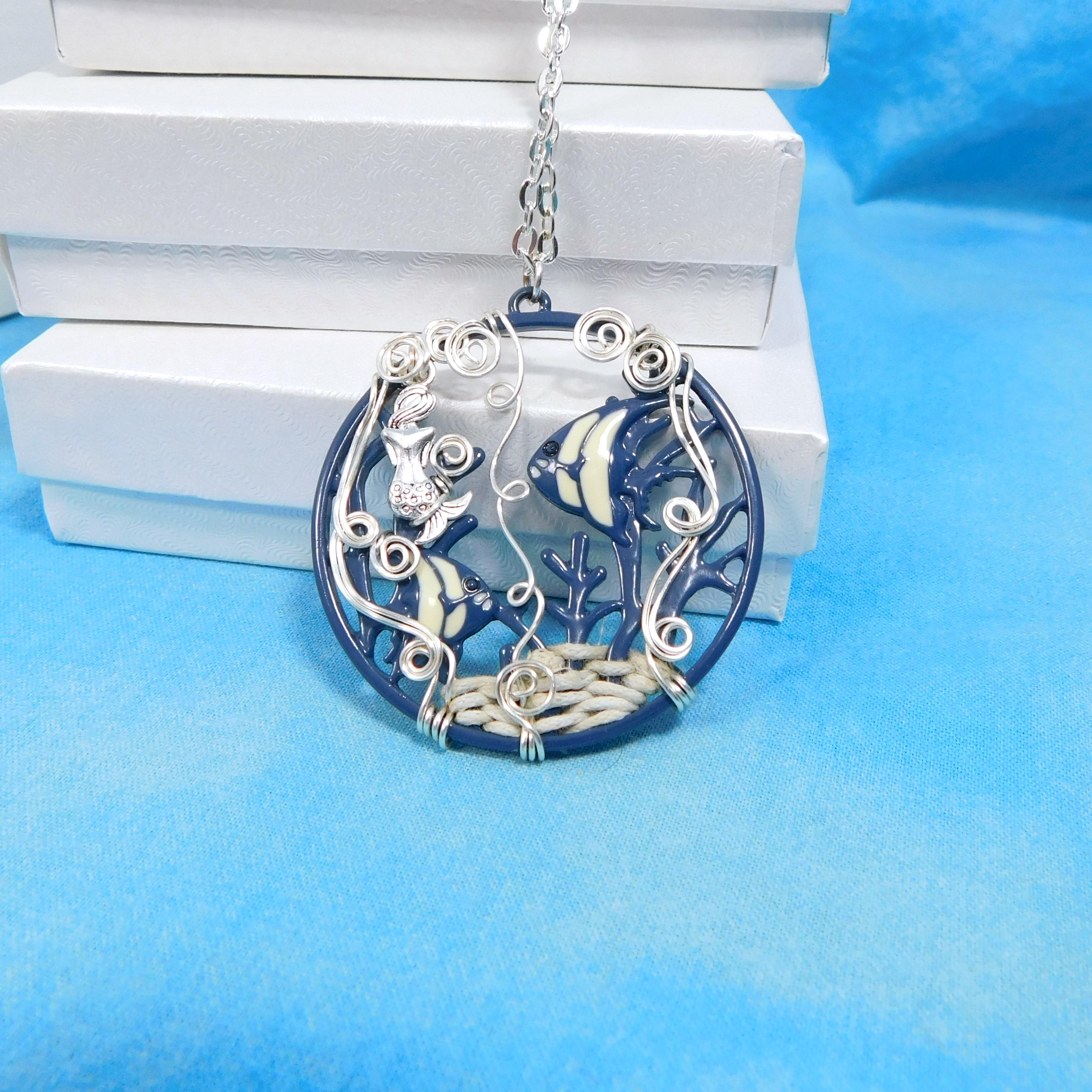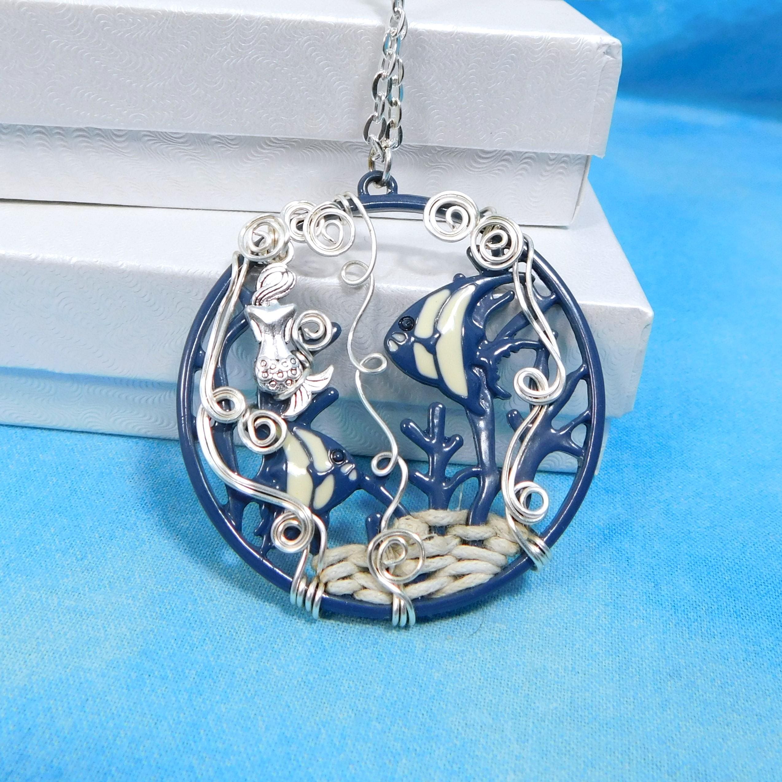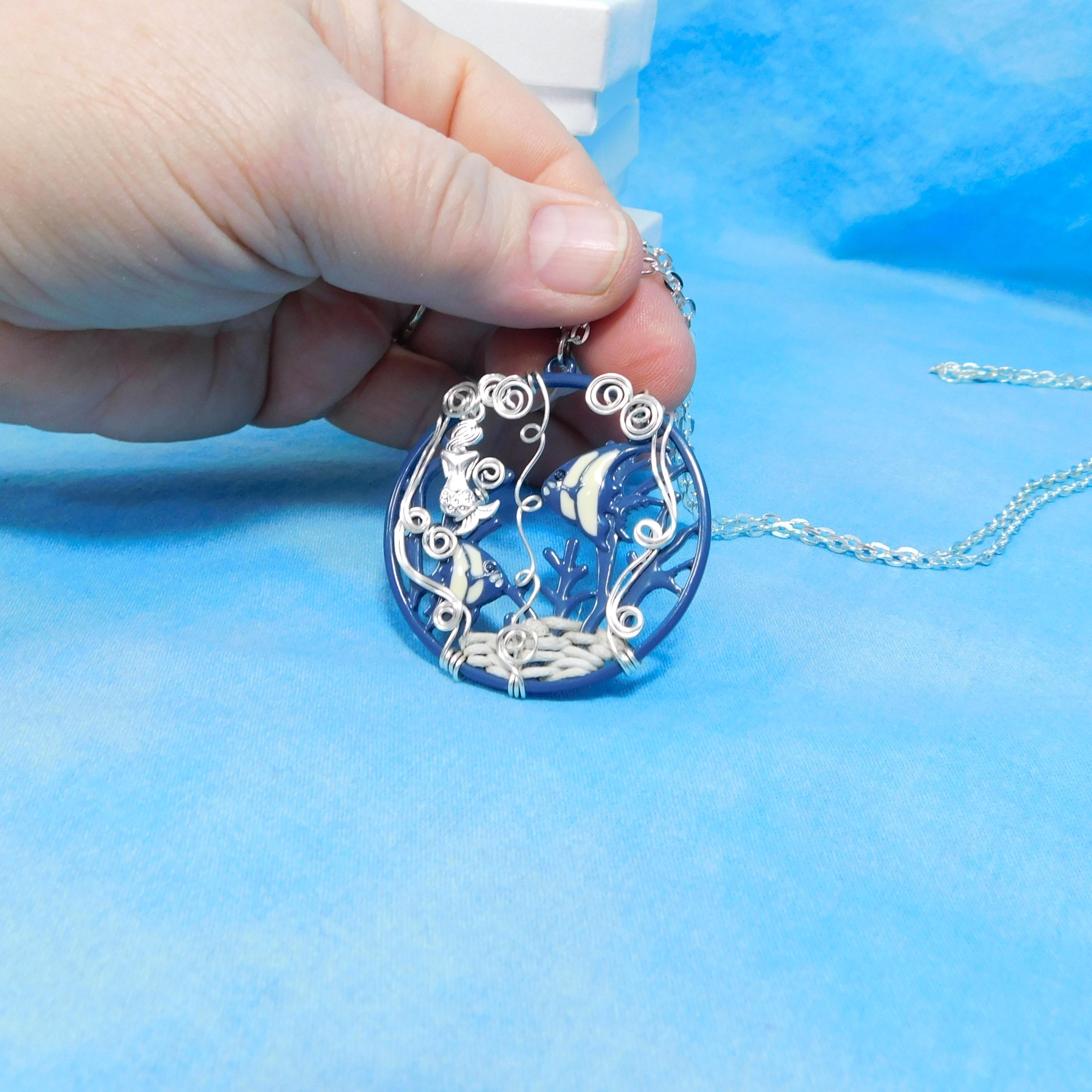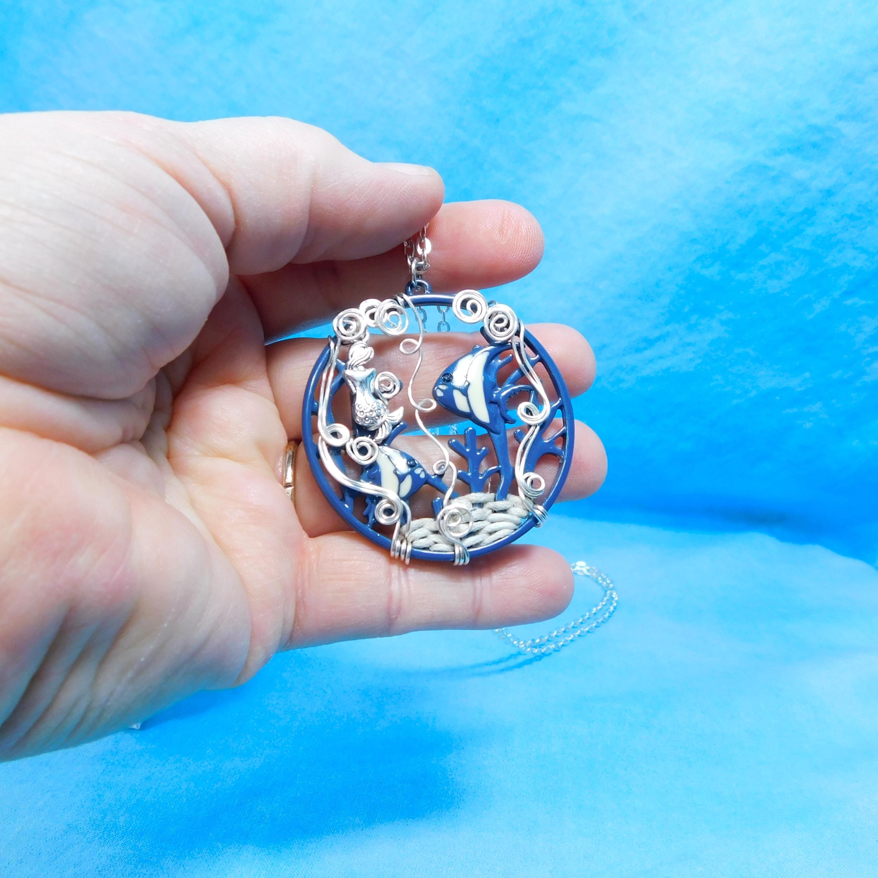 SHIPS FROM THE US! A tiny mermaid sits wistfully dreaming among swimming fish in this 1 3/4 inch round pendant. Sculpted seaweed made from non tarnish fine silver over copper wire, adds dimension to the underwater scene.