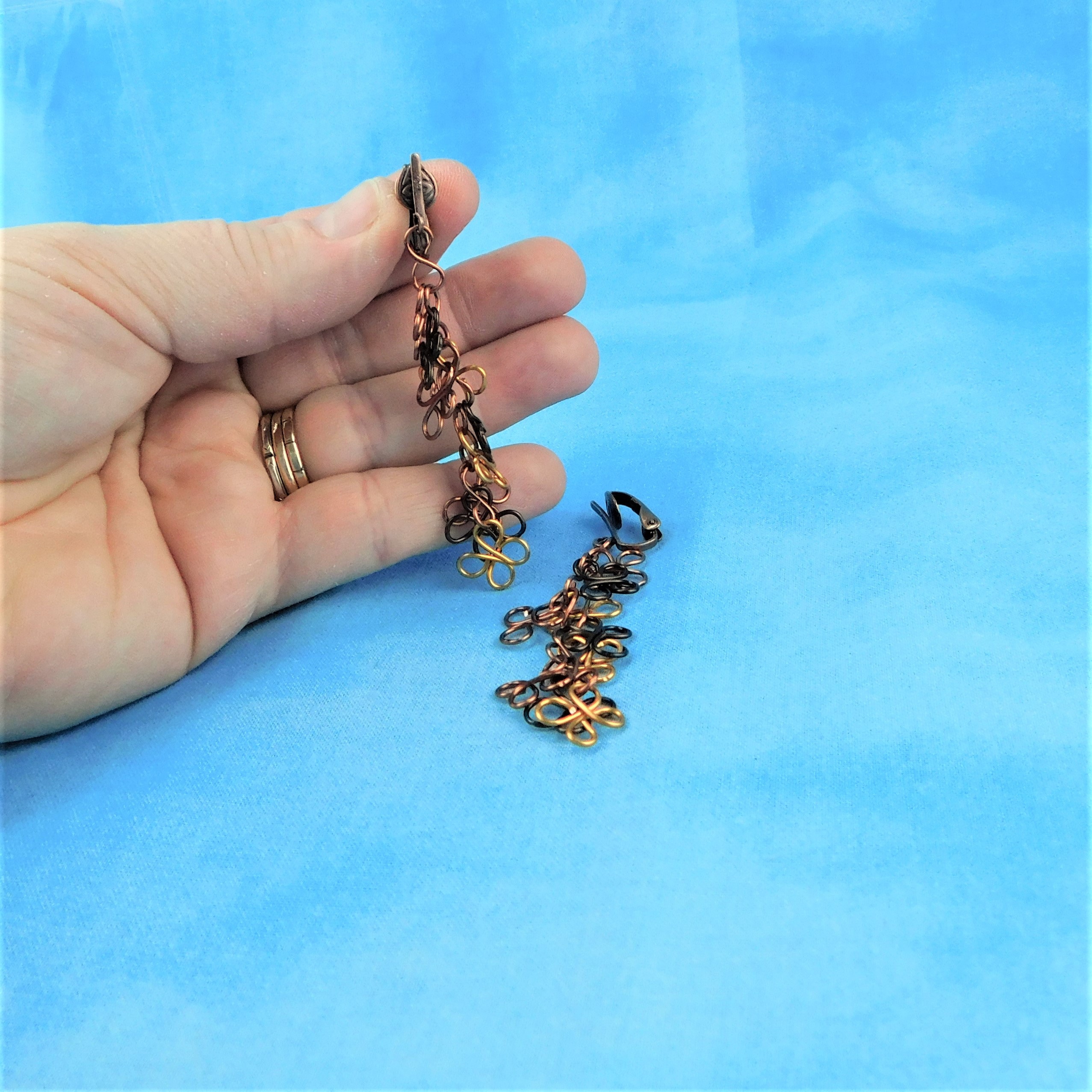 SHIPS FROM THE US! Tiny wire sculpted copper flowers in three shades of copper wire, fall in a 2 inch cascade from antique copper colored pierced-look clip-on ear clips. The clips are comfortable and fun, and no one would ever guess your ears are not pierced.