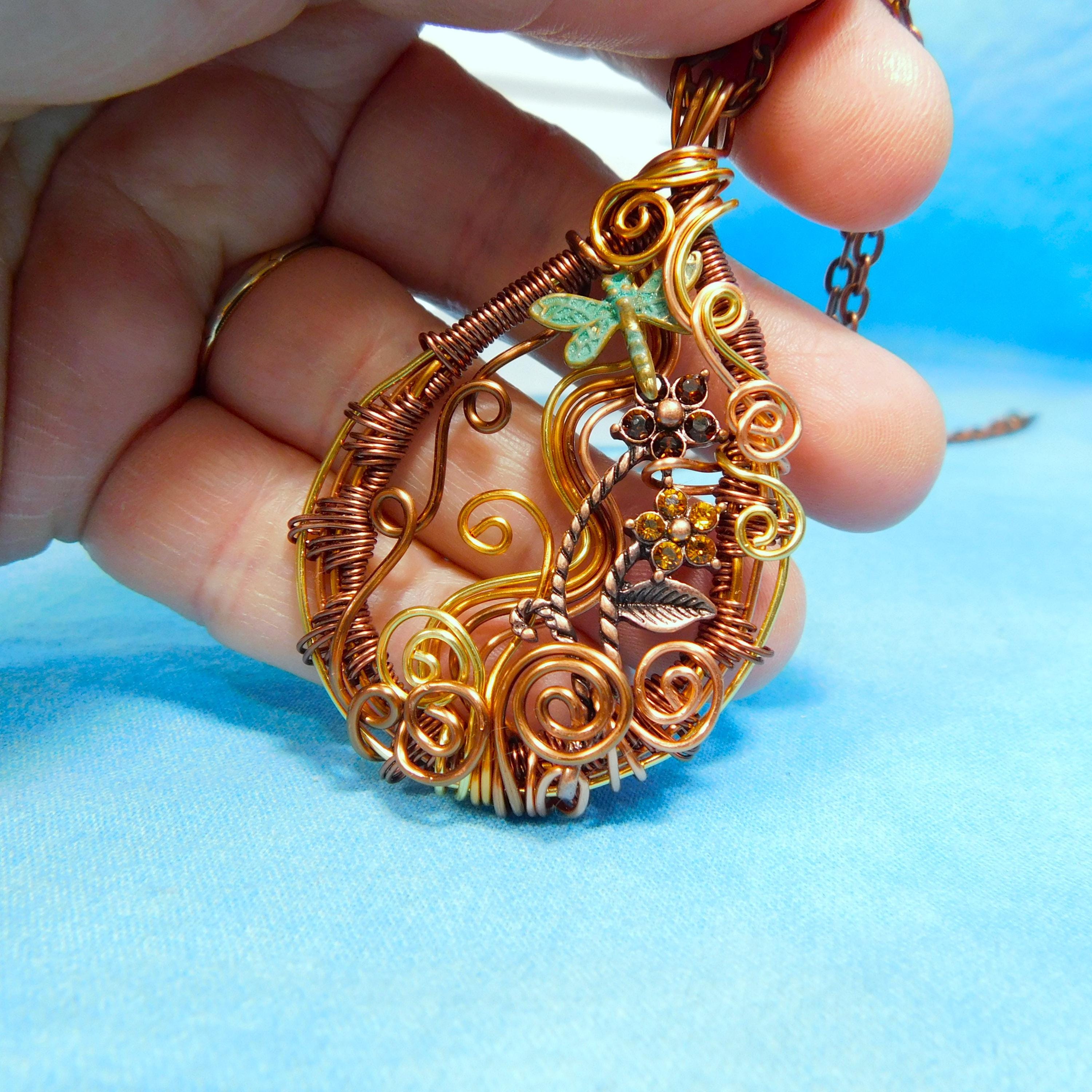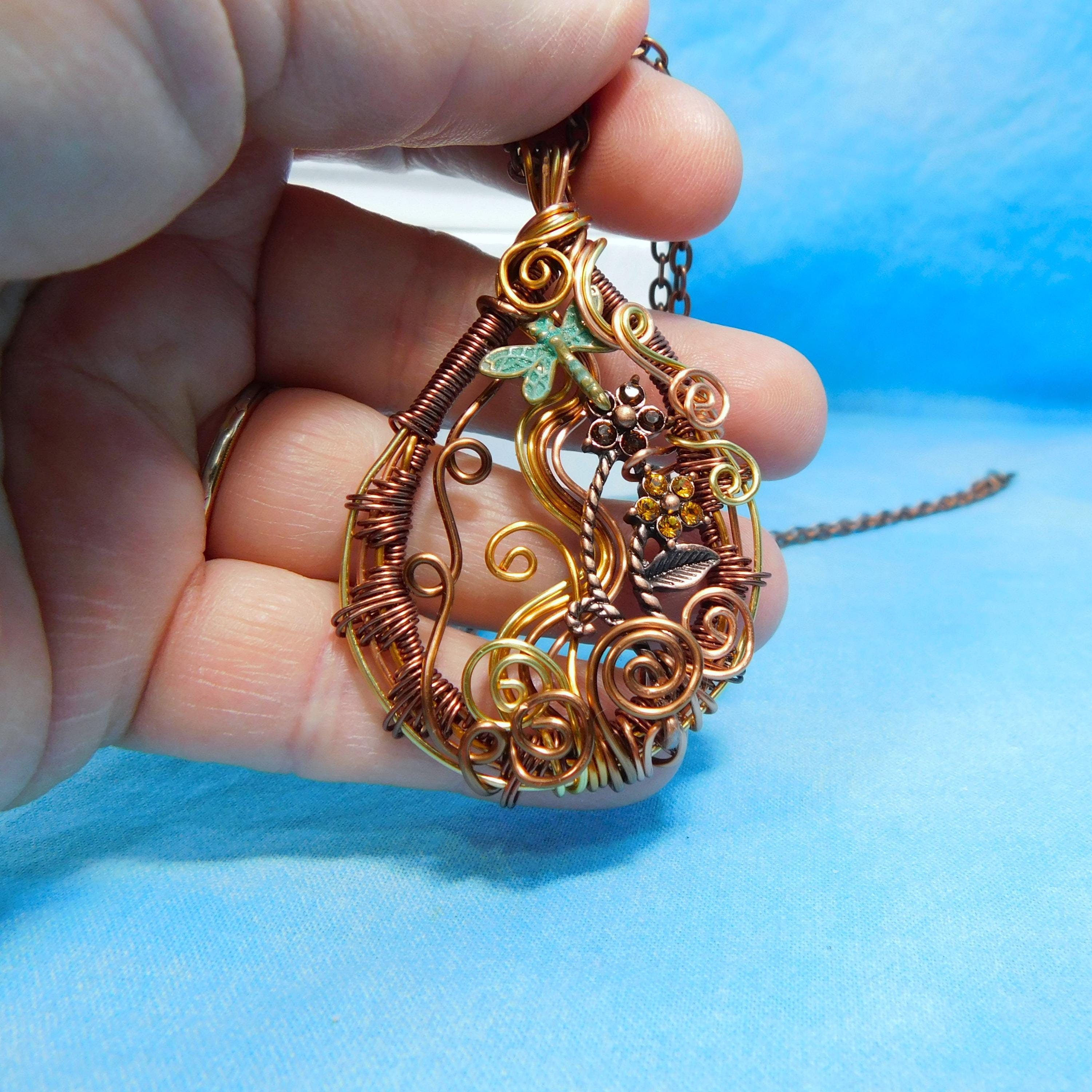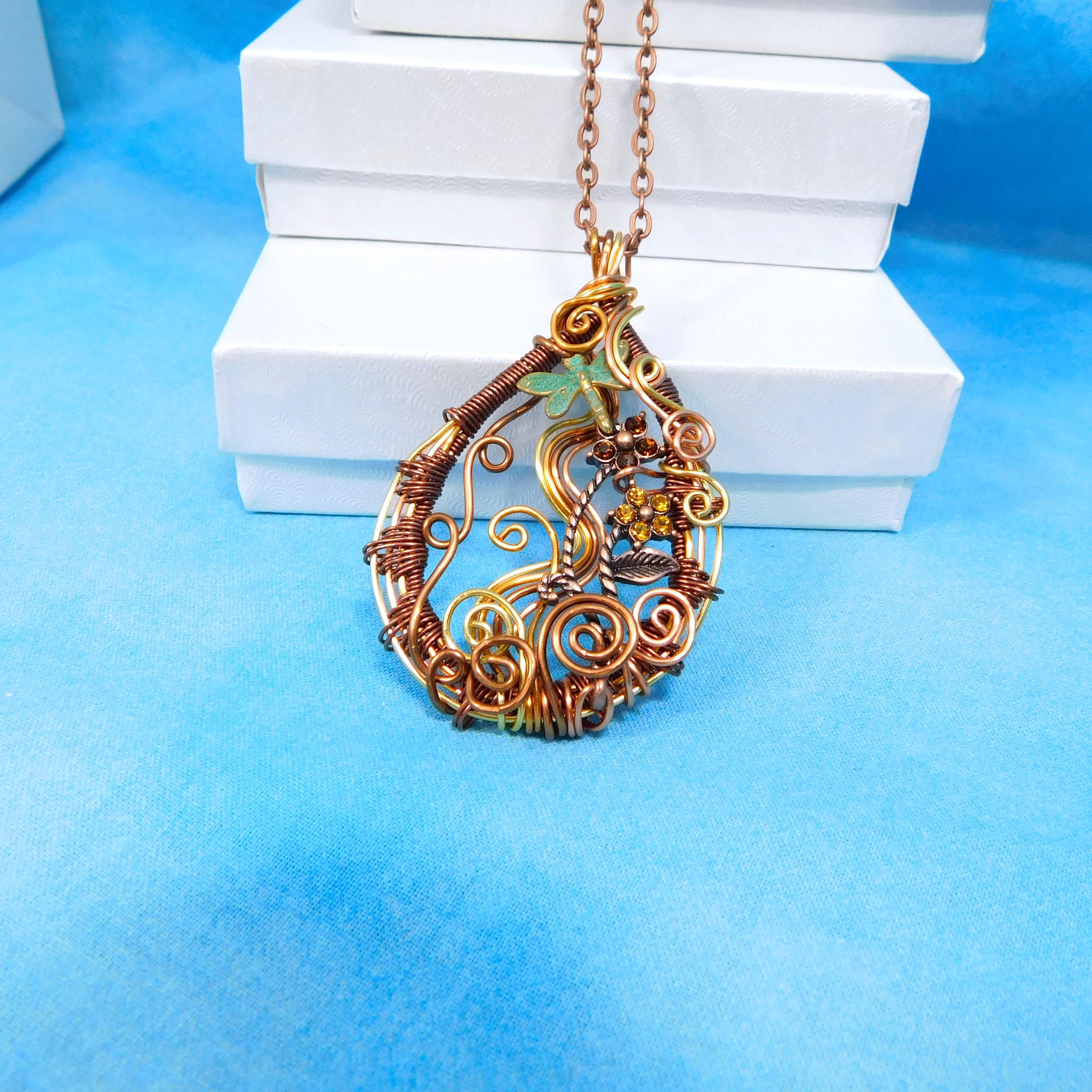 SHIPS FROM THE US! Three different shades of non tarnish copper wire are hand woven and sculpted into a 2 inch by 1 1/2 inch pendant with small dragonfly and crystal flower embellishments. This small pendant is just the touch needed for a spring outfit. It could also be a memorial reminder of a loved one dearly missed.