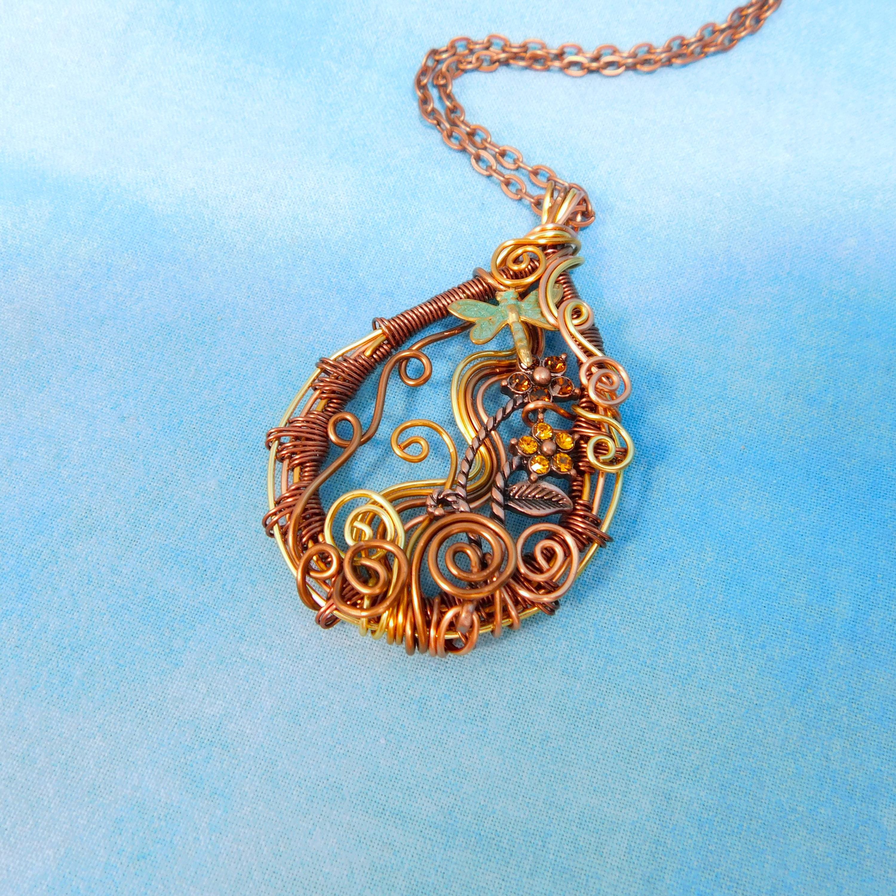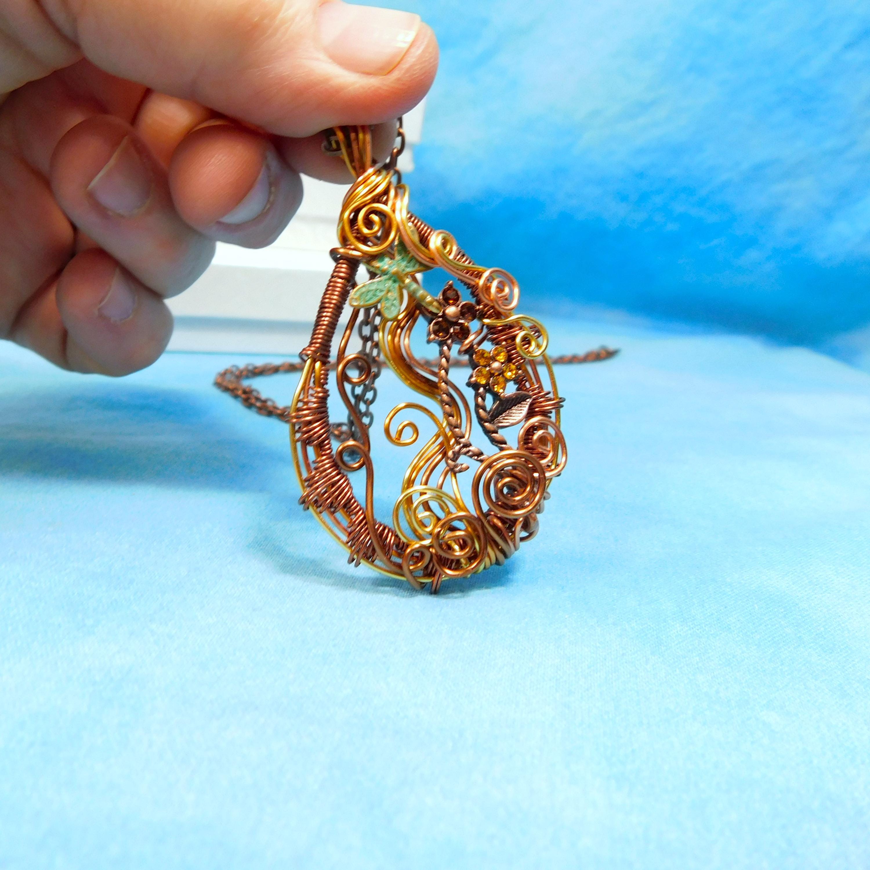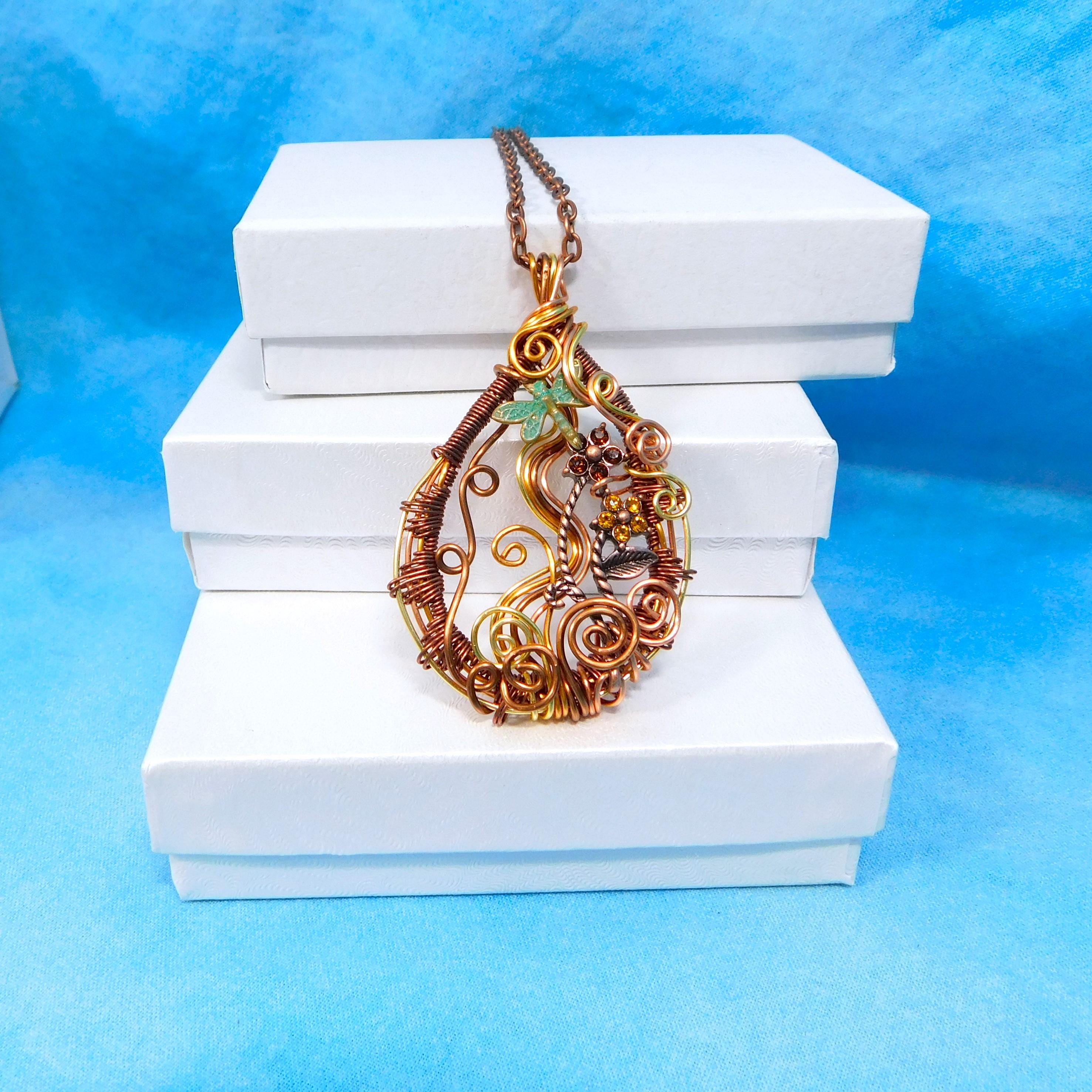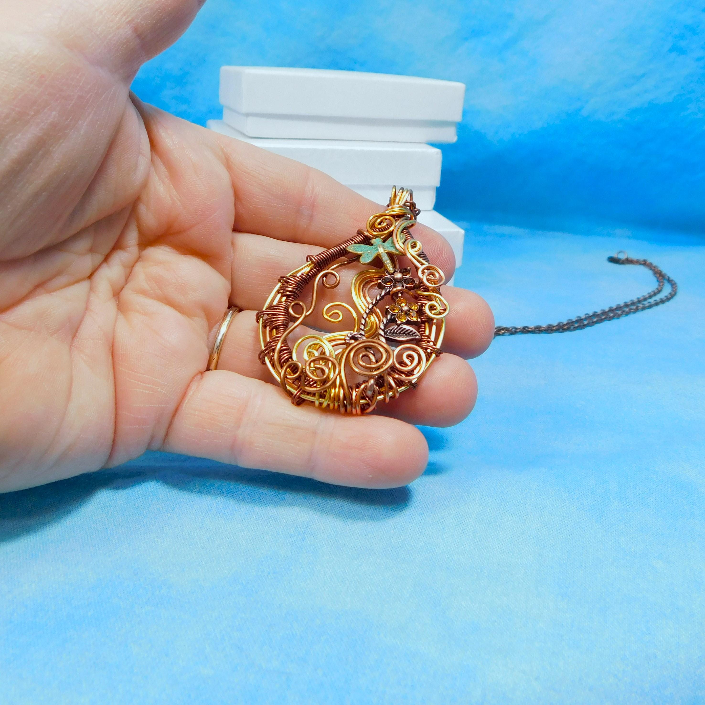 SHIPS FROM THE US! Three different shades of non tarnish copper wire are hand woven and sculpted into a 2 inch by 1 1/2 inch pendant with small dragonfly and crystal flower embellishments. This small pendant is just the touch needed for a spring outfit. It could also be a memorial reminder of a loved one dearly missed.