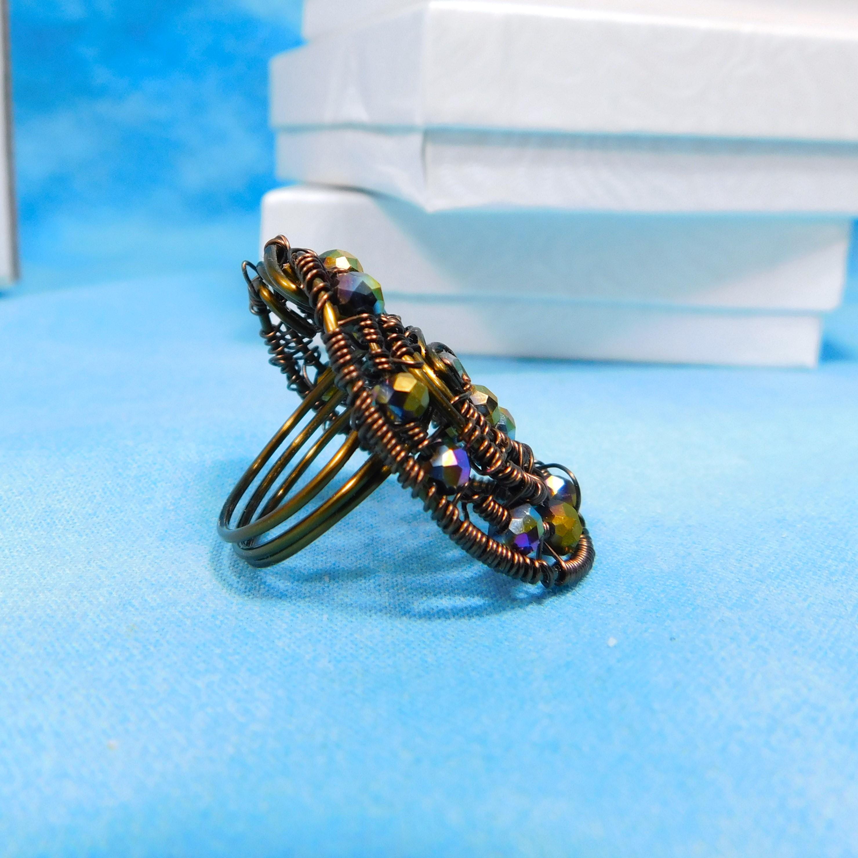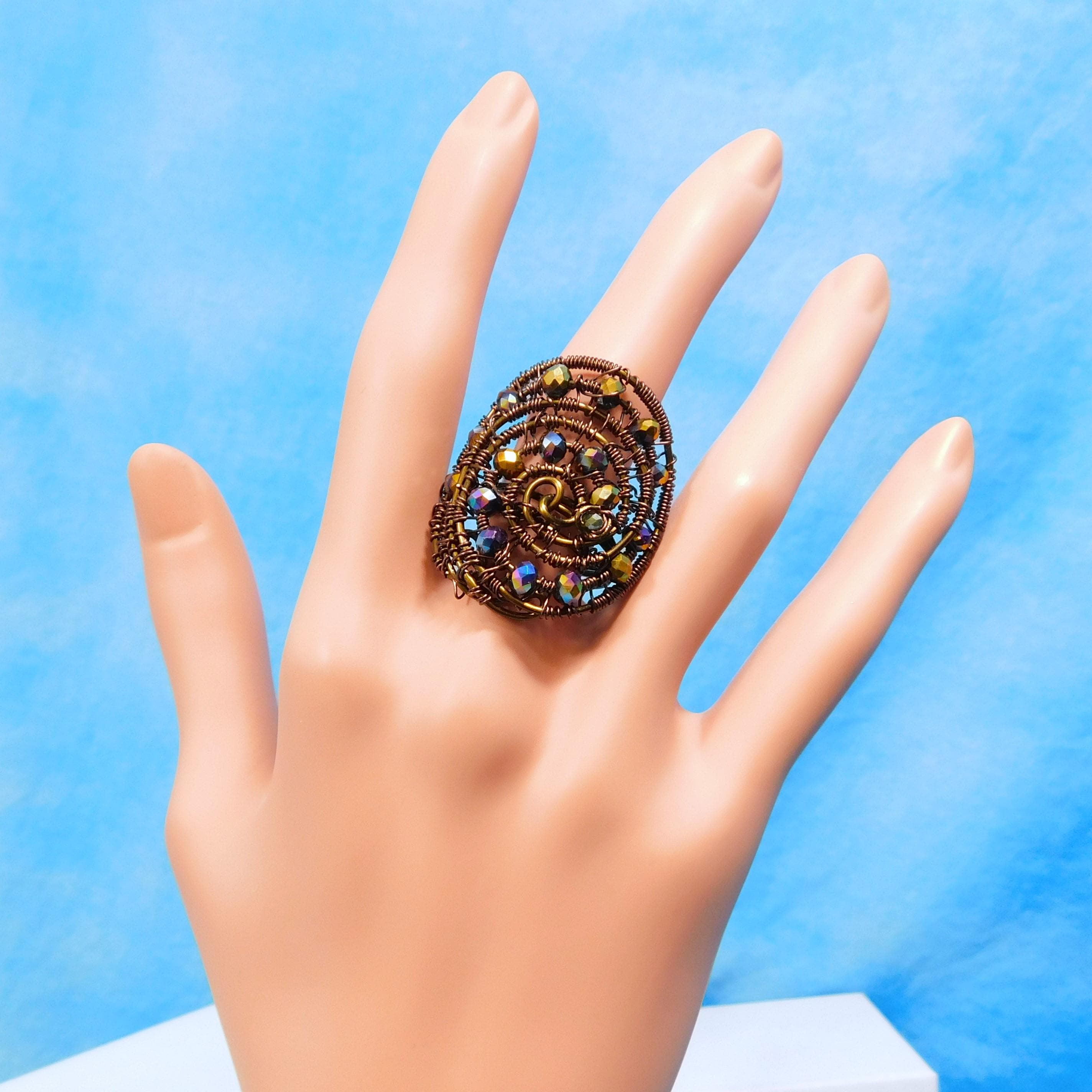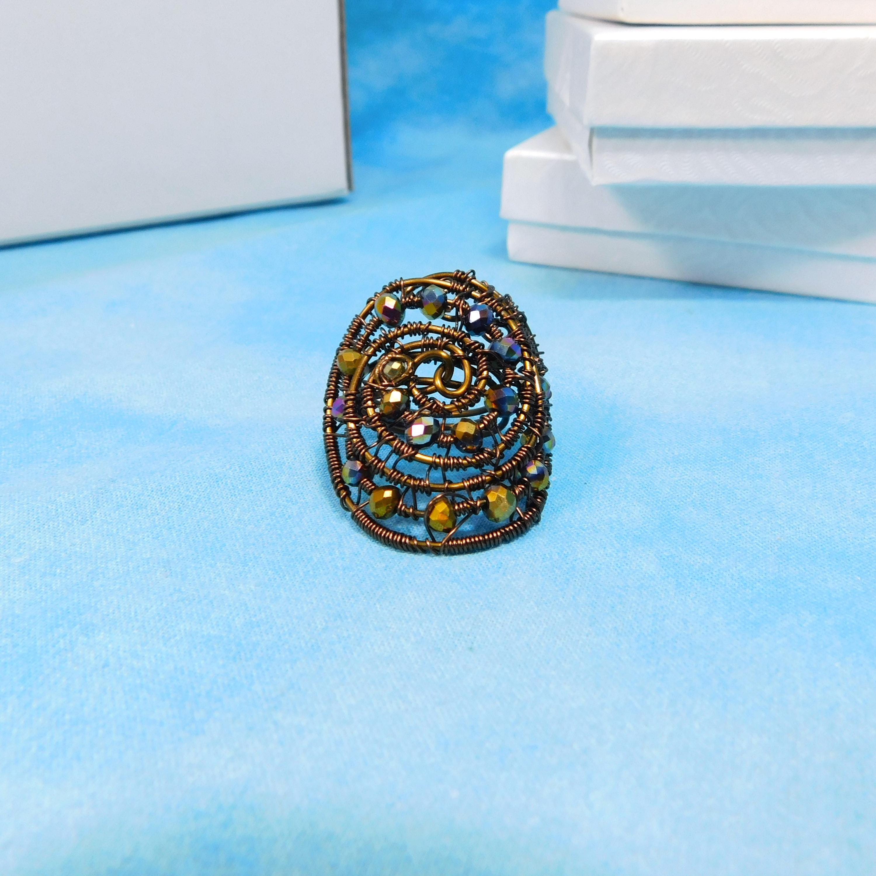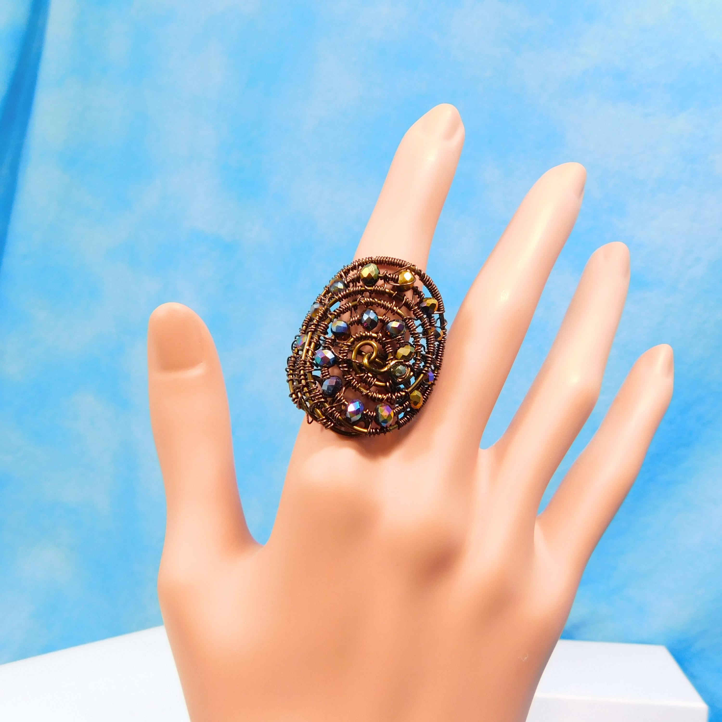 SHIPS FROM THE US! This unique ring is hand woven and sculpted out of non tarnish bronze tone copper wire, beaded with small dark colored crystals in a spiral design to fit a size 7 finger. It is elegant and bold. The ring is prepared for shipment the day the order is received.