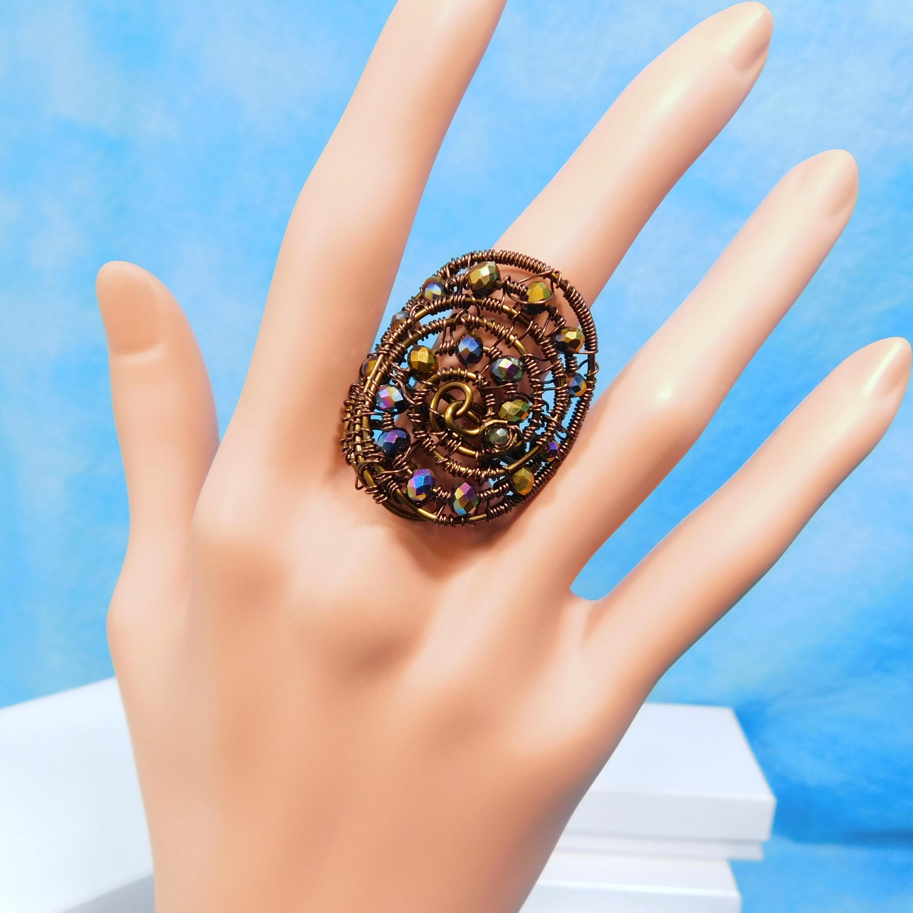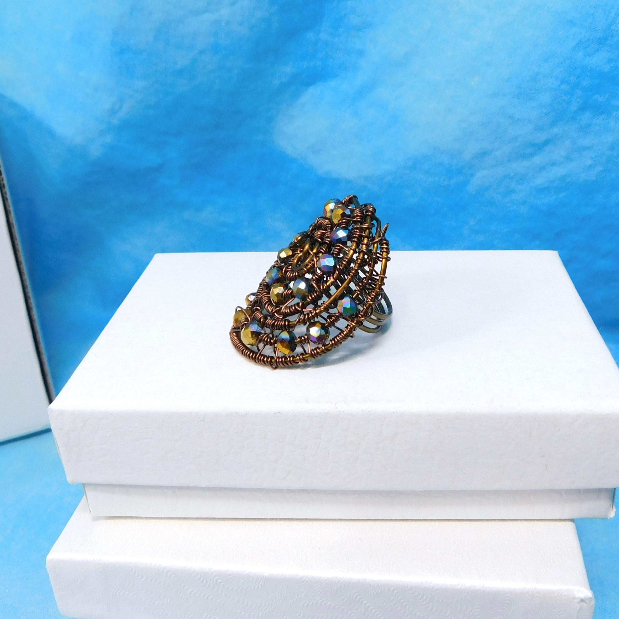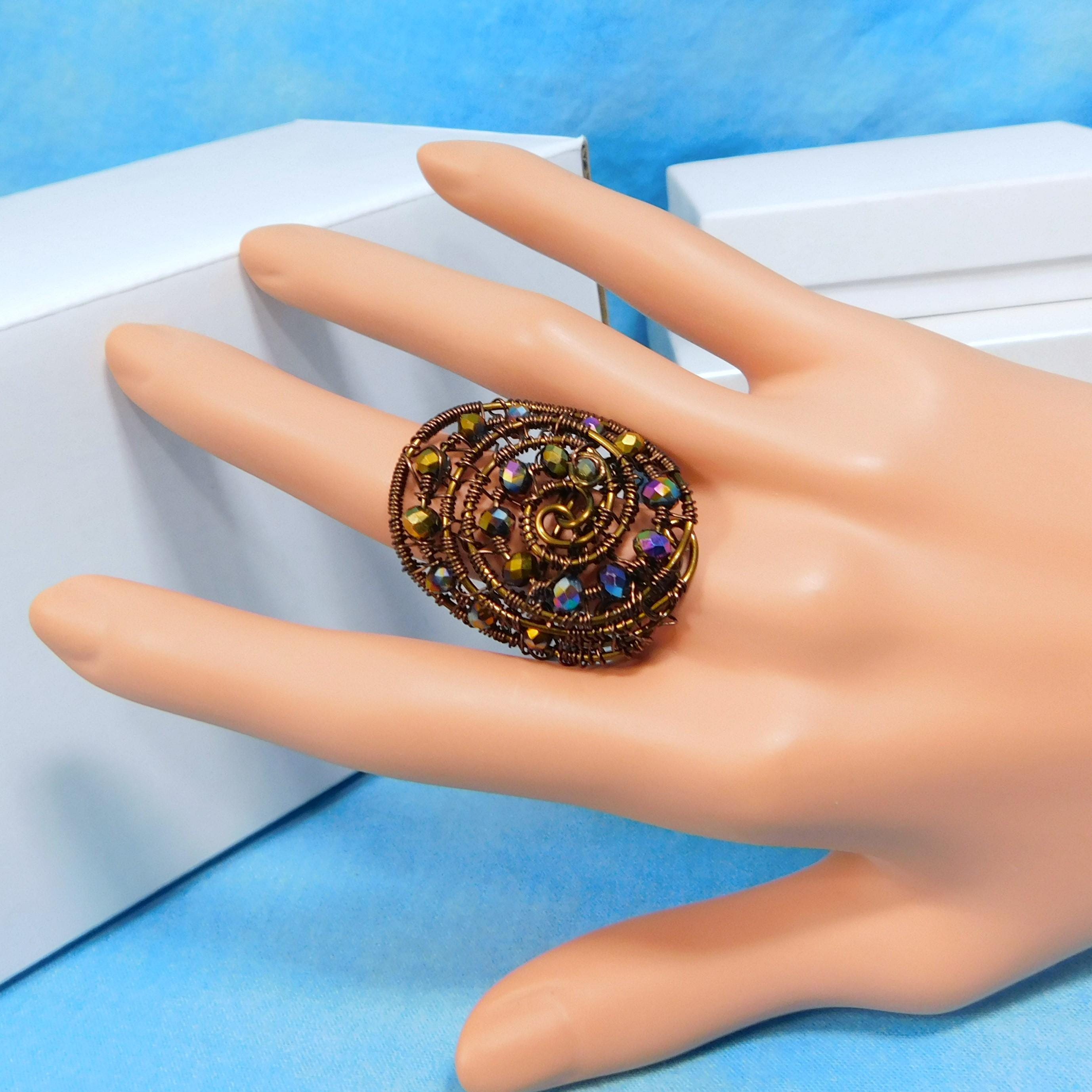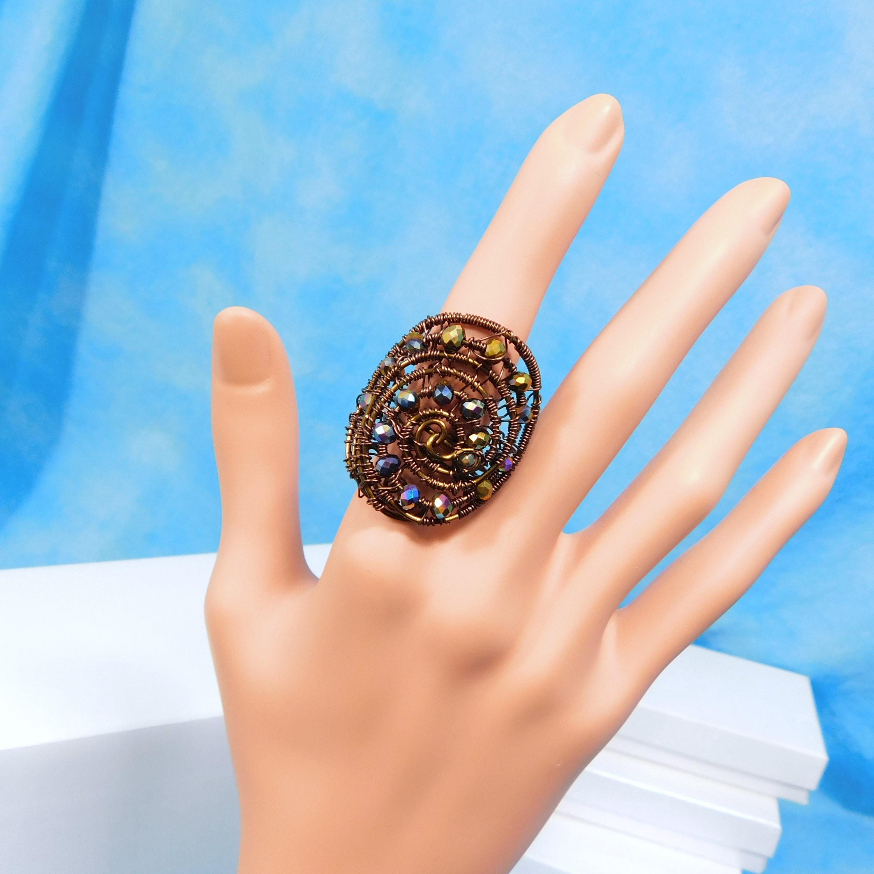 SHIPS FROM THE US! This unique ring is hand woven and sculpted out of non tarnish bronze tone copper wire, beaded with small dark colored crystals in a spiral design to fit a size 7 finger. It is elegant and bold. The ring is prepared for shipment the day the order is received.