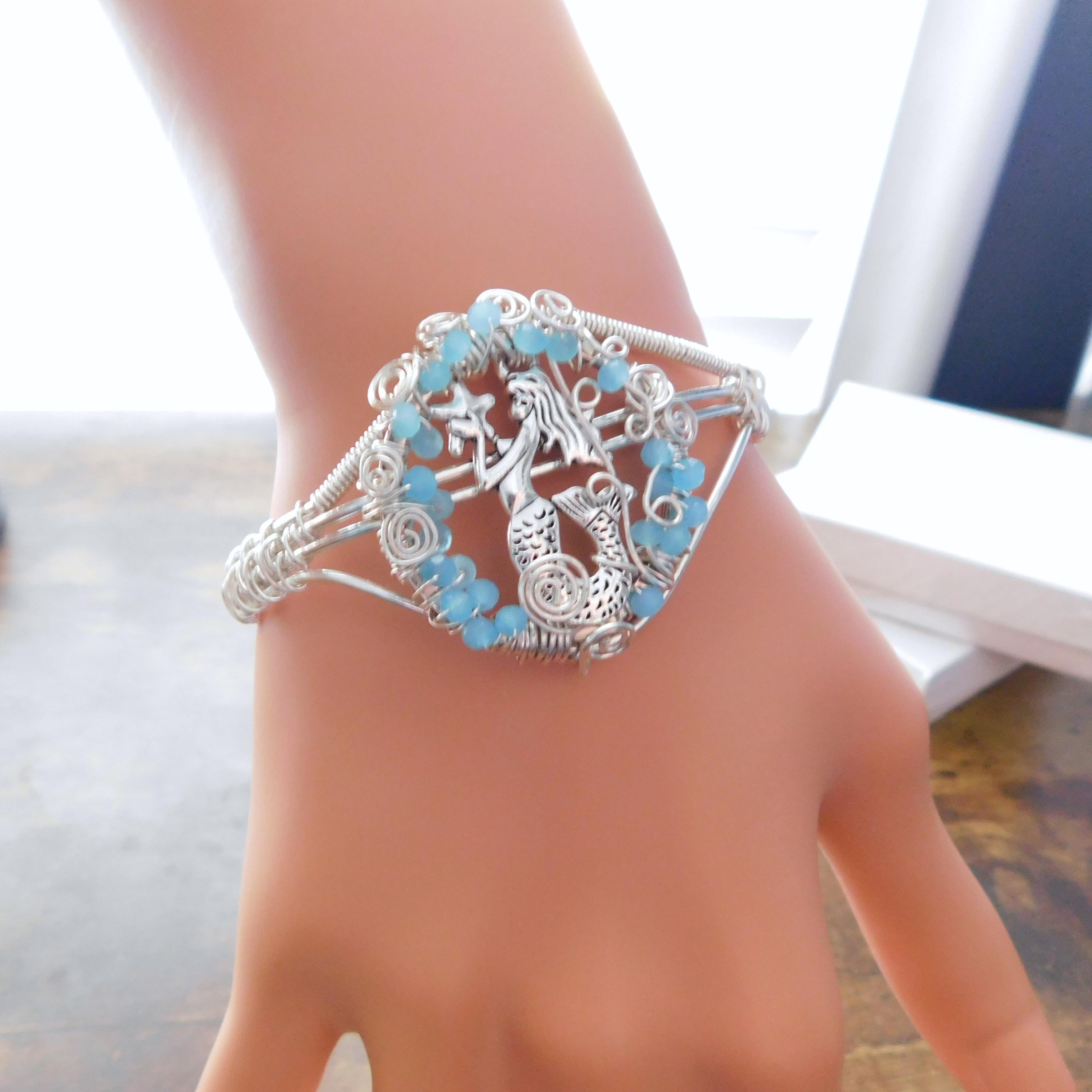 SHIPS FROM THE US! Non Tarnish fine silver over copper wire is intricately hand woven, creating a cuff bracelet that is comfortable and adjustable. The cuff is embellished with a silver tone mermaid and flower, along with turquoise colored crystals.