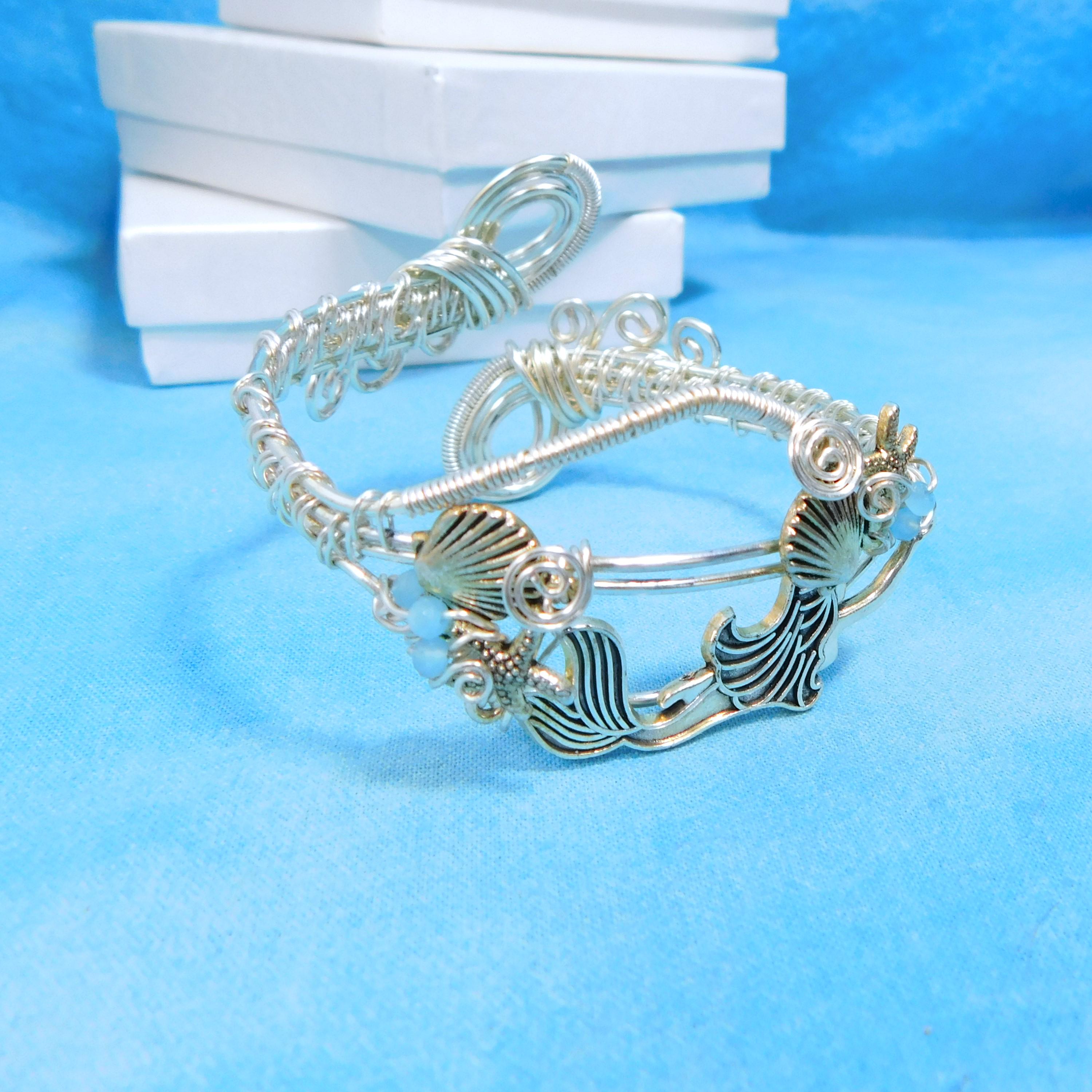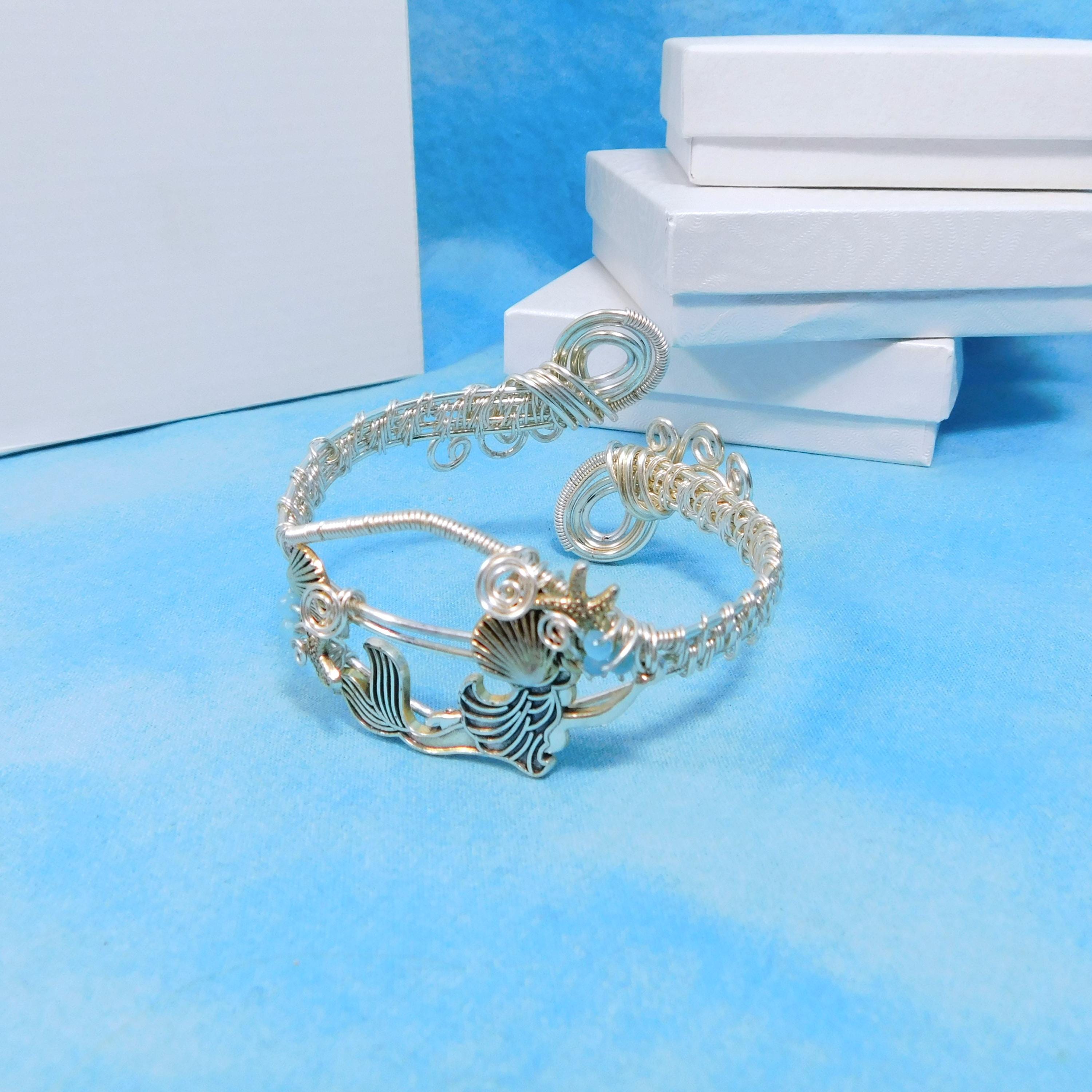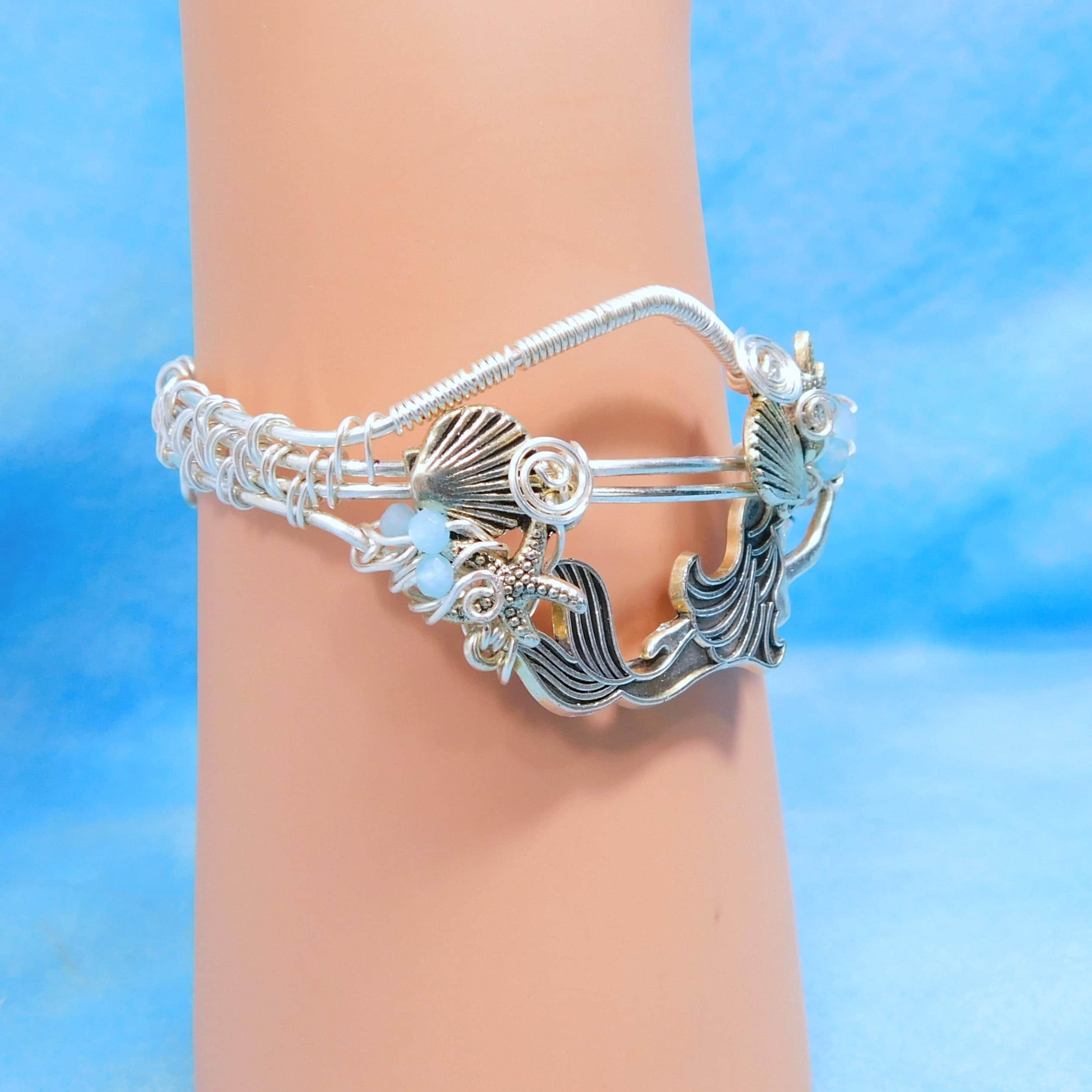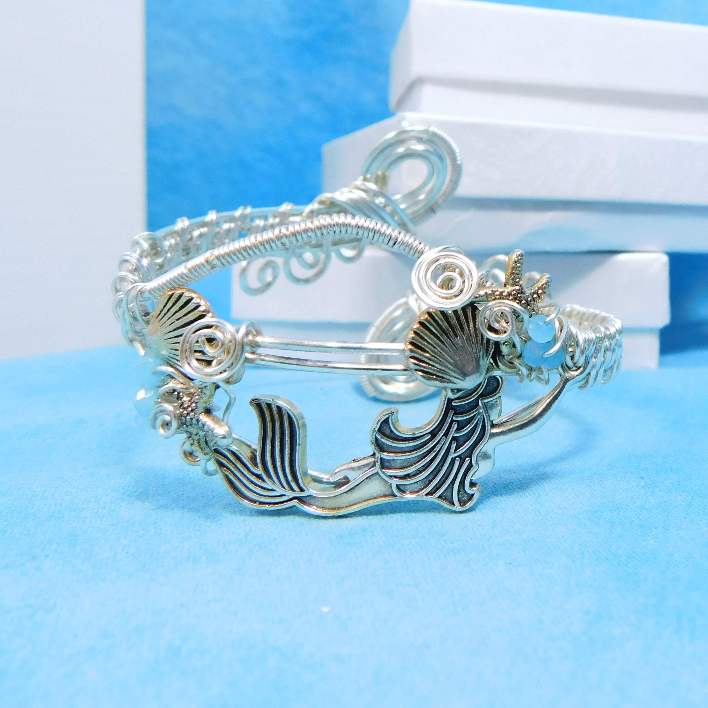 SHIPS FROM THE US! Non Tarnish fine silver over copper wire is intricately hand woven, creating a cuff bracelet that is comfortable and adjustable. The cuff is embellished with a silver tone mermaid along with shells and turquoise colored crystals.
