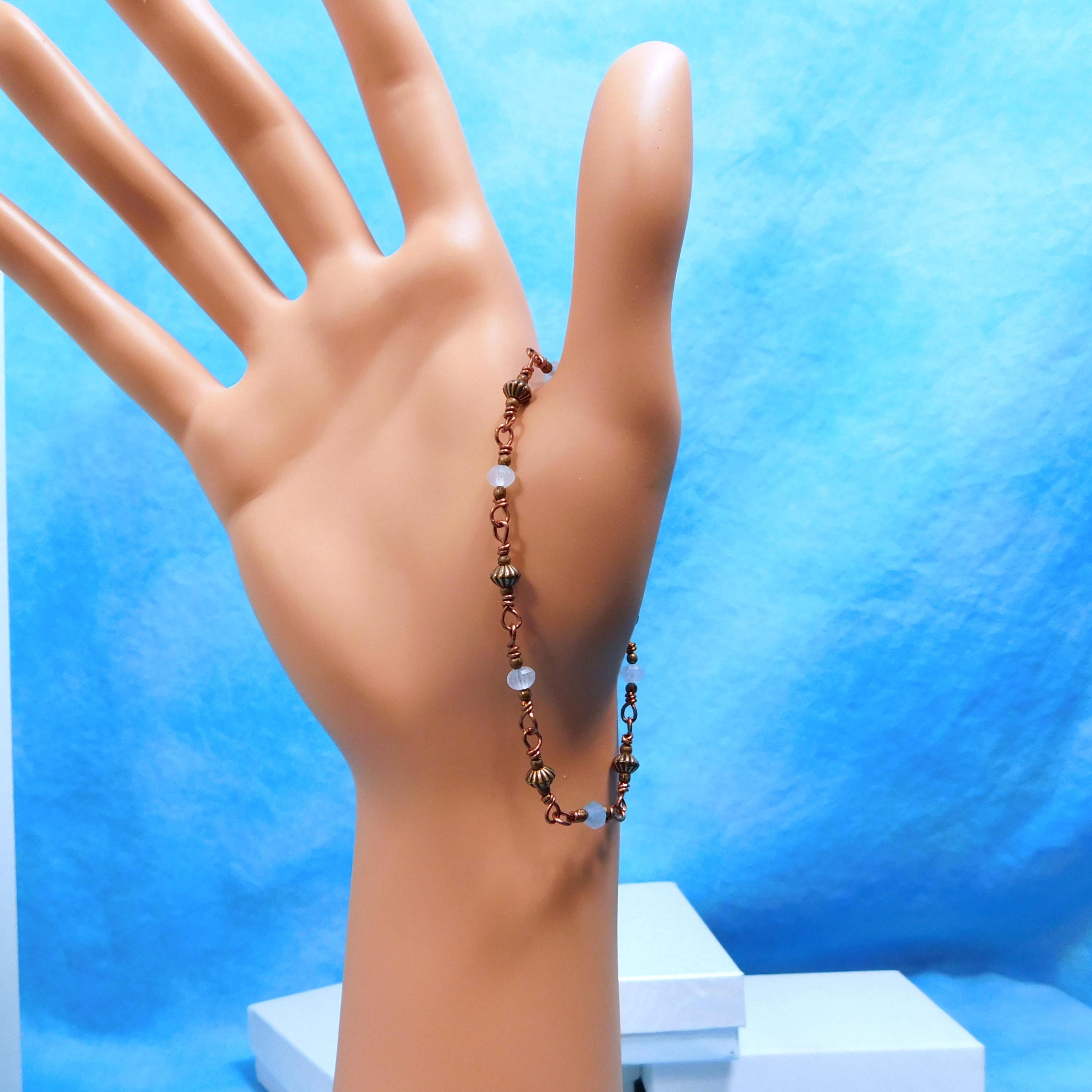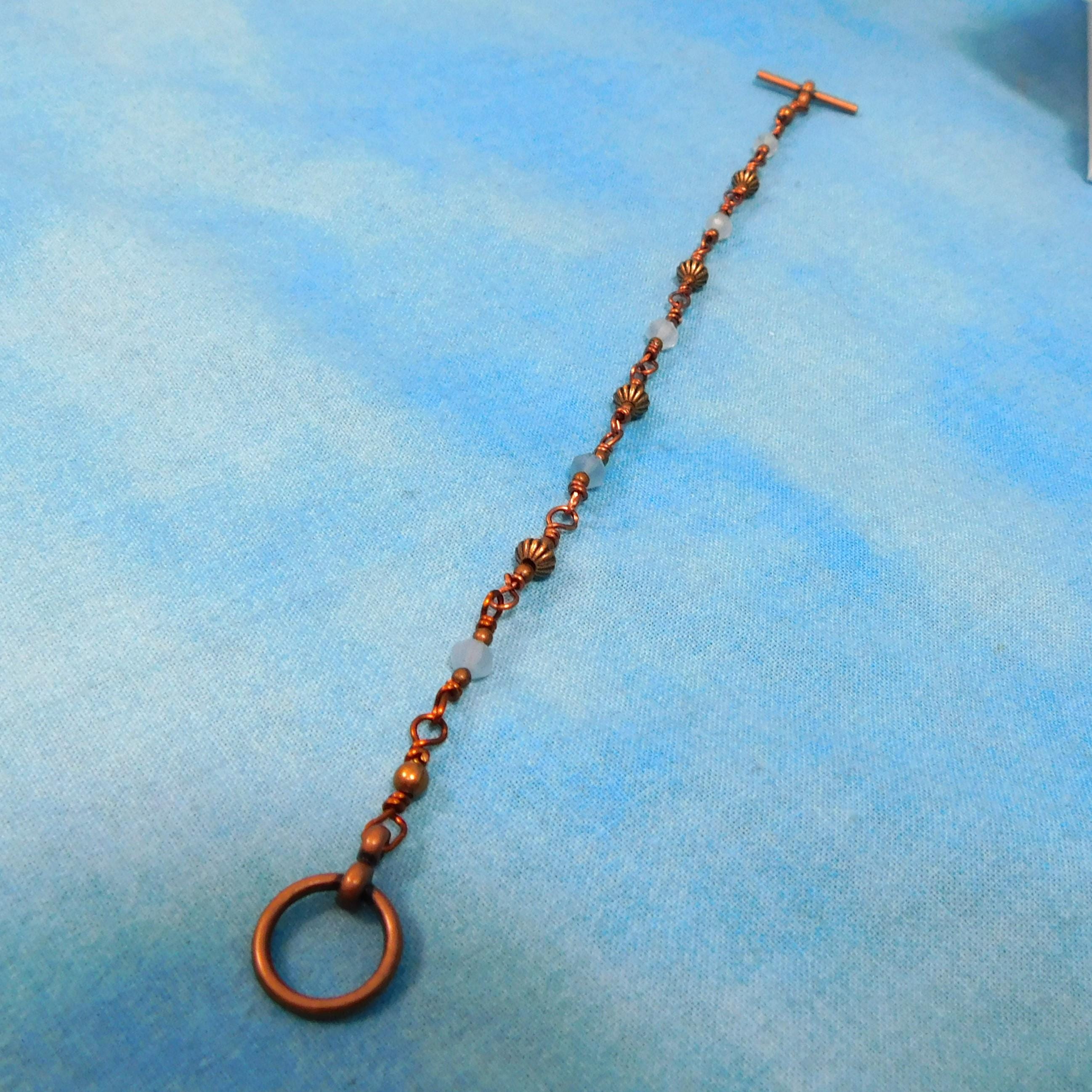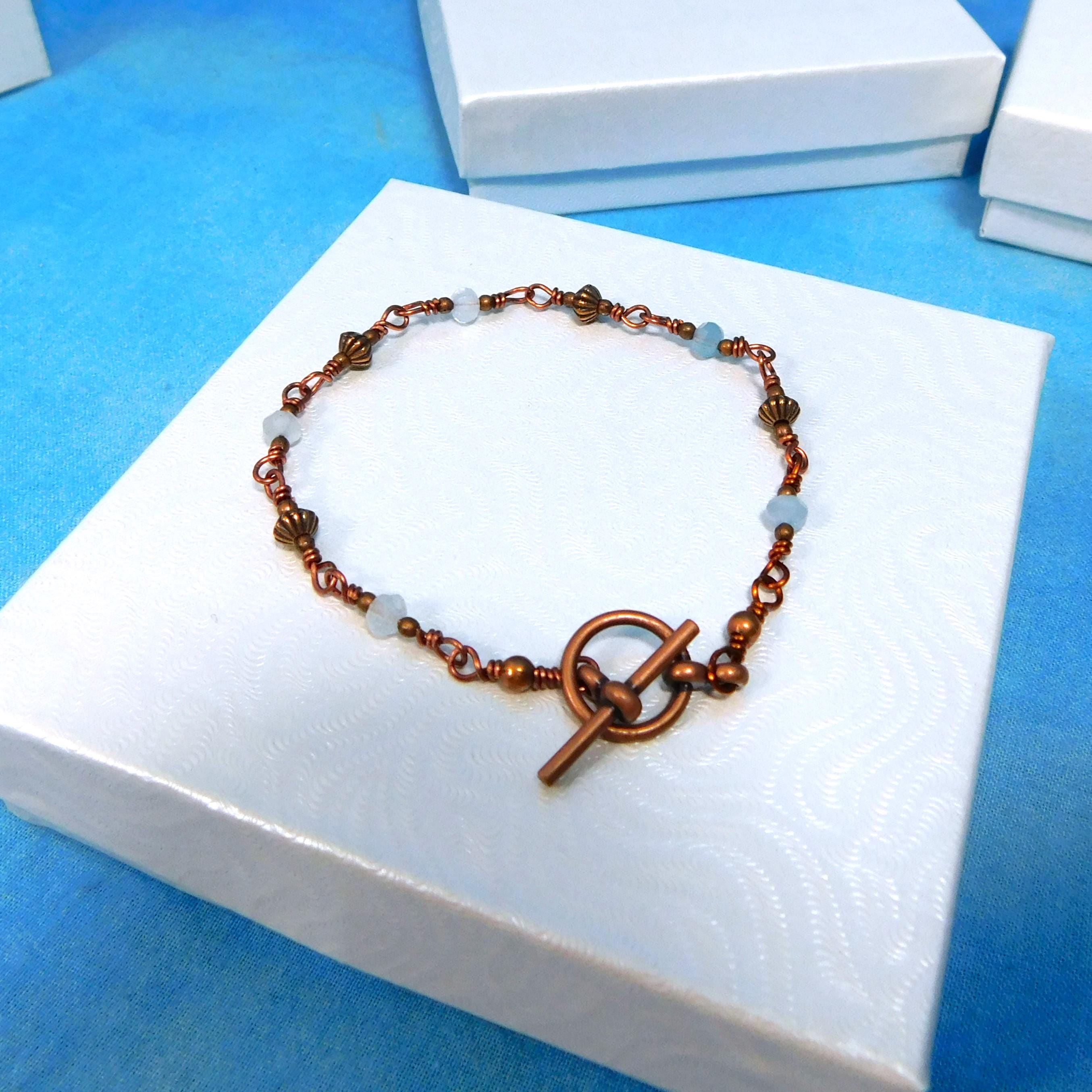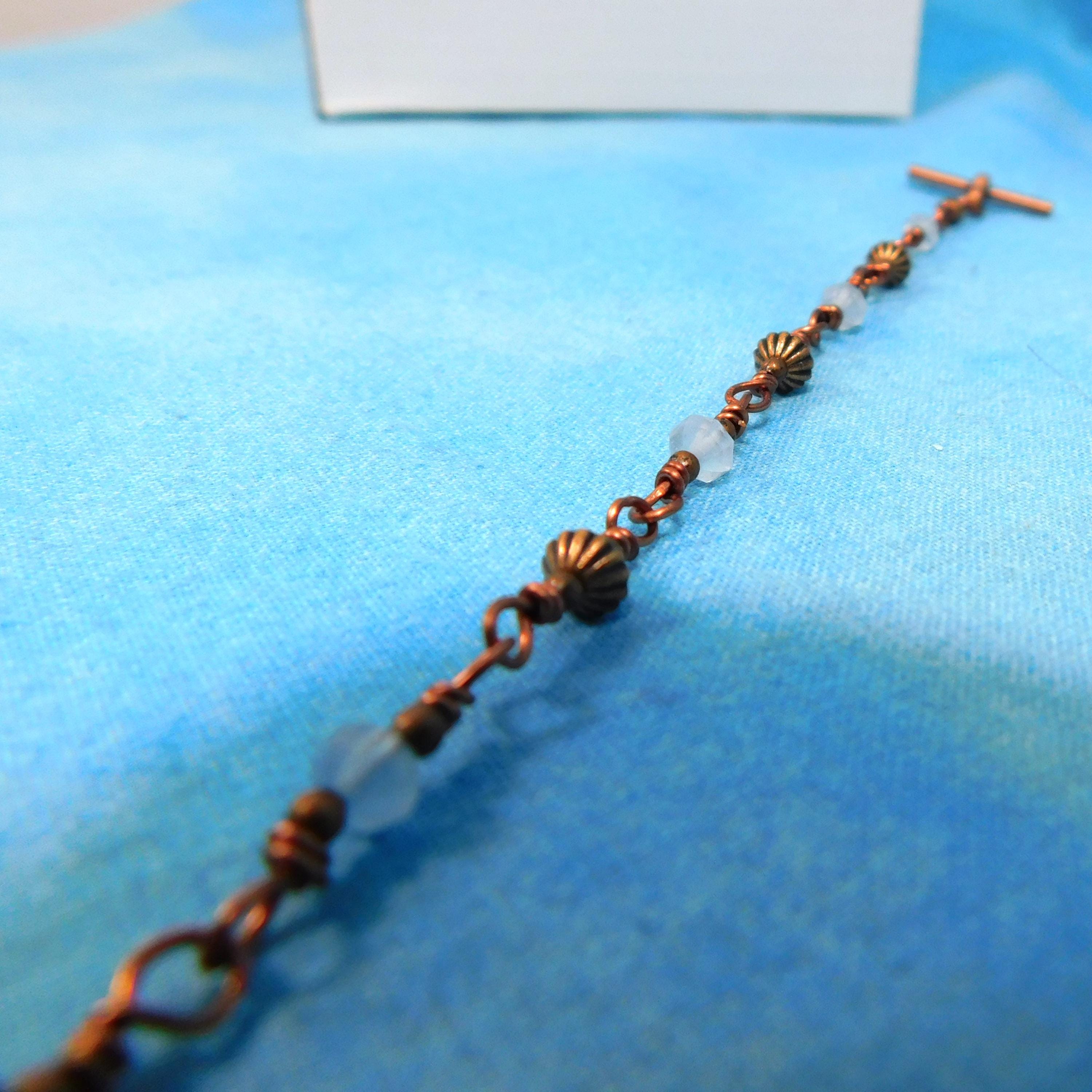 SHIPS FROM THE US! Genuine aquamarine gemstones are combined with copper embellishments, in a chain of individually hand wrapped links. The bracelet is 7 inches long and is finished with an antique copper colored toggle clasp. (Bracelet length can be customized on request.)