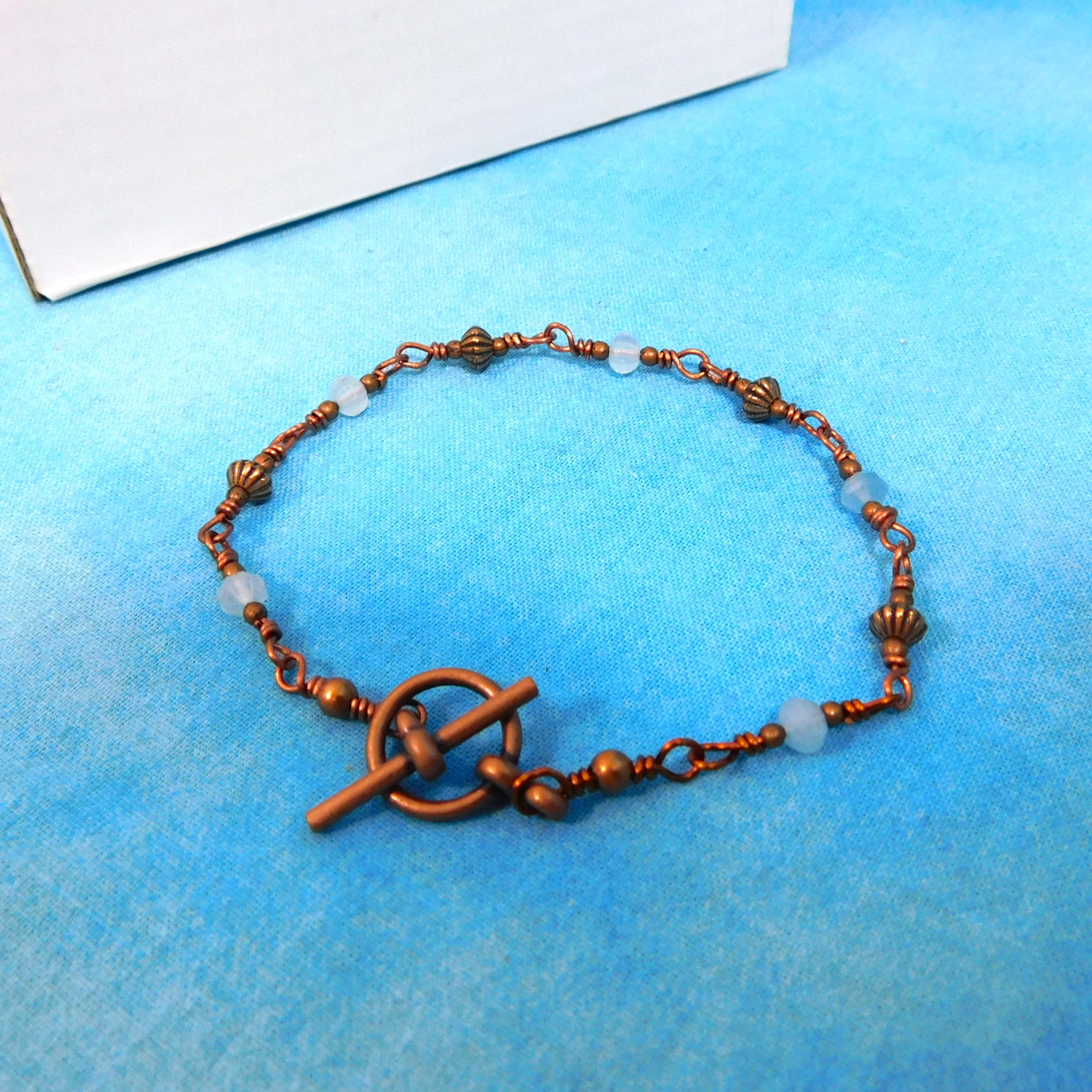 This bracelet can be added to other bracelets, or worn individually, with equal impact. I personally love the combination of aquamarine and dark copper because of the color contrast.