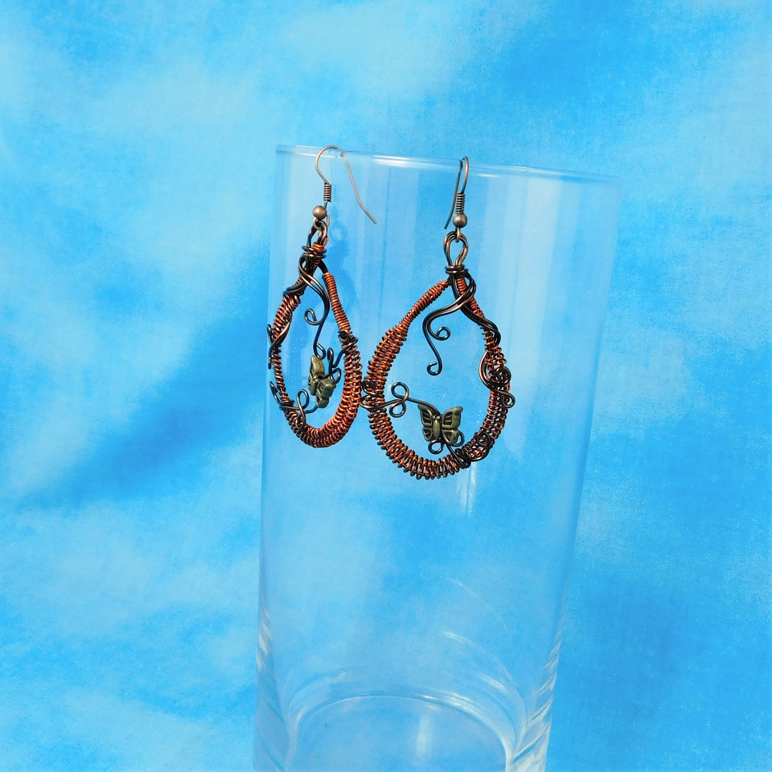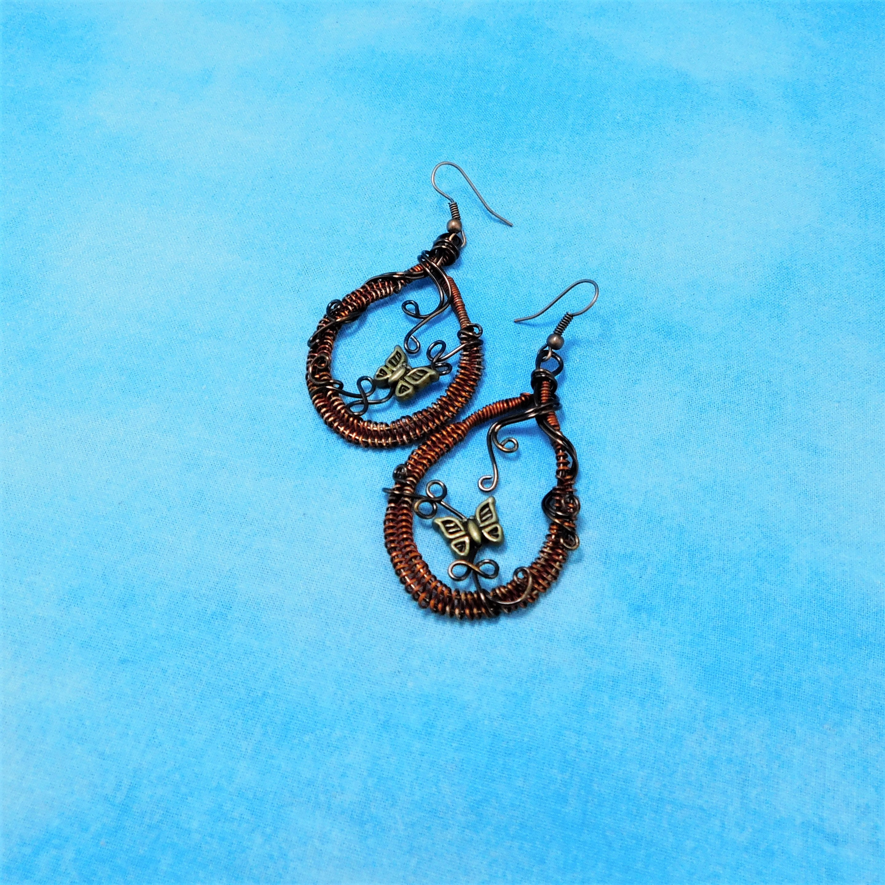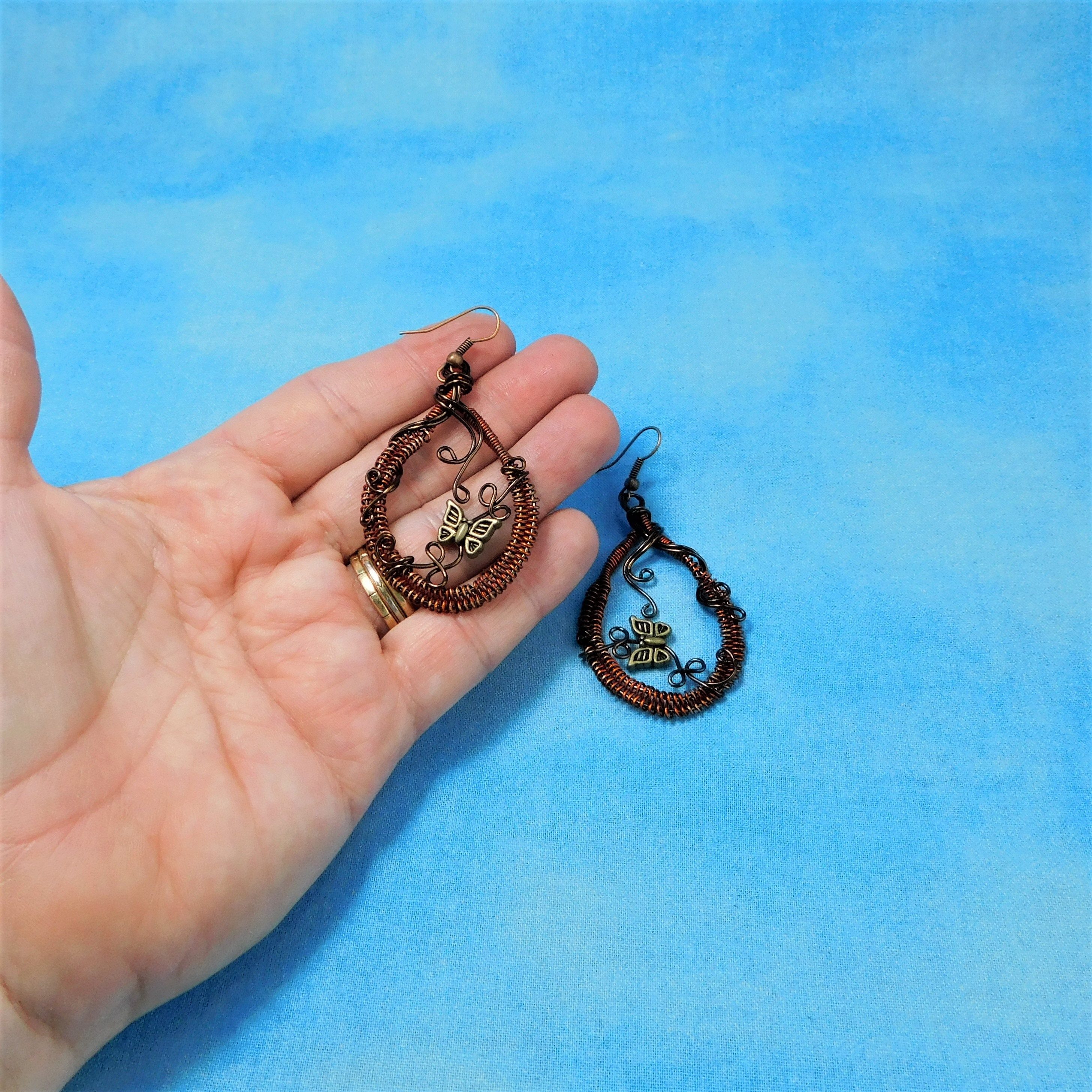 SHIPS FROM THE US! Rust colored non tarnish copper wire is woven and embellished with dark copper colored wire vines and vintage bronze butterflies. These rustic hoops measure 2 inches in length and 1 1/4 inches wide. The butterflies move slightly on the vines to bring life and dimension to these fun earrings.