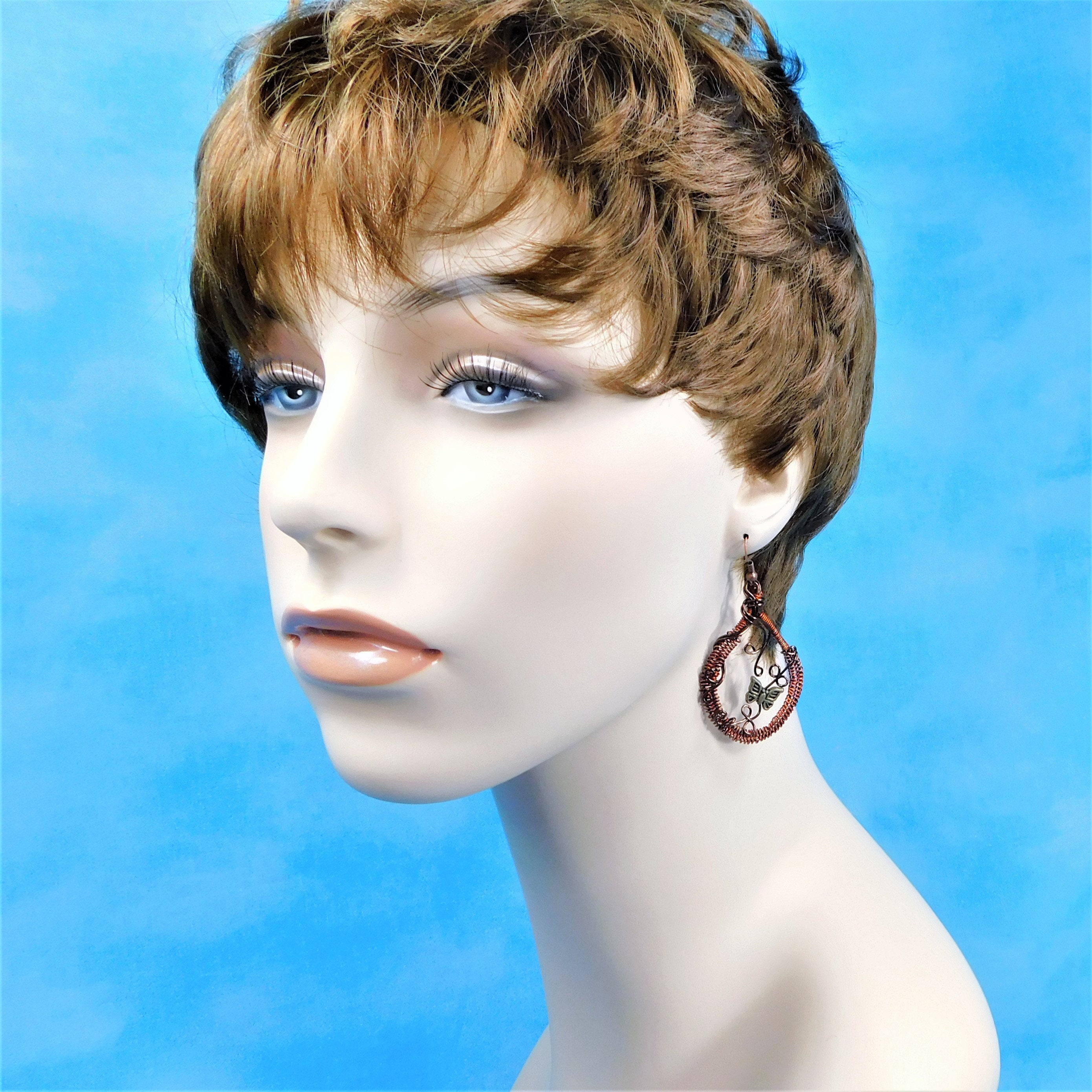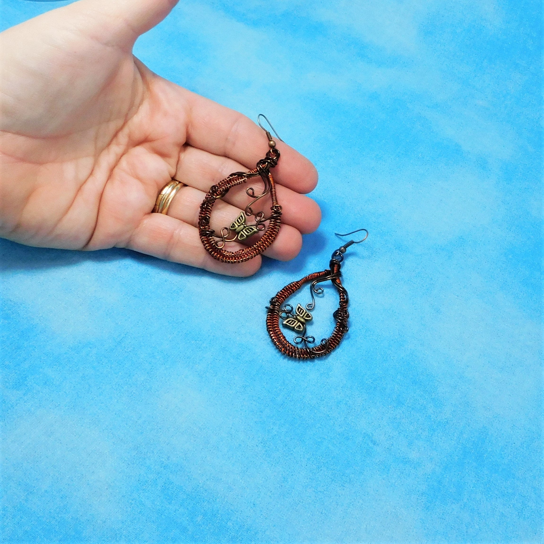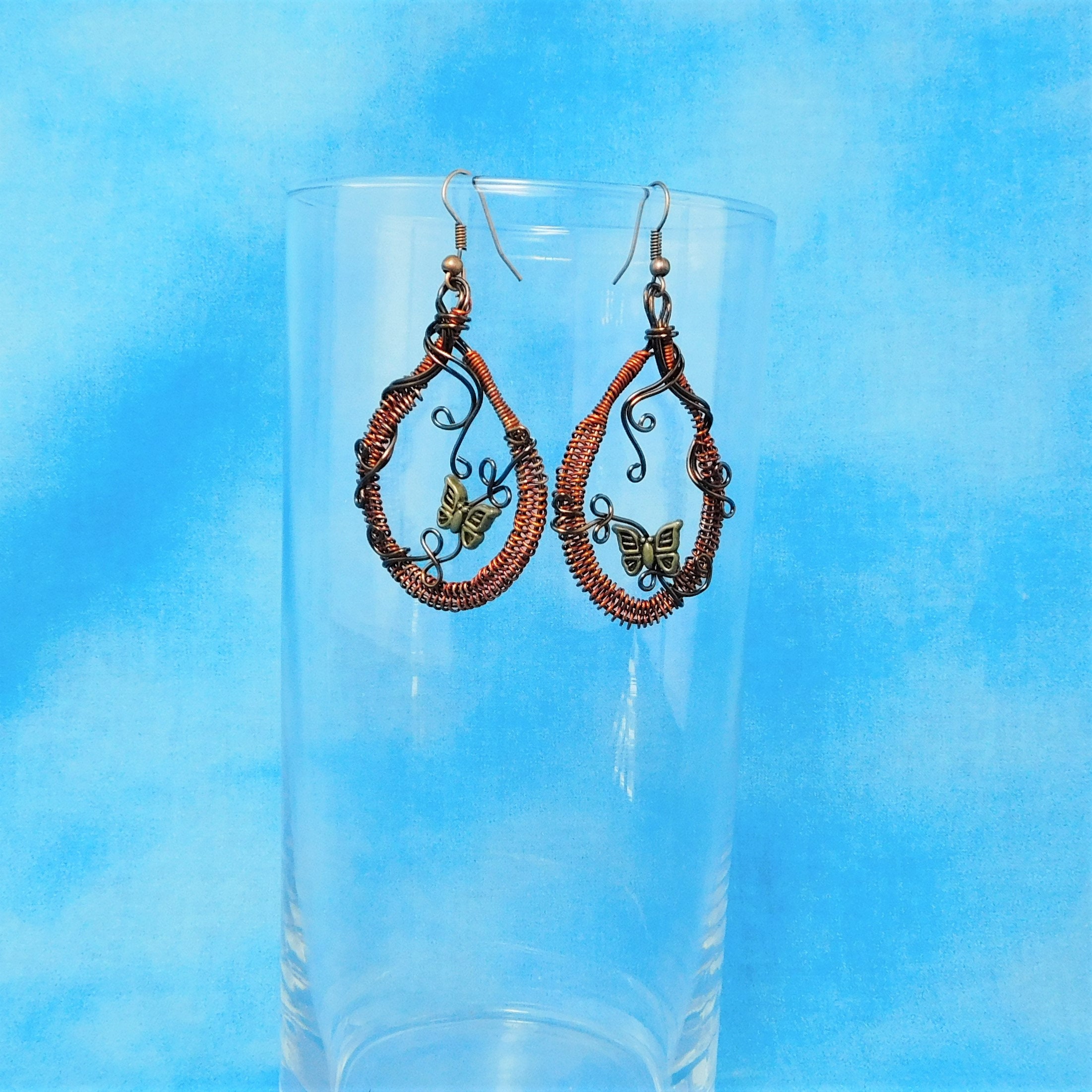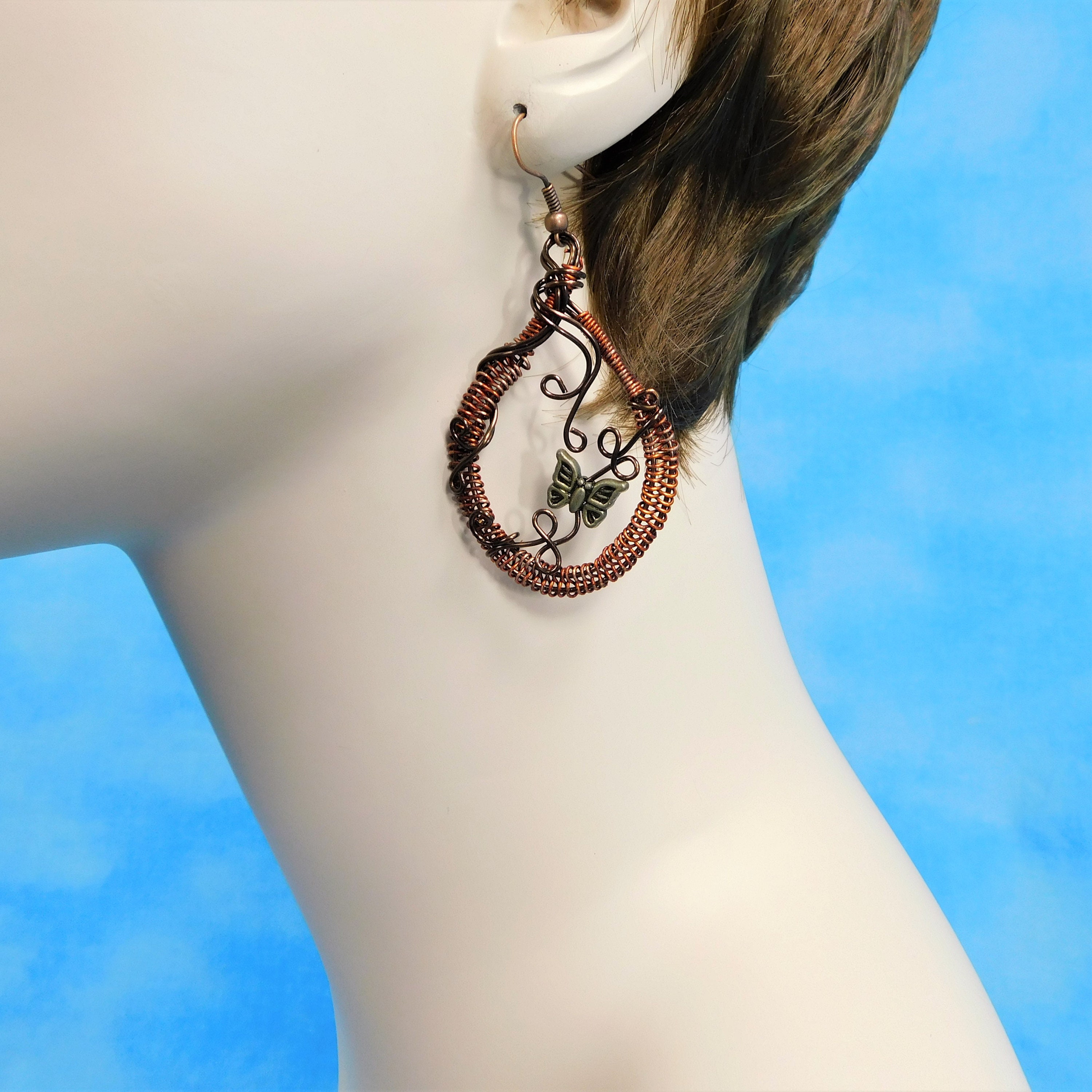 SHIPS FROM THE US! Rust colored non tarnish copper wire is woven and embellished with dark copper colored wire vines and vintage bronze butterflies. These rustic hoops measure 2 inches in length and 1 1/4 inches wide. The butterflies move slightly on the vines to bring life and dimension to these fun earrings.