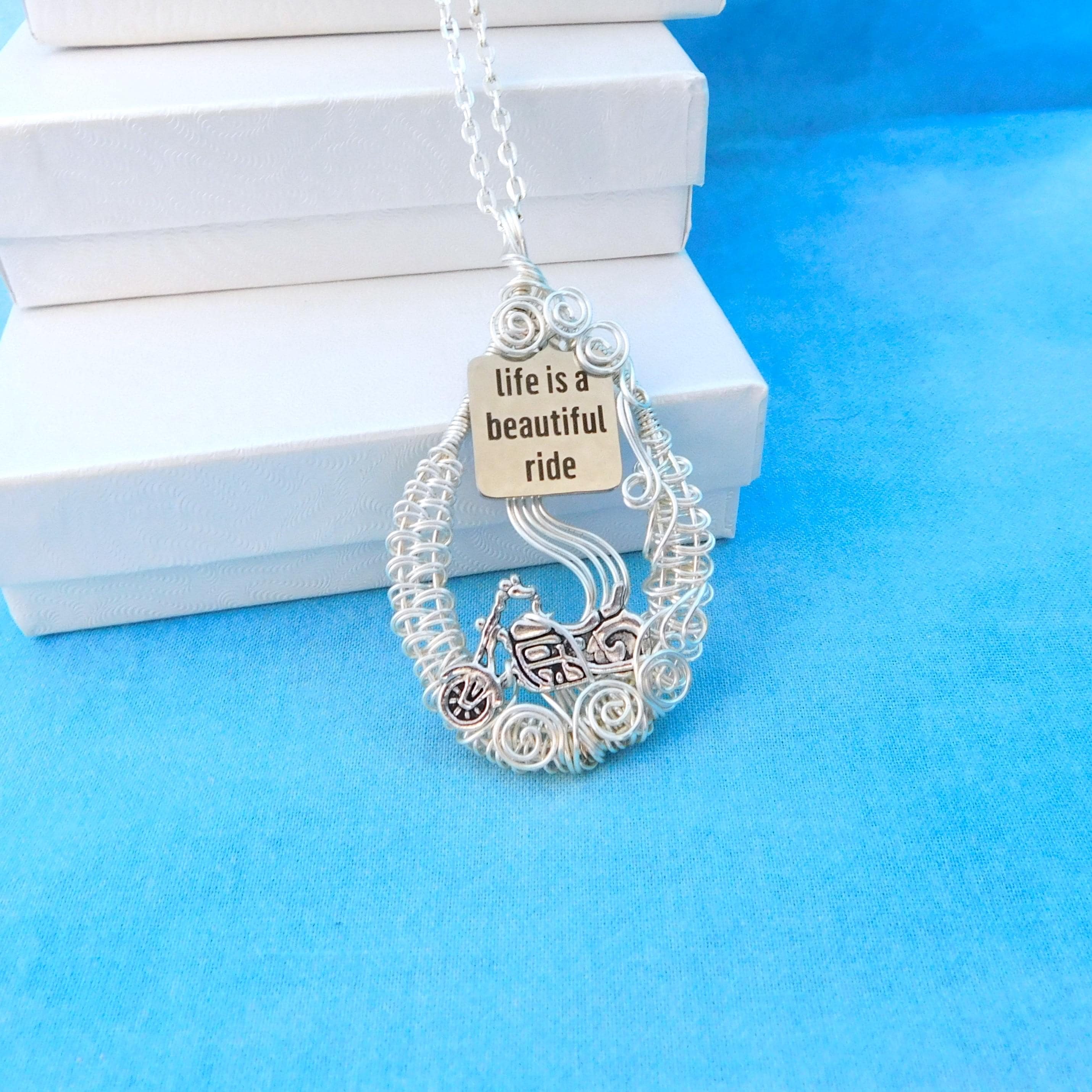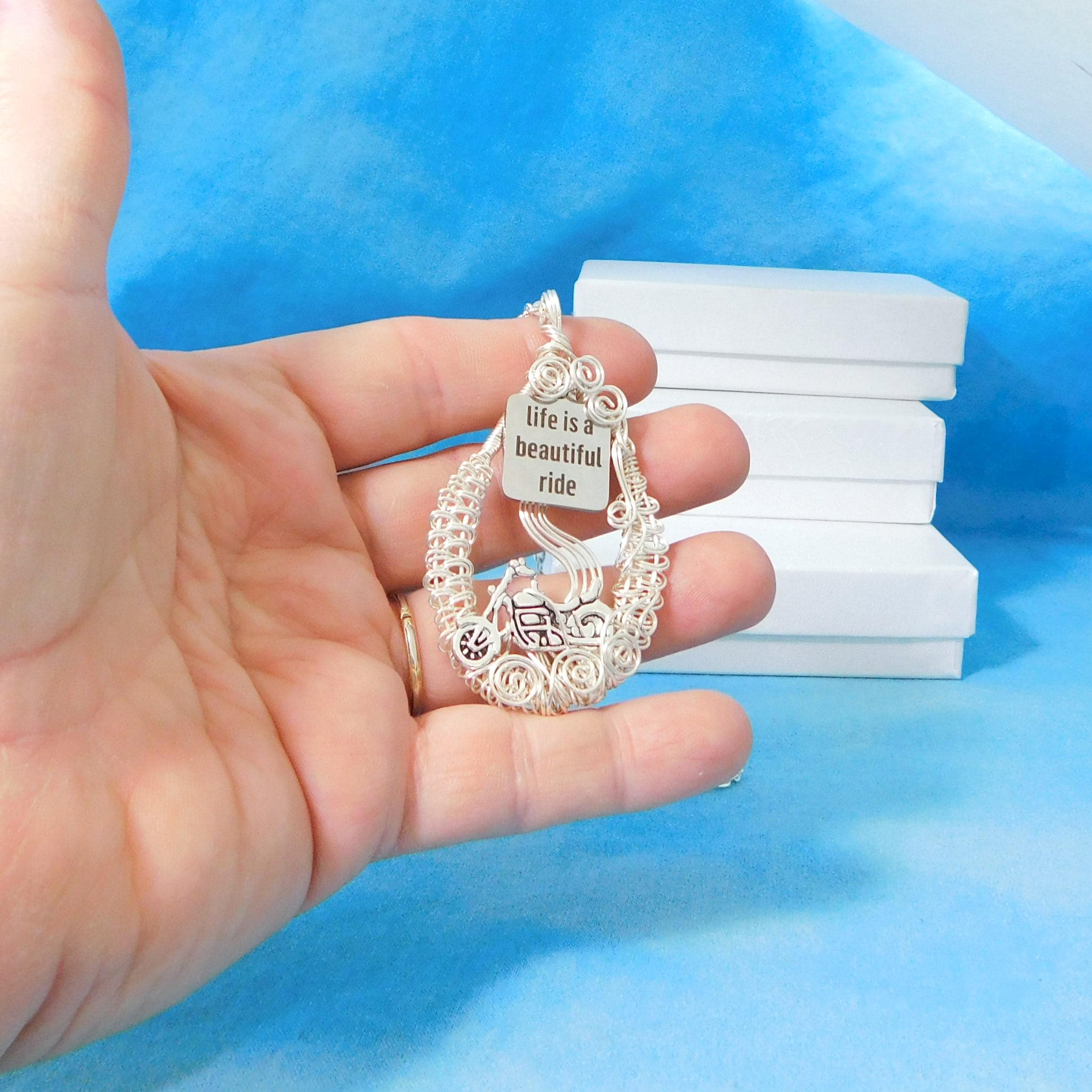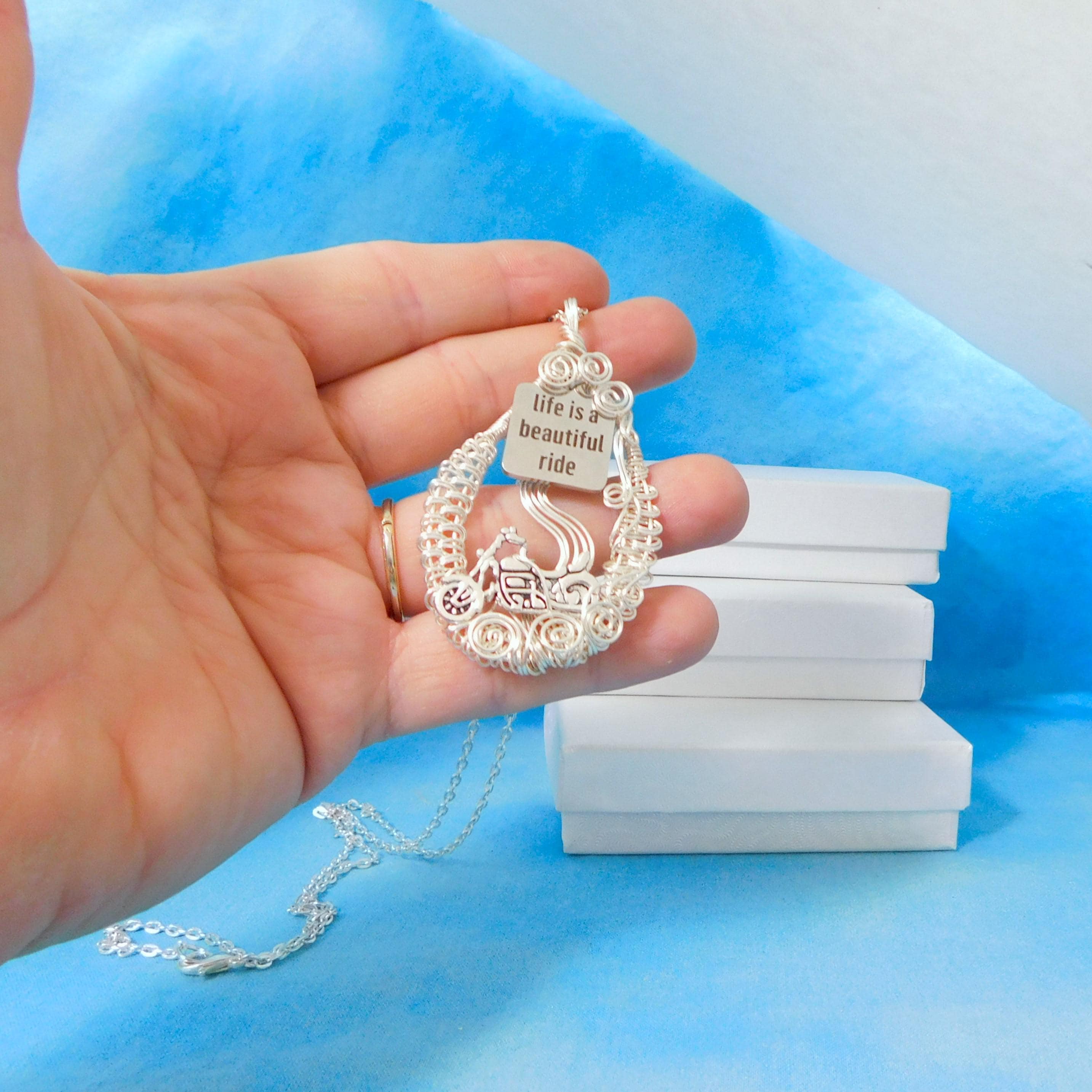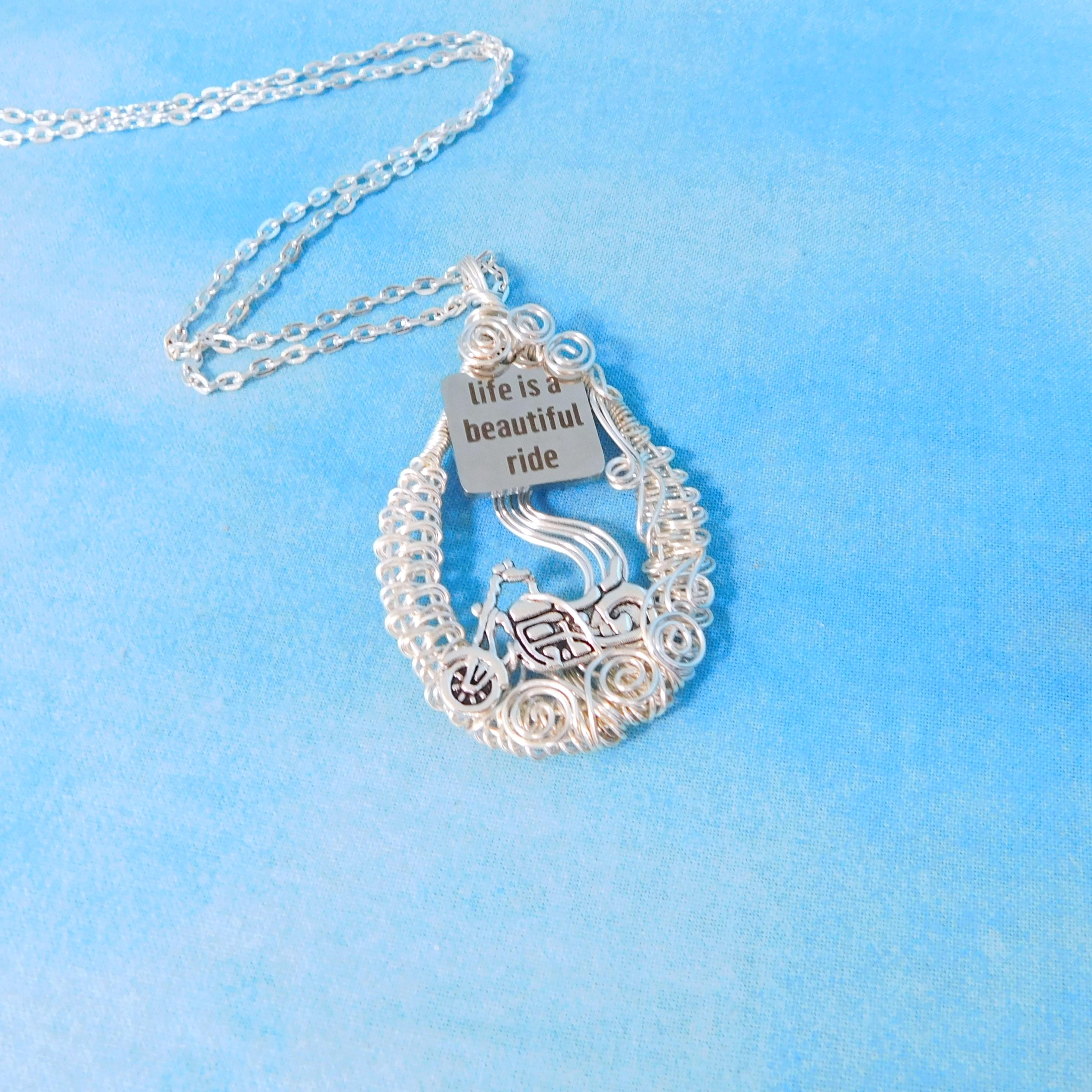 This artisan crafted pendant has been woven and sculpted by hand, using only four strands of wire, pliers, and patience. If you look closely, you can see clouds of dust rising from beneath the tires, and you can almost feel the rumble under the seat.