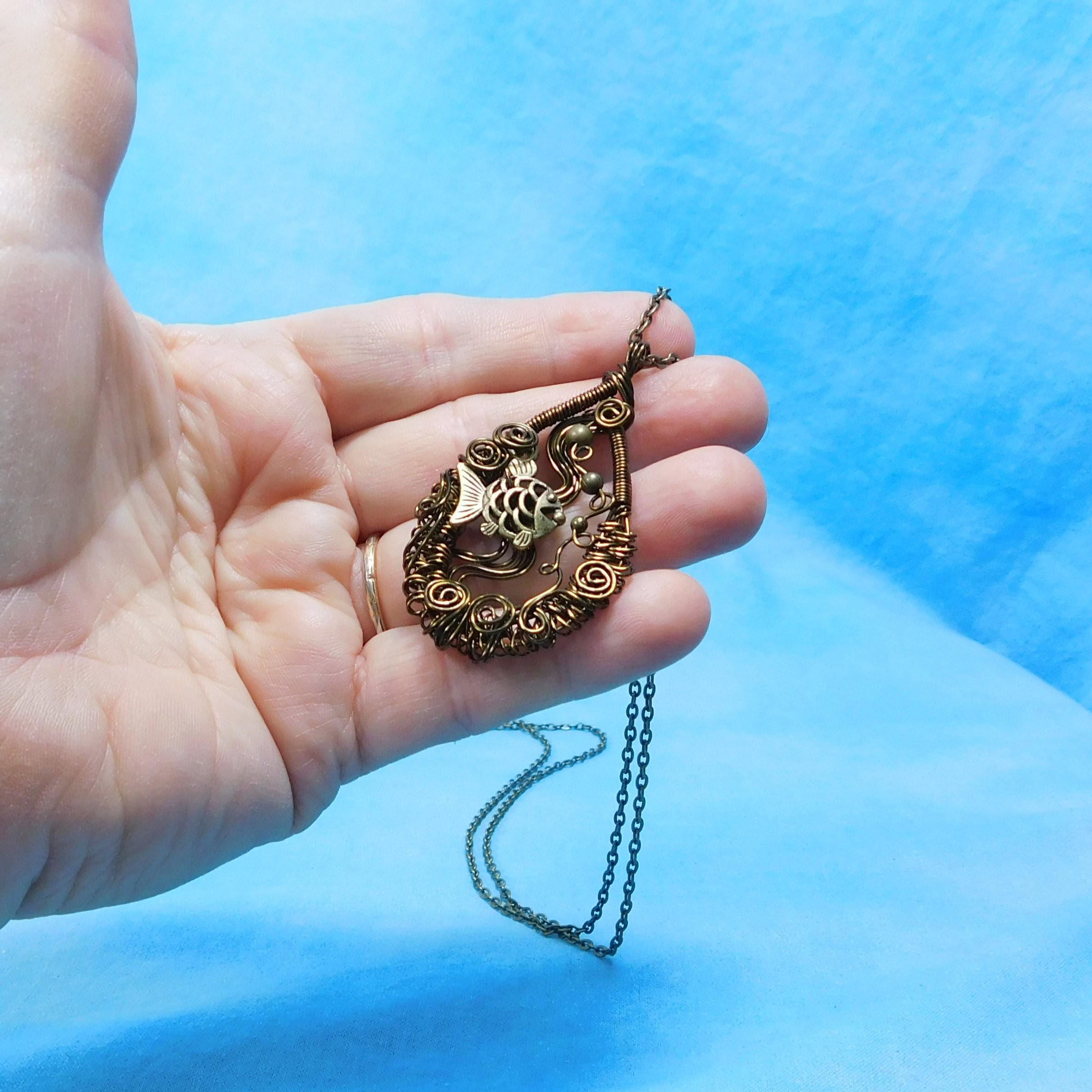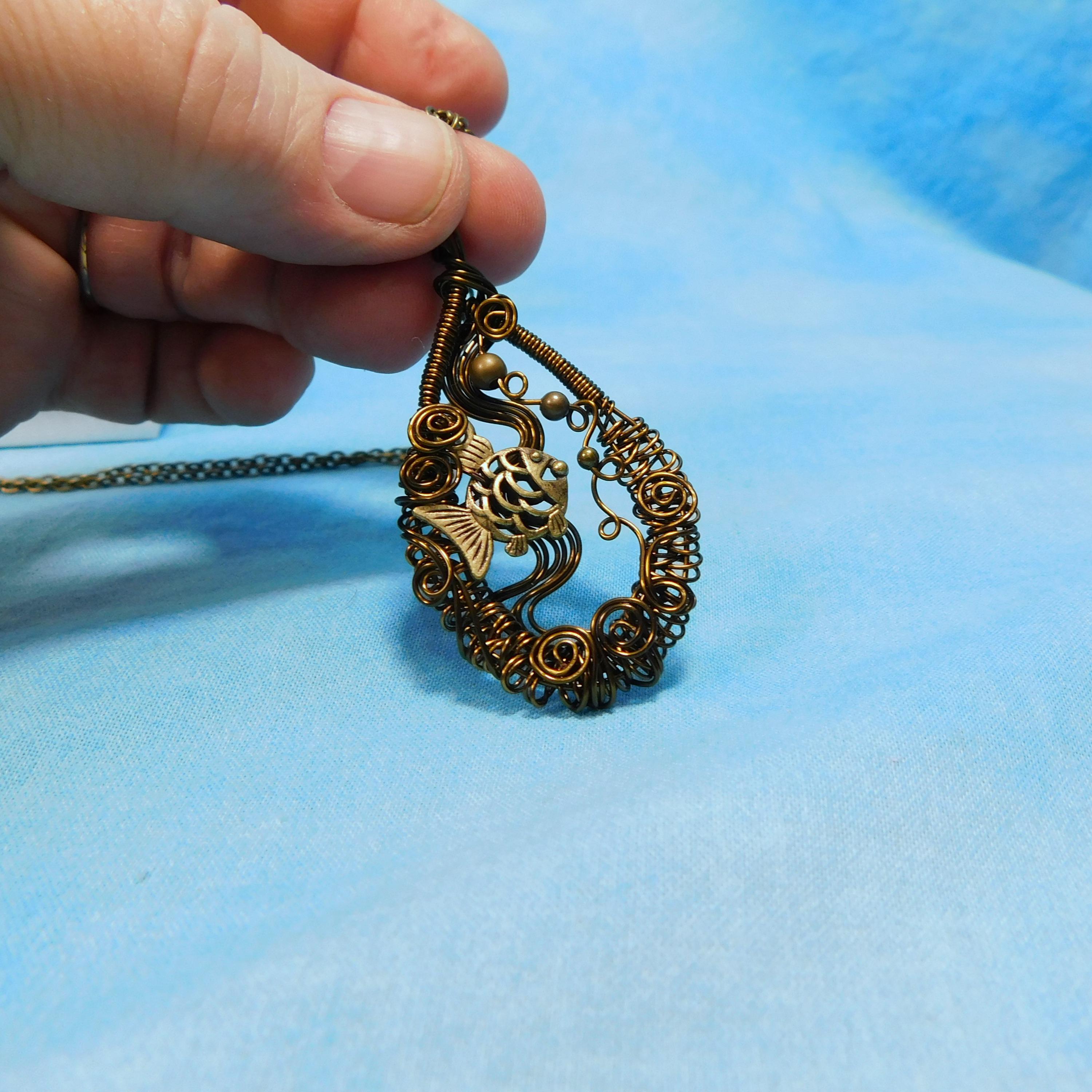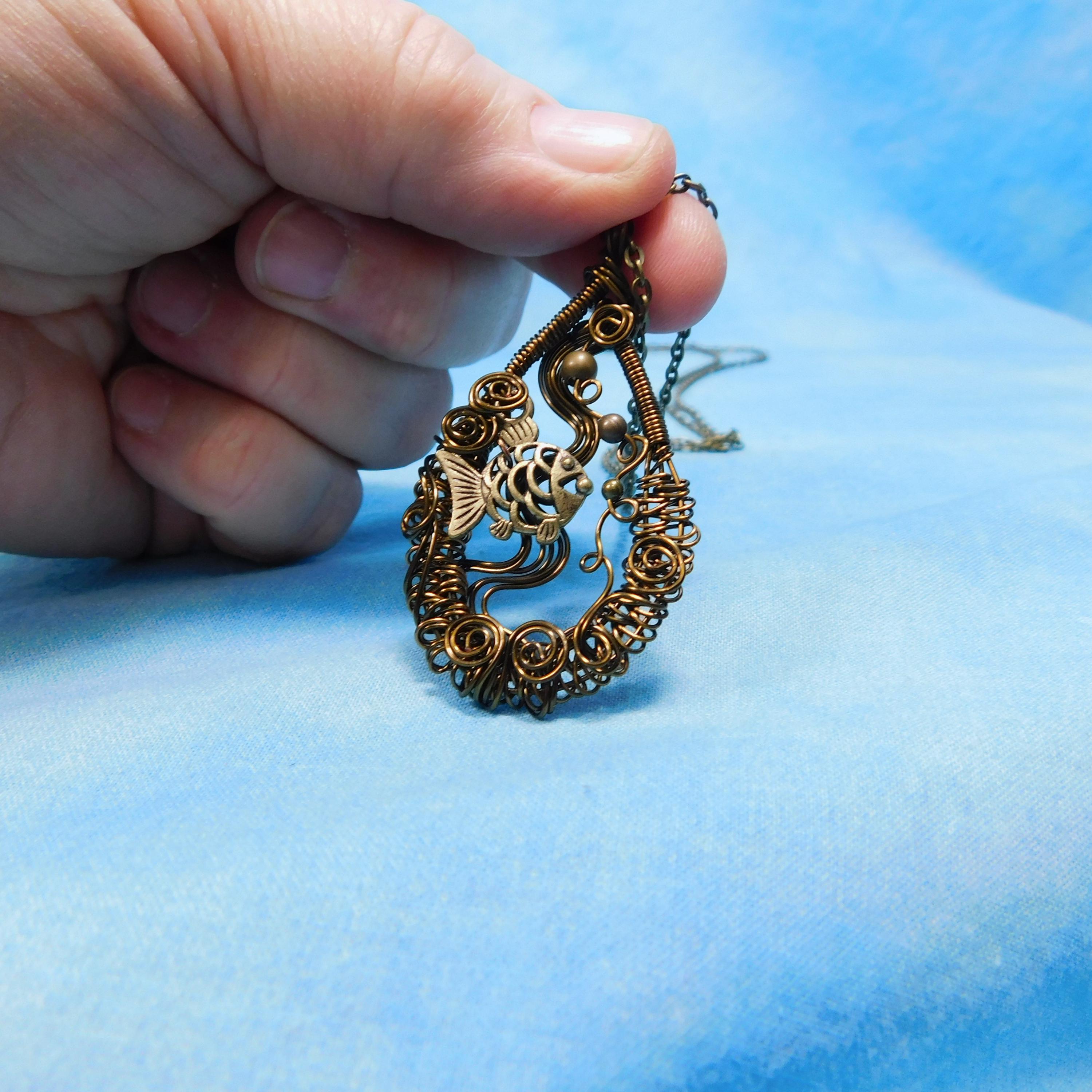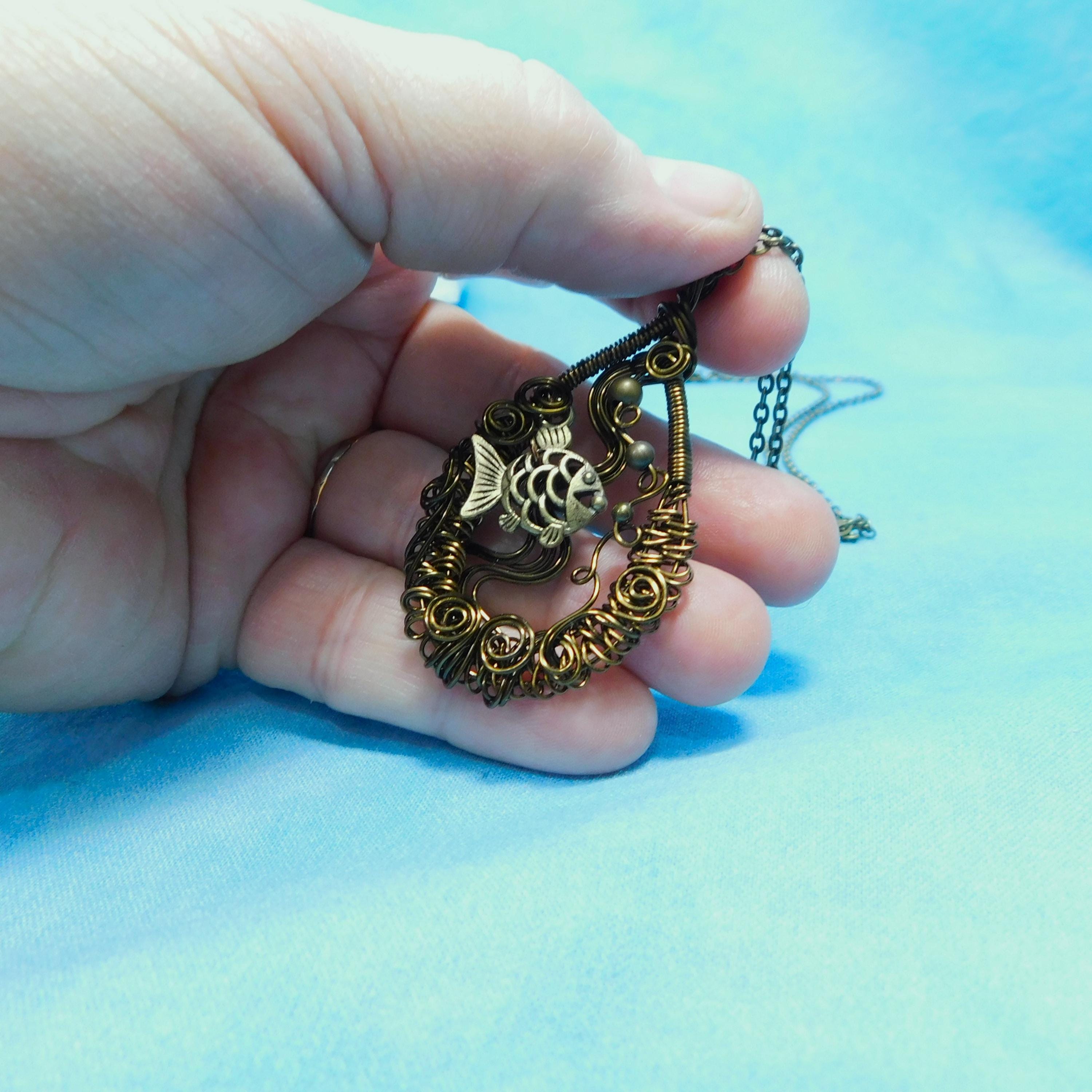 SHIPS FROM THE US! Within a hand off-loom, artistically woven copper wire frame, swims an adorable fish, lazily blowing bubbles. The pendant is crafted with non tarnish vintage bronze colored copper wire.