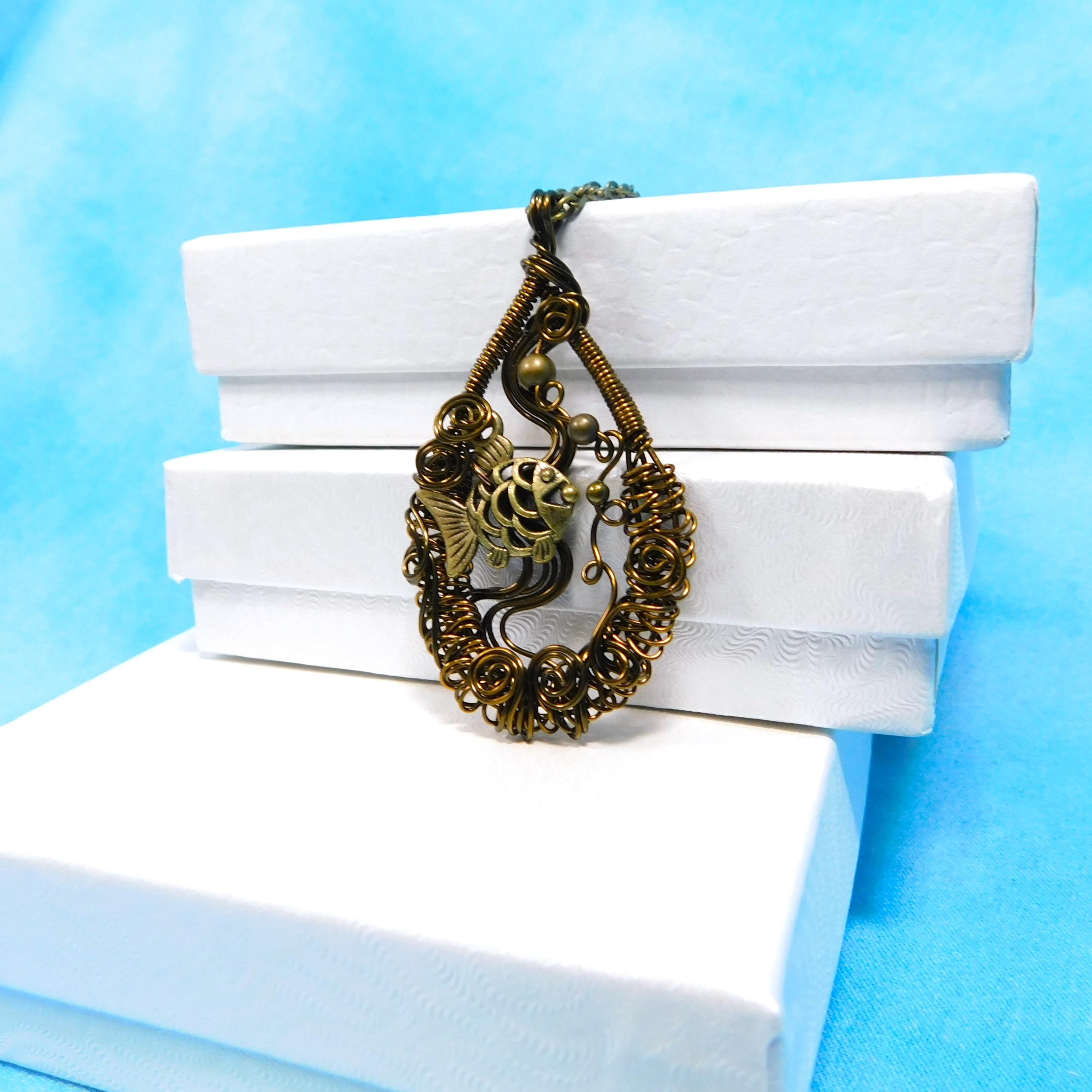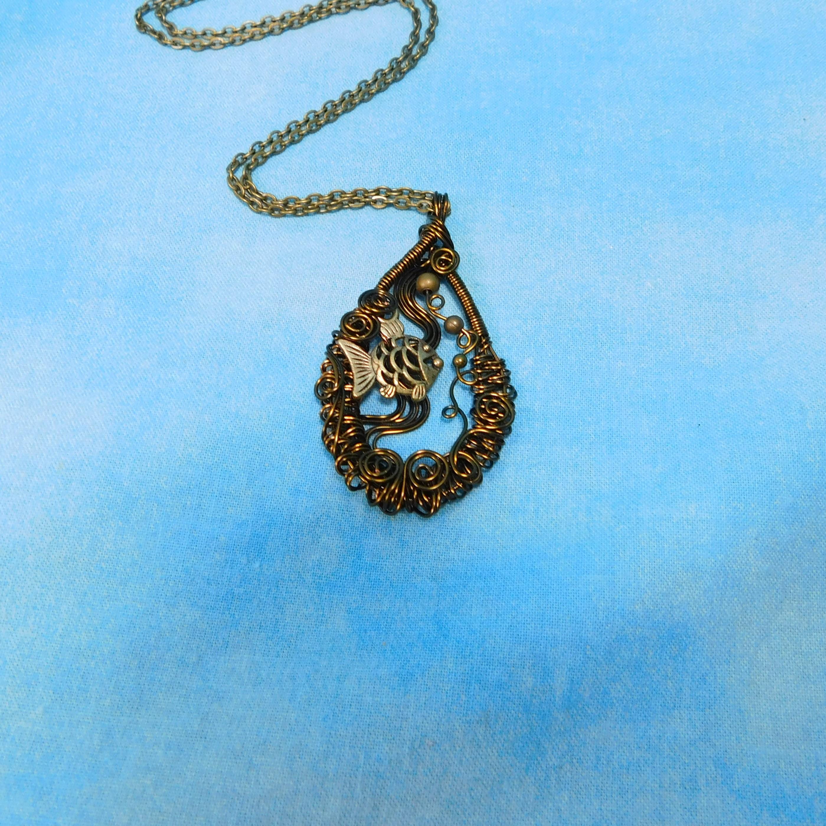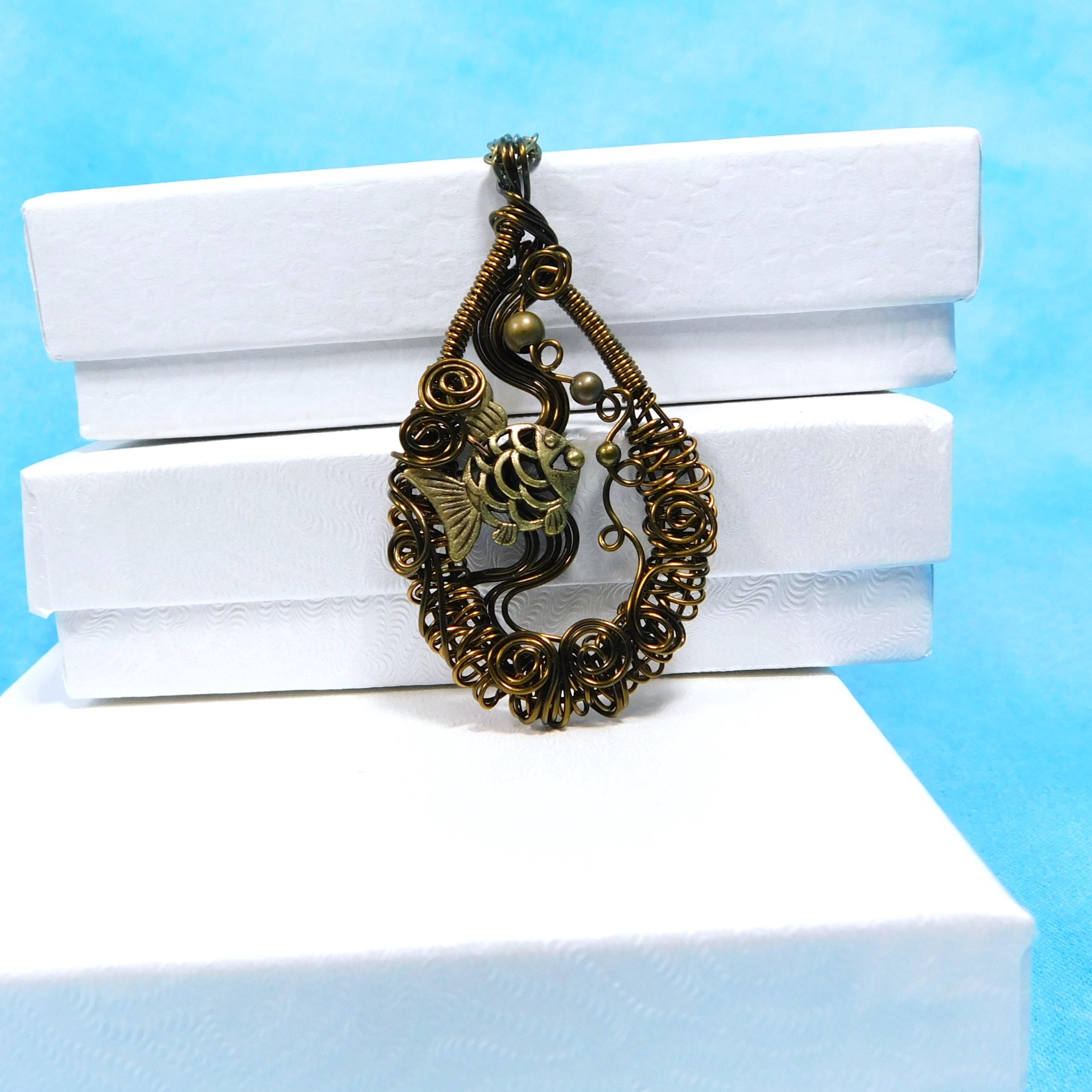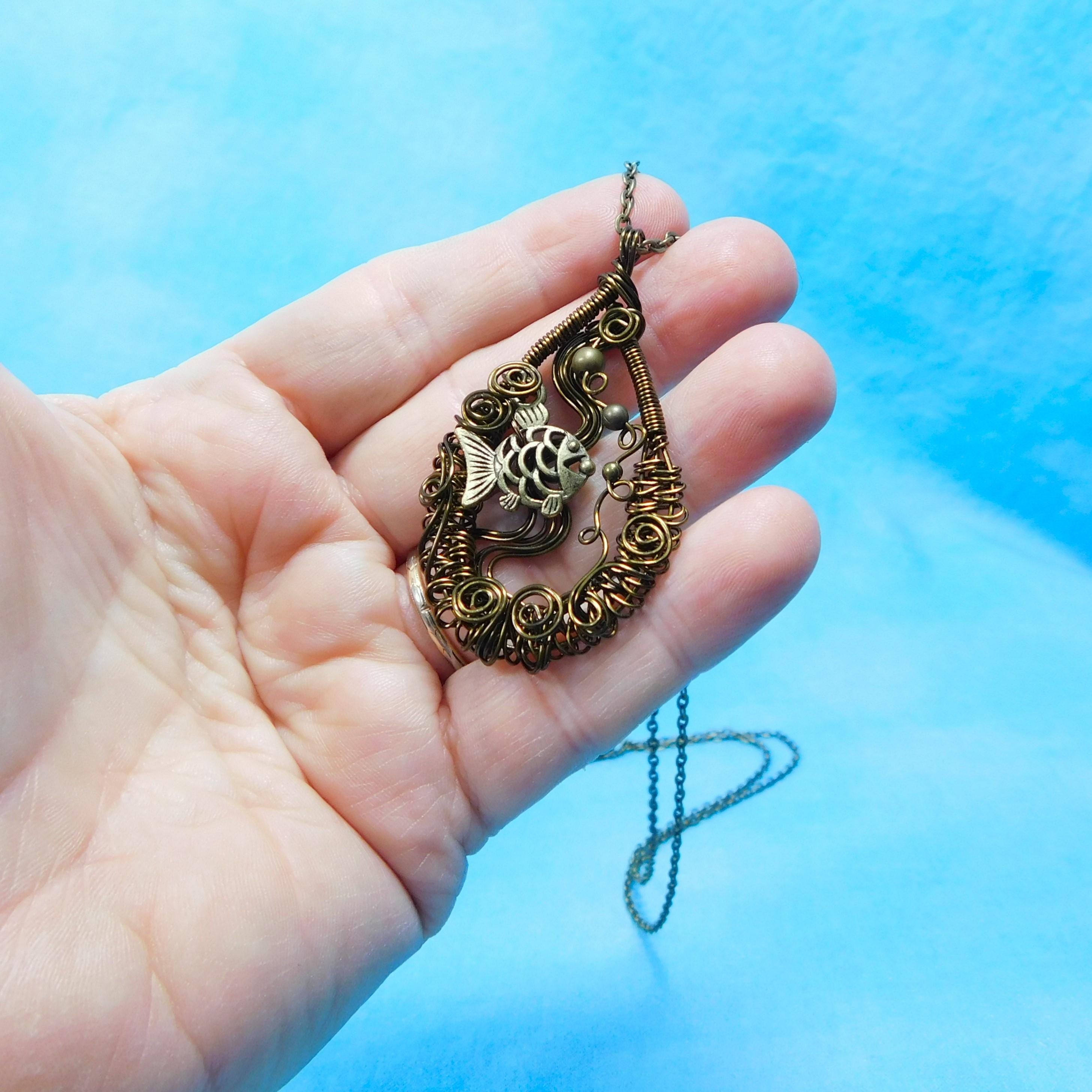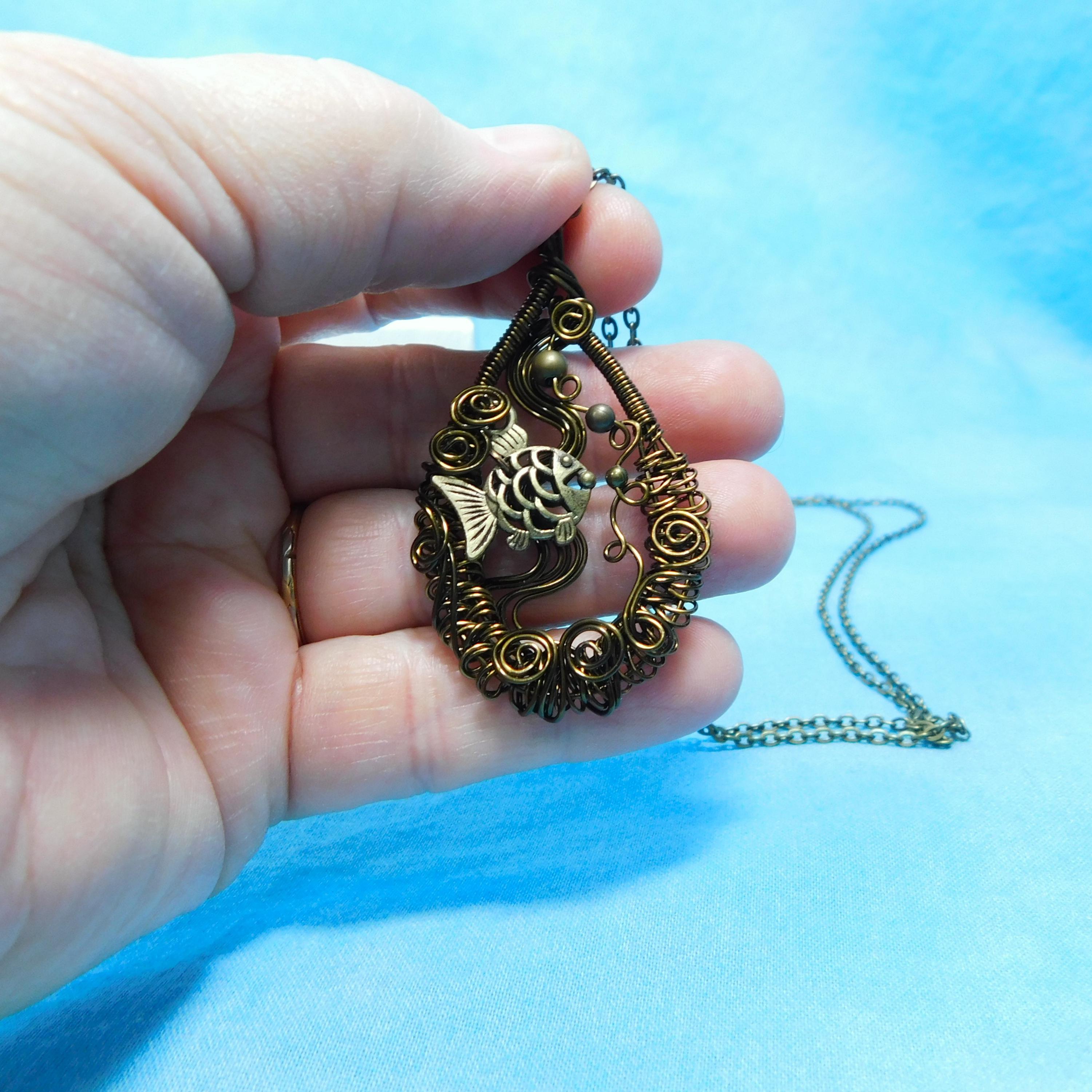 SHIPS FROM THE US! Within a hand off-loom, artistically woven copper wire frame, swims an adorable fish, lazily blowing bubbles. The pendant is crafted with non tarnish vintage bronze colored copper wire.