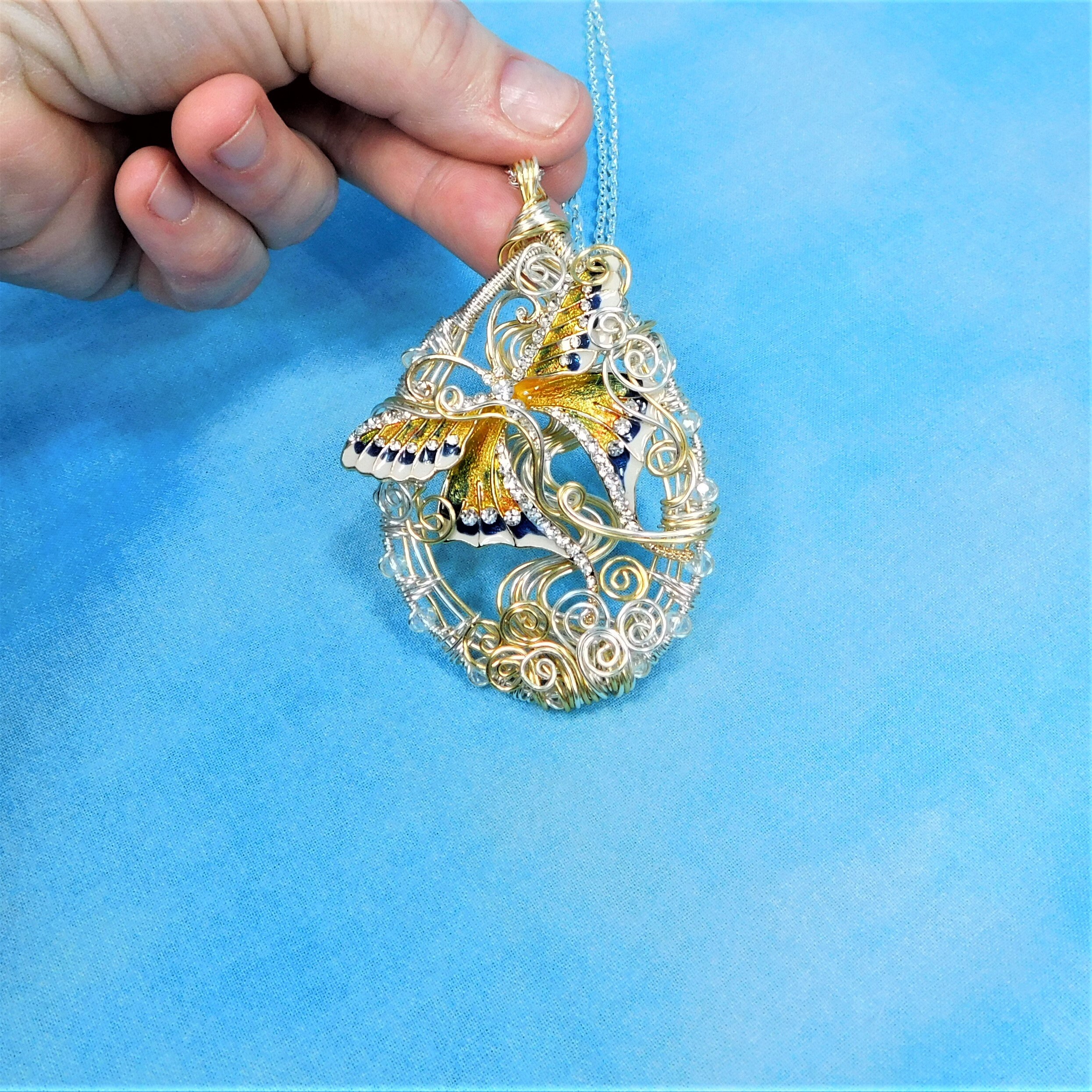 SHIPS FROM THE US! Non tarnish fine silver over copper and gold copper wire is meticulously hand woven and sculpted to frame a blingy, rhinestone encrusted, beautifully blue and cream enameled, gold butterfly. The butterfly appears to flutter among artistically hand sculpted, silver and gold vines that are framed with intricately interwoven crystals. This is a large, substantial, yet delicate statement piece that would be a lovely focal for any of the pieces of a woman's wardrobe.