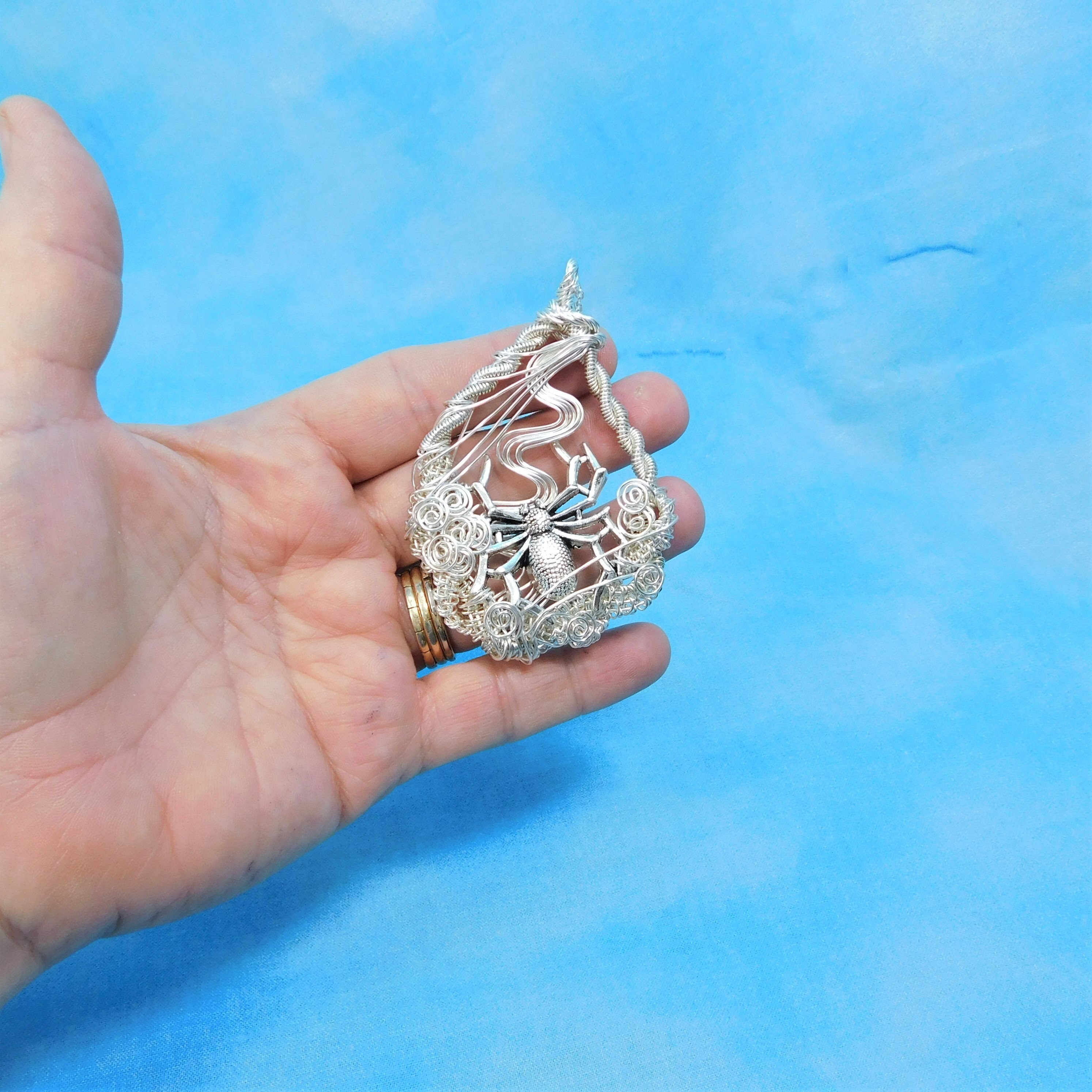 SHIPS FROM THE US! 8 individual strands of wire are hand woven and sculpted, using only pliers, to create a double weave oval to frame a silver metal spider.
