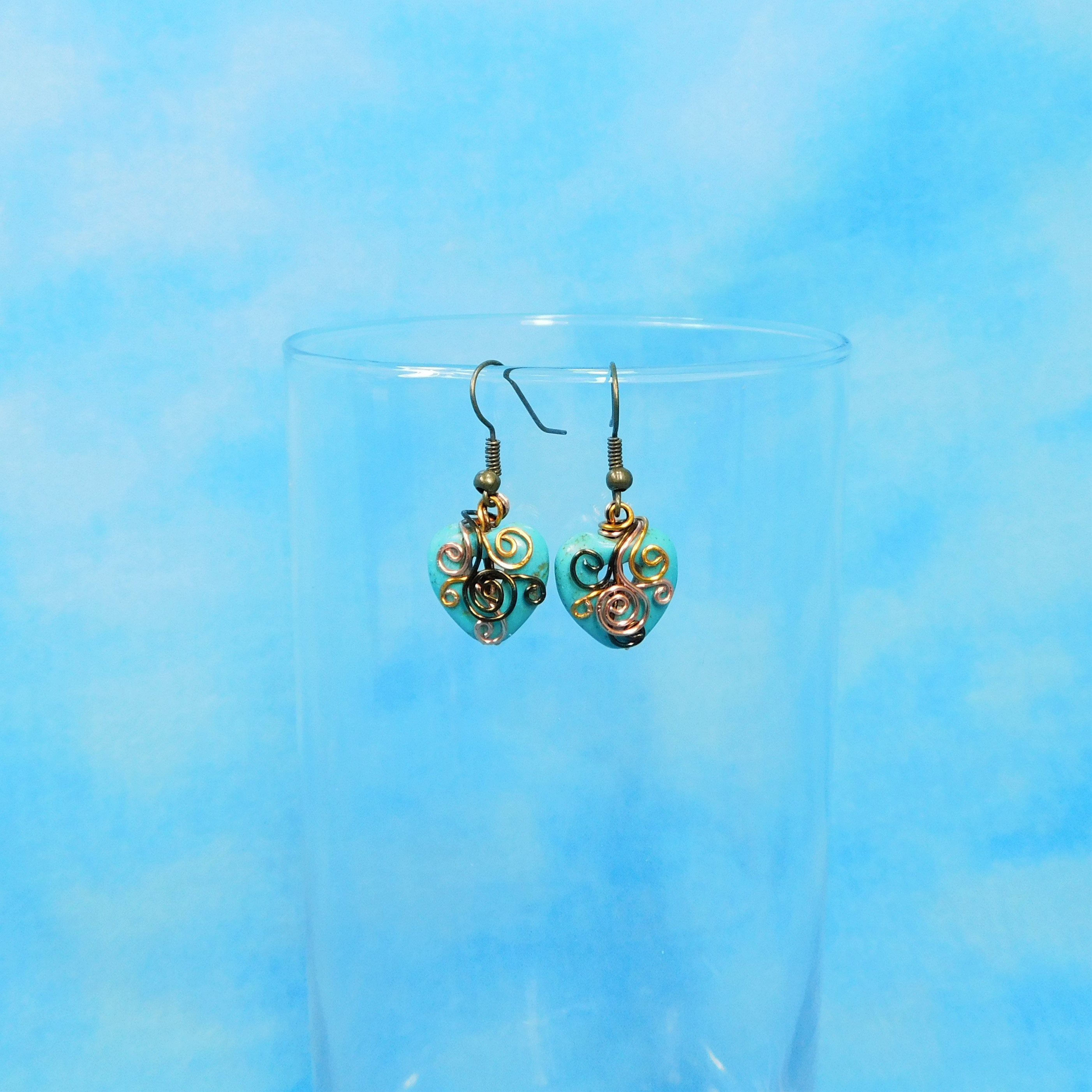 SHIPS FROM THE US! Three shades of non tarnish copper wire is hand wire wrapped and sculpted to embellish two heart shaped ceramic beads. The hearts are suspended from nickle-free copper ear wires, creating interesting and unique earrings. These handmade earrings are rustic but feminine, with classic appeal that will never go out of style. Each heart measures 1/2 inch in both directions.