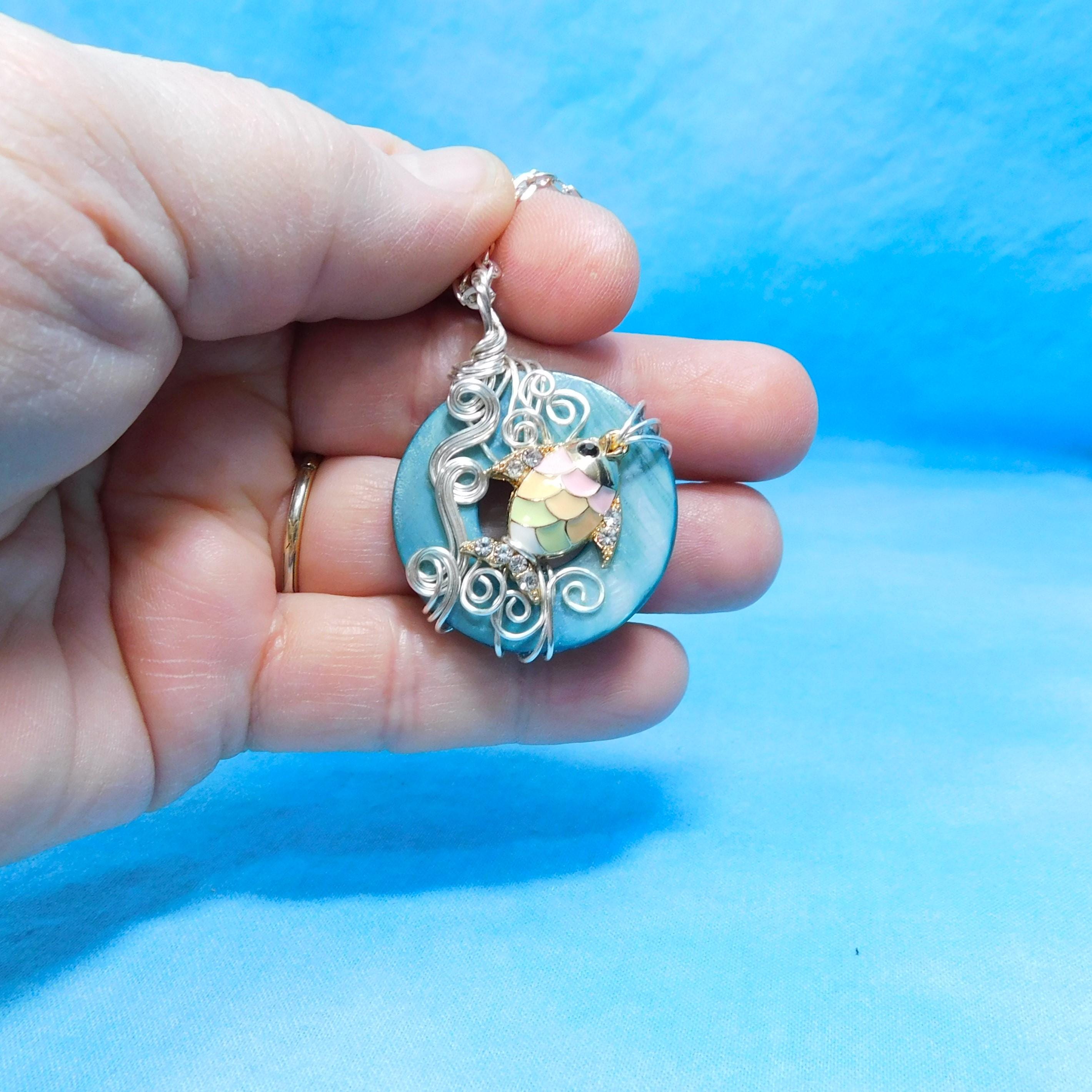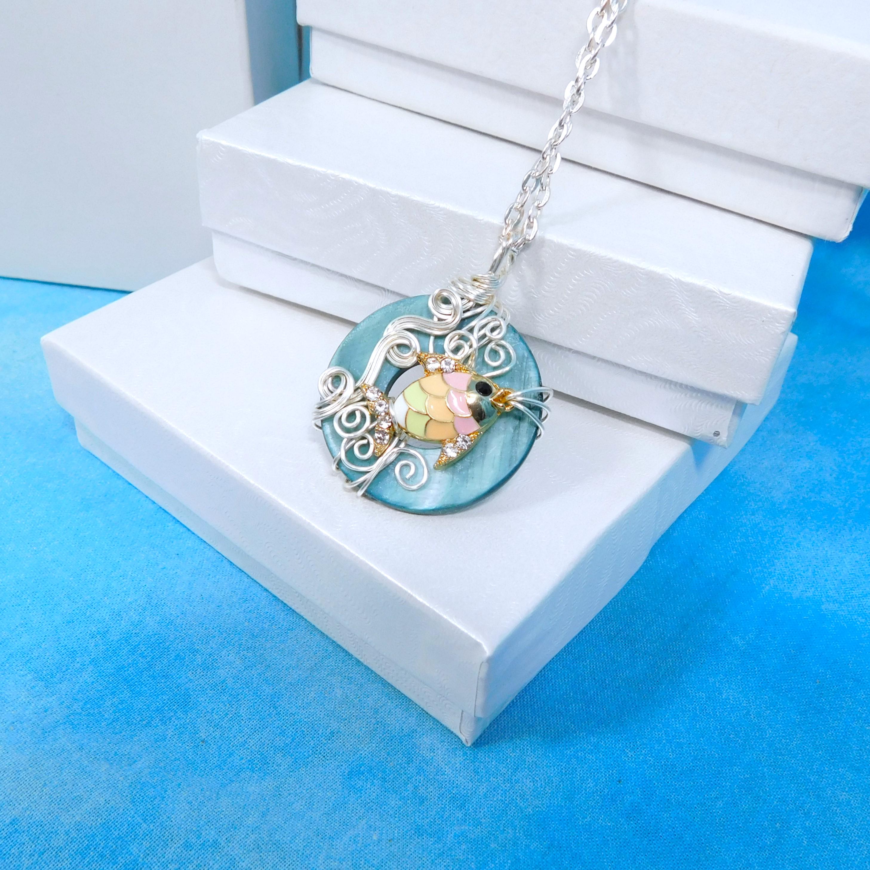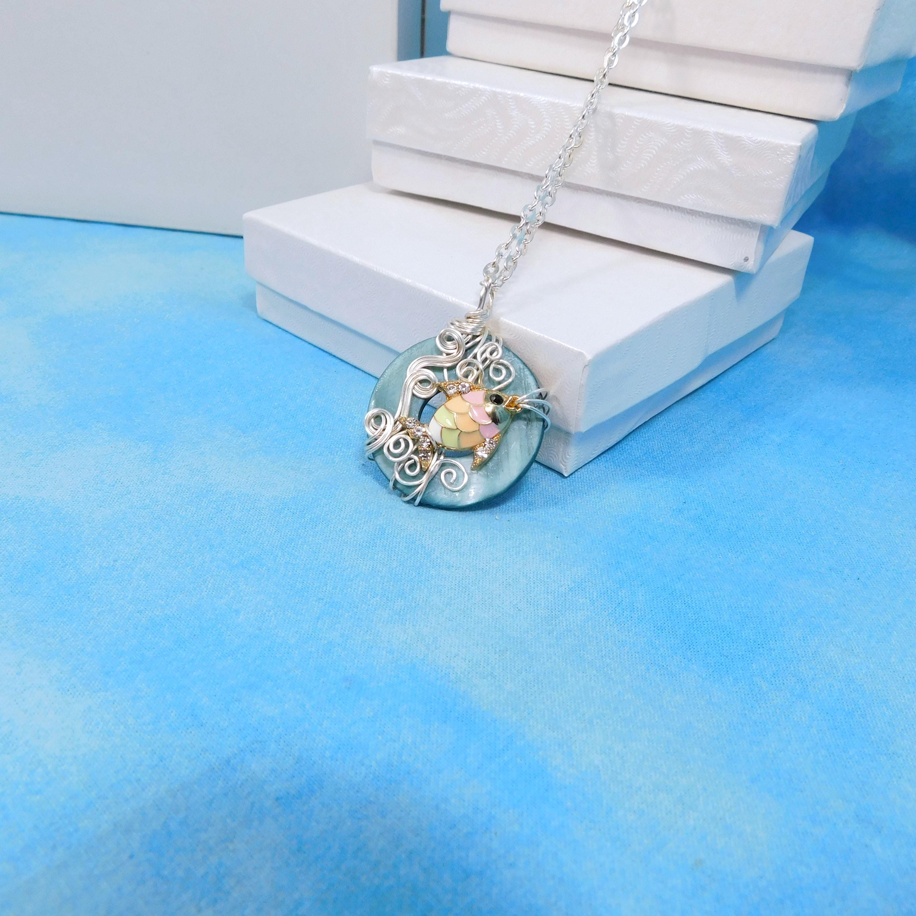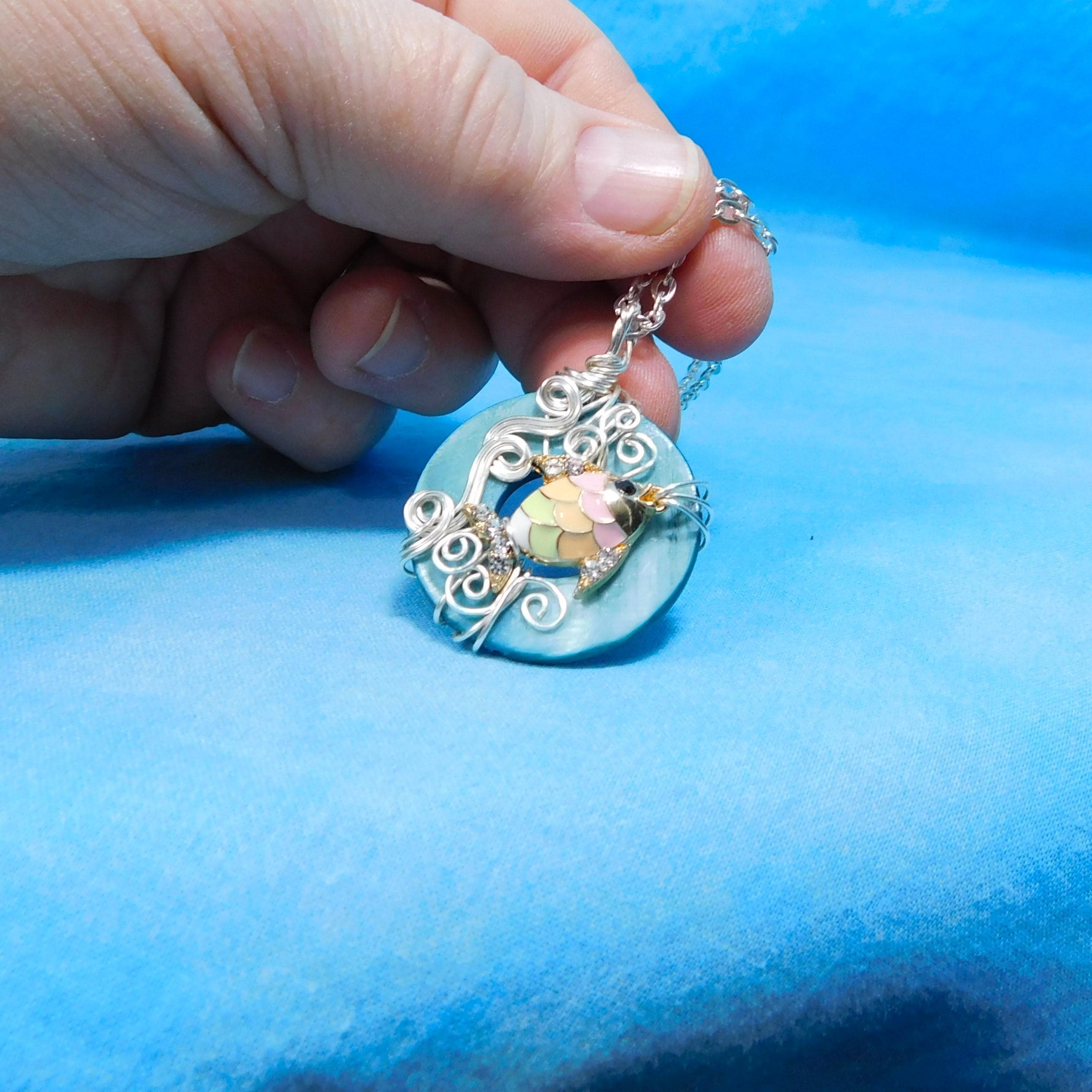 SHIPS FROM THE US! A blue mother of pearl shell is embellished with a pastel colored, enameled, rhinestone encrusted swimming fish and wire sculpted bubbles. It is an artistic pendant with a little bit of colorful whimsy . This artisan crafted pendant style necklace would brighten up any outfit, causing a splash wherever you go.