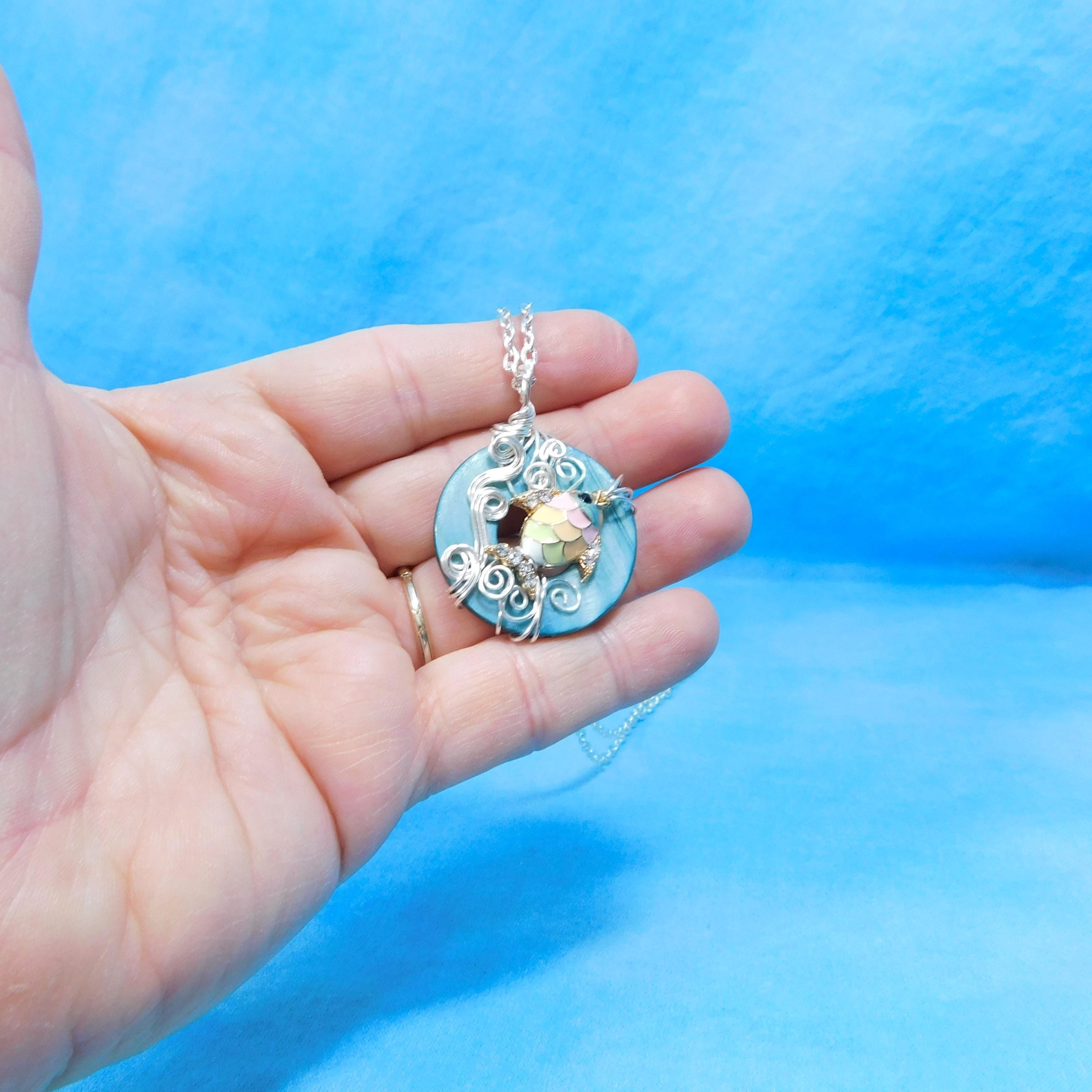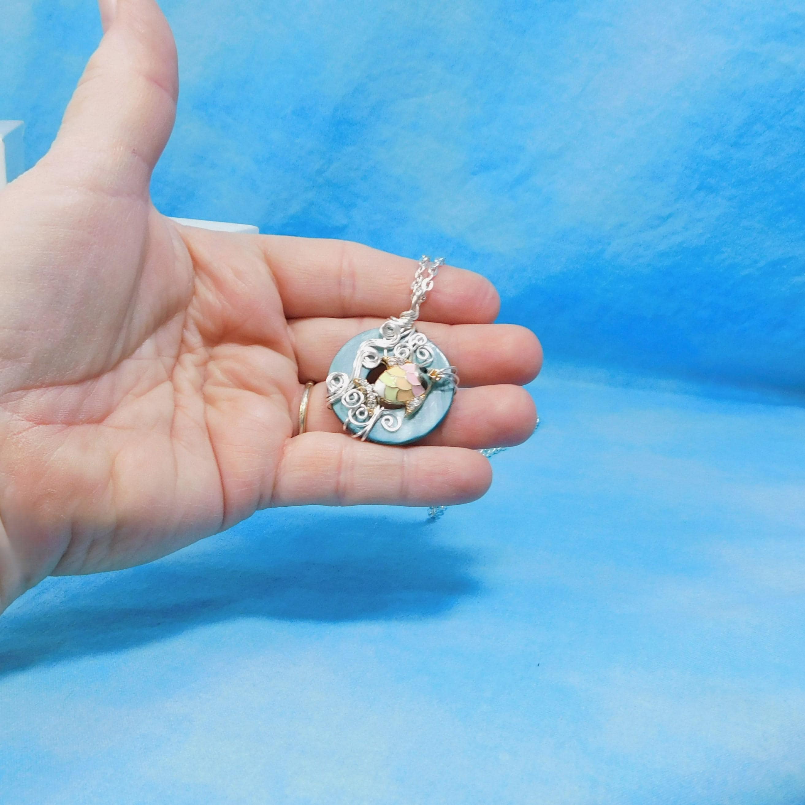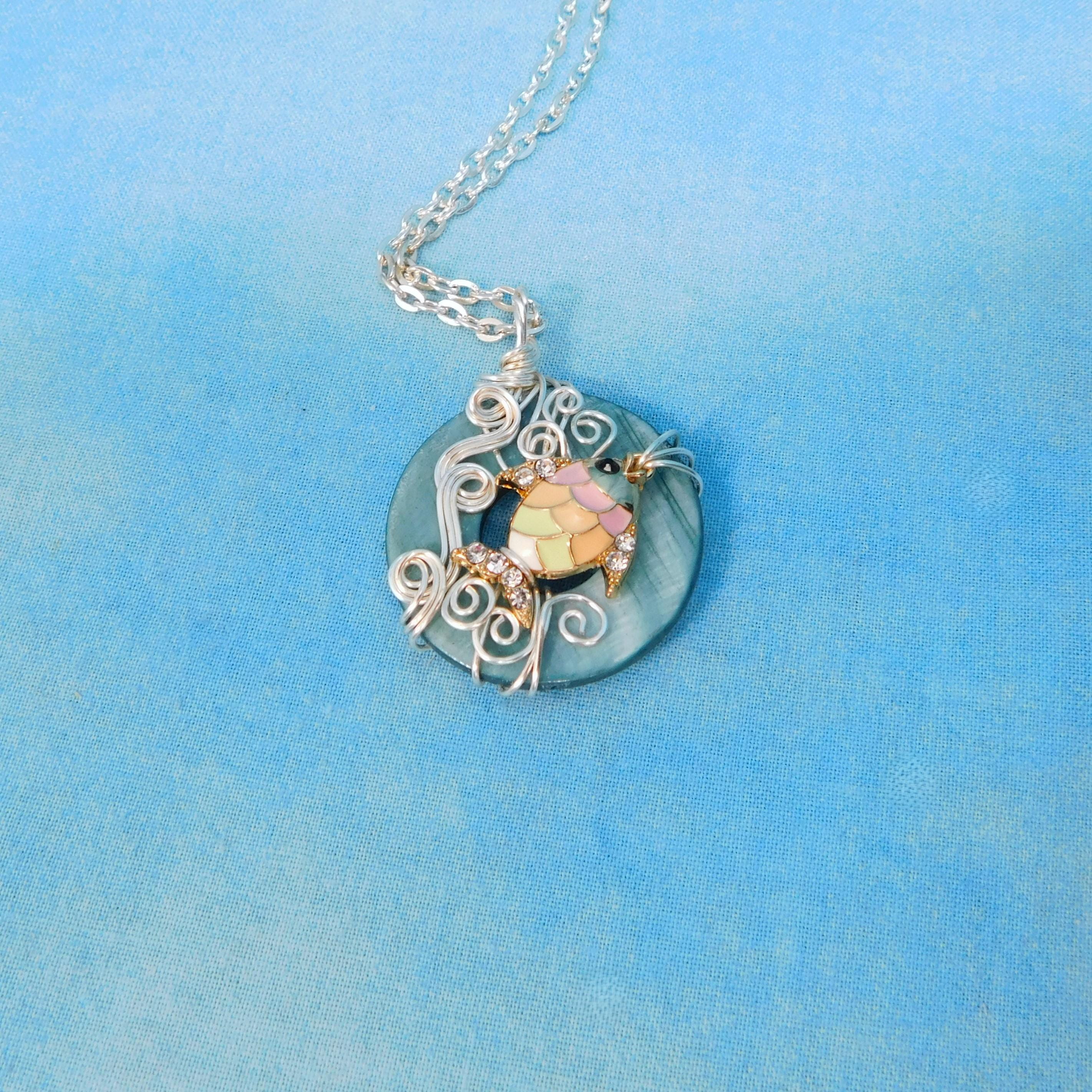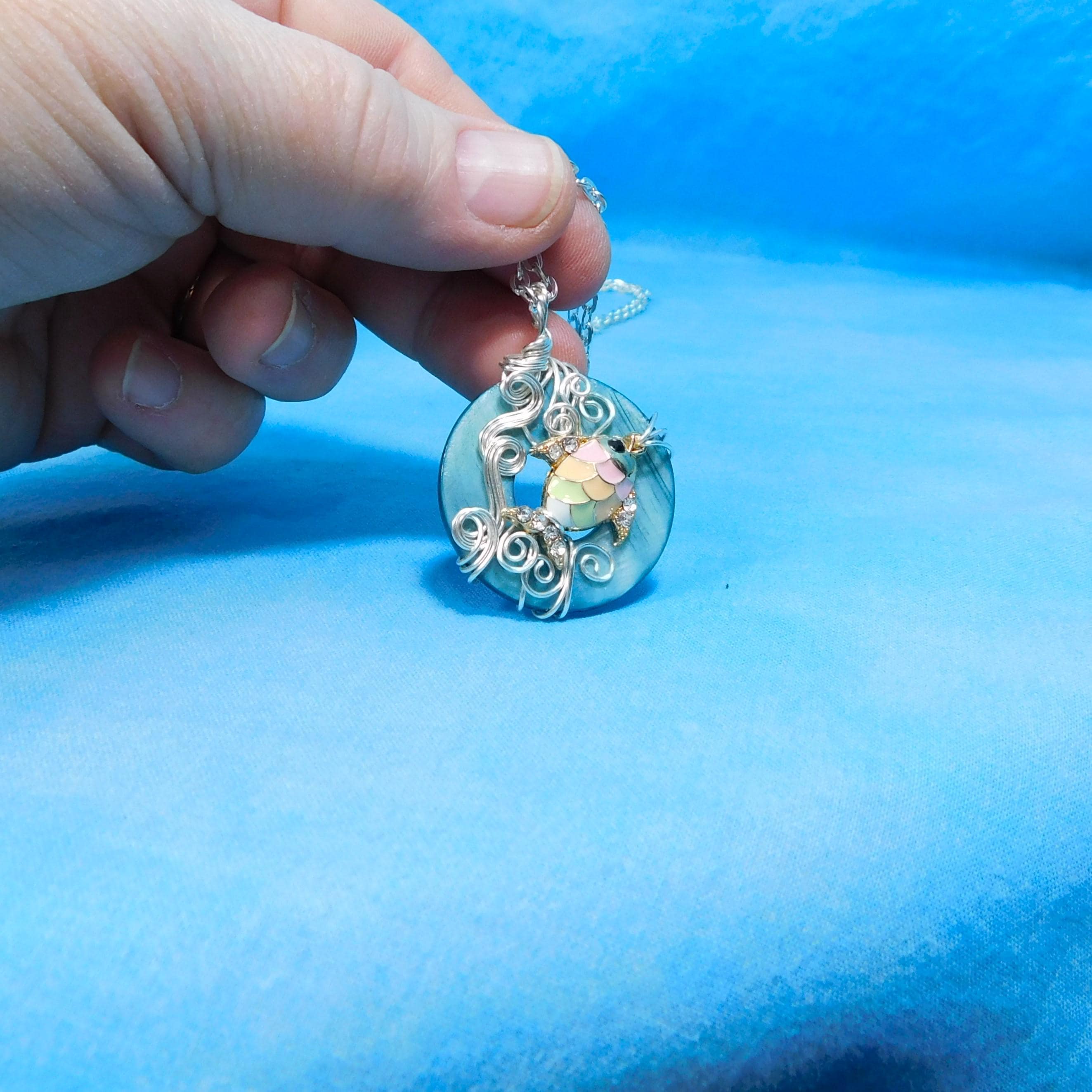 SHIPS FROM THE US! A blue mother of pearl shell is embellished with a pastel colored, enameled, rhinestone encrusted swimming fish and wire sculpted bubbles. It is an artistic pendant with a little bit of colorful whimsy . This artisan crafted pendant style necklace would brighten up any outfit, causing a splash wherever you go.