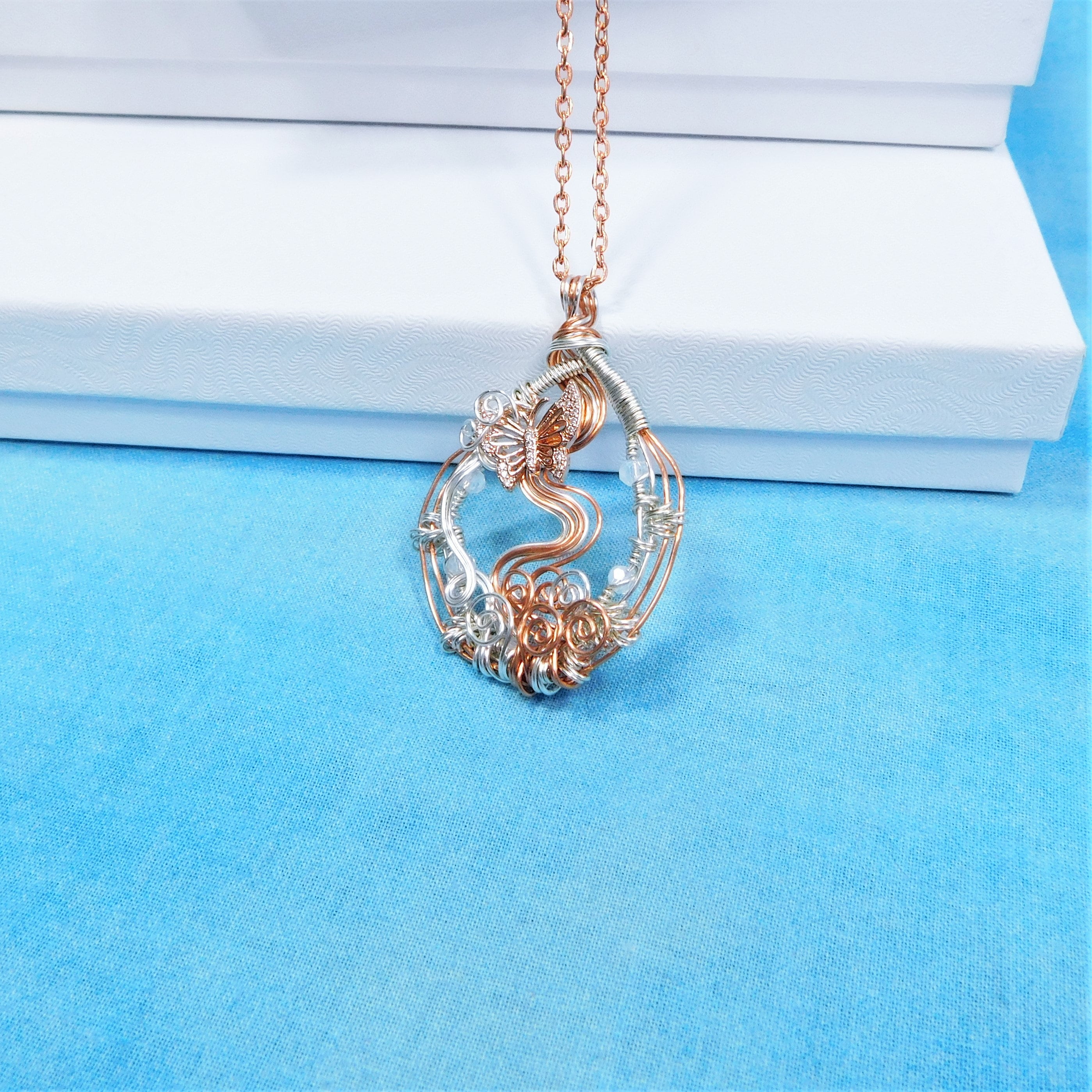 SHIPS FROM THE US! Rose gold colored and non tarnish fine silver over copper wire is meticulously woven and sculpted into pendant with a cubic zirconia encrusted rose gold colored butterfly accent. The butterfly floats within leaves and vines of sculpted wire, and the flashes of cubic zirconia shine through. The pendant measures 1 1/2 inches by 1 1/2 inch.