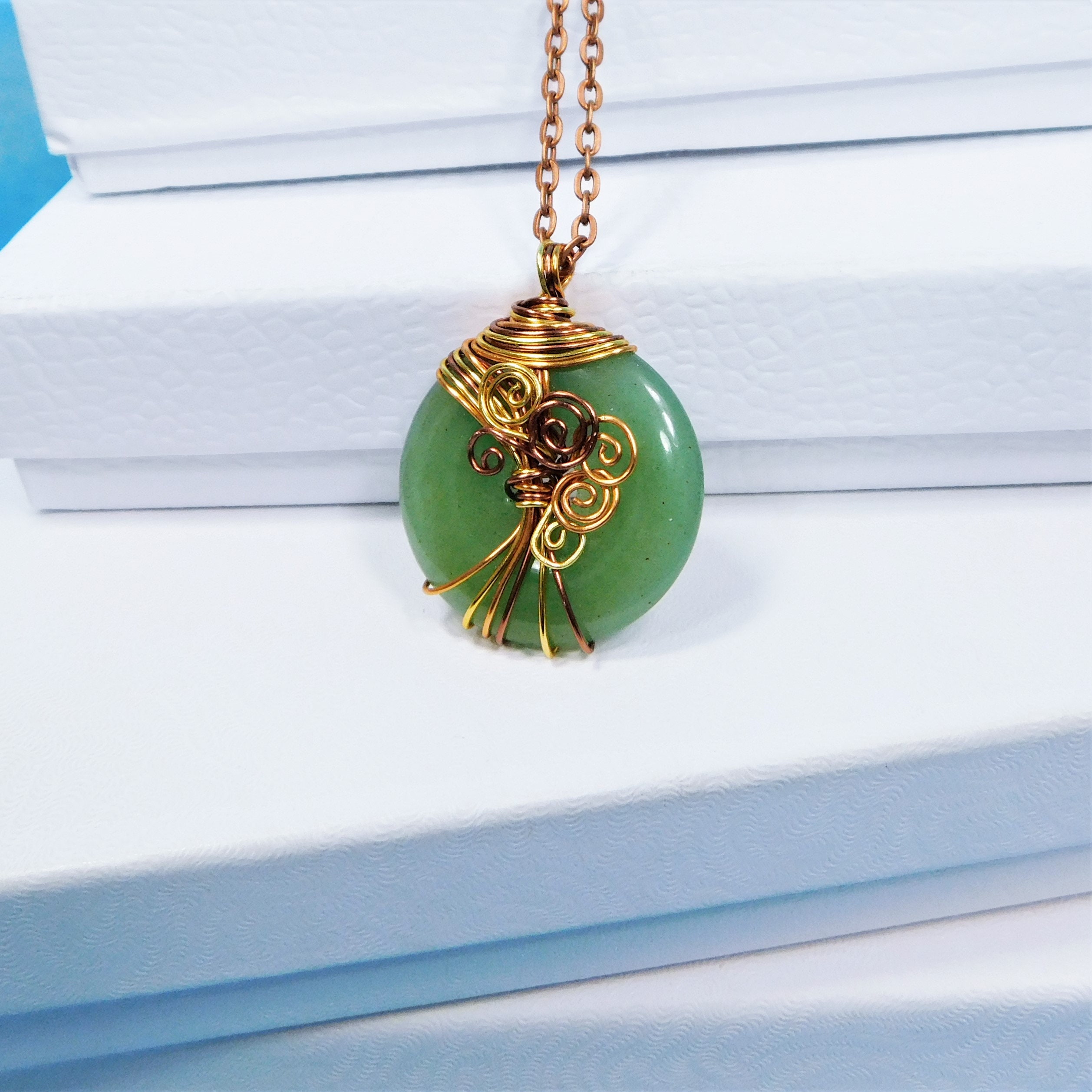 SHIPS FROM THE US! A large smooth carved green Aventurine donut is wrapped with three strands of non tarnish copper wire, creating an artistic 1 1/4 inch by 1 1/4 inch pendant style necklace. The beautiful green colored stone is complemented by three different shades of rustic copper wire.